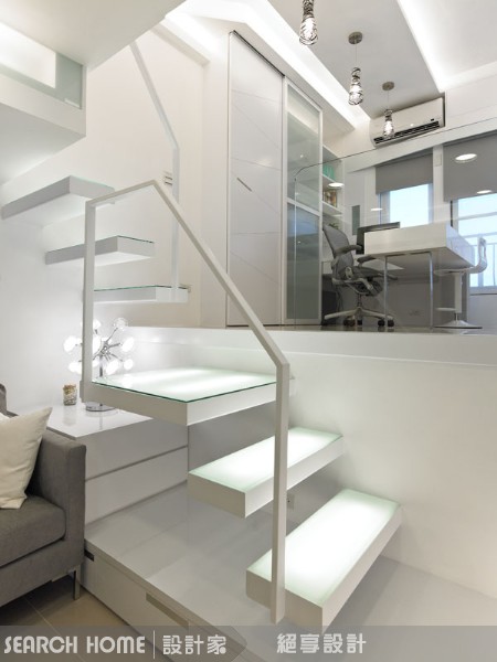 另外因為夾層通常高度較低,因此不能設計吸頂燈或是嵌燈,容易直接接觸頭部,會有碰撞或是太熱的危險,必須用其他方式安排燈光。關於夾層燈光,有別於嵌燈長時間使用,溫度會上升,用間接燈光或隱藏燈光,把光源打到牆壁或天花板上,透過牆壁或家具間接反射的光源,會更柔和且不具壓迫。也可將光源隱藏在家具背後,甚至在樓梯內裝燈,用來補充光線,也讓空間光線充足又柔和。