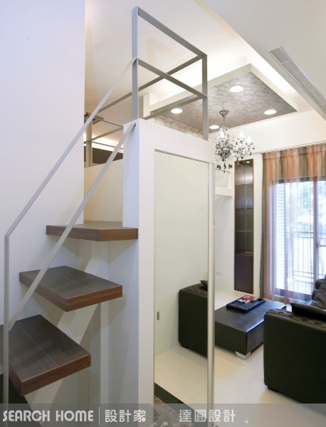 小坪數夾層用隔間感覺空間更小,如果使用者為單身,事實上沒有必要設計隔間,將夾層欄杆全用半層強化玻璃規劃,全透明的設計,空間展現無障礙的視覺延伸。