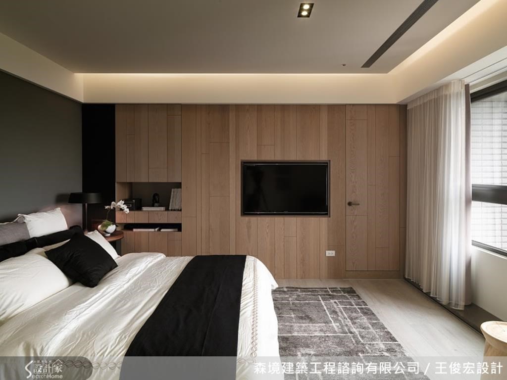 即便空间大,也要住得比例适中。这间房子分出四居室,每室却感觉狭窄,因此舍弃一室,扩容主卧,让生活起居更舒适。卫浴门片则选用和墙面相同的木皮,将卫浴、电视墙和收纳柜整合为一,形成完整的墙面视觉。