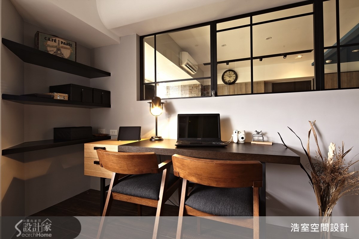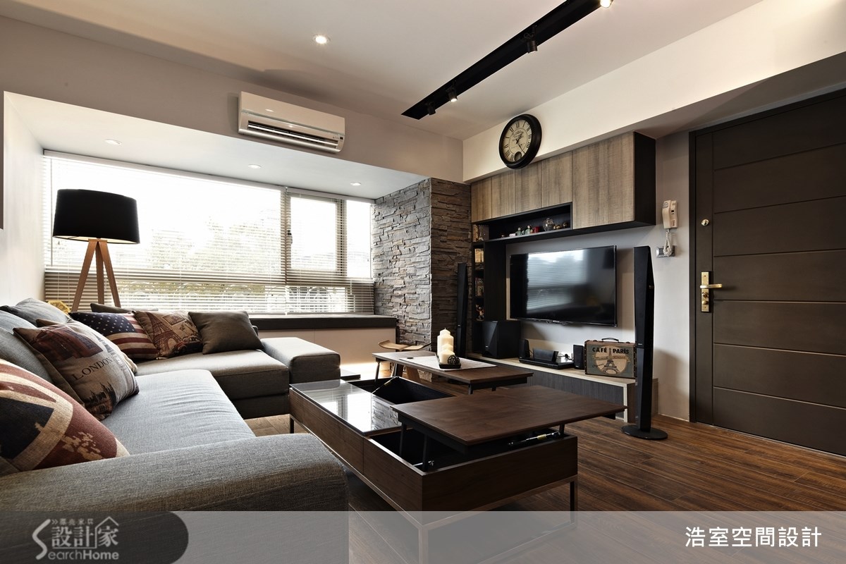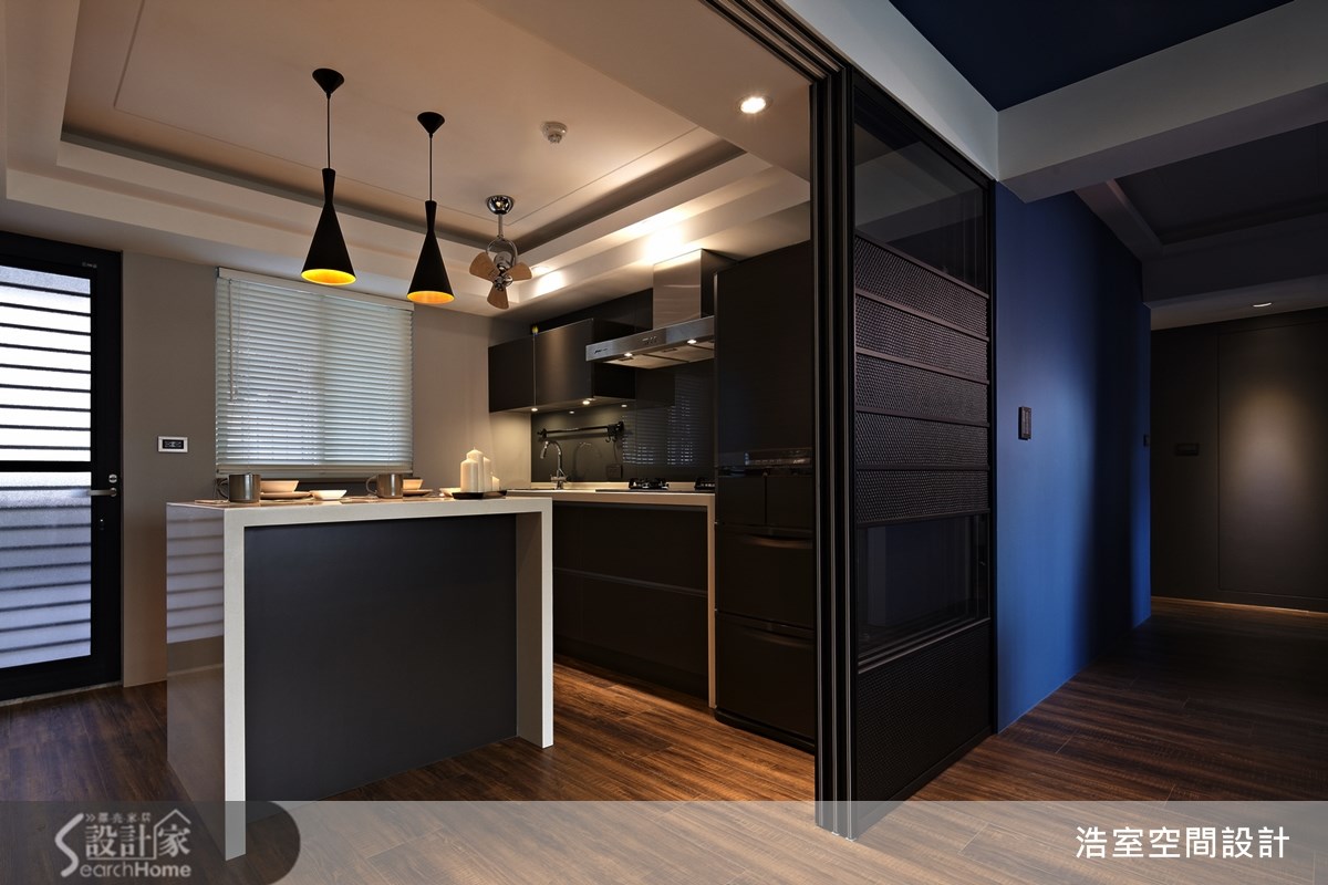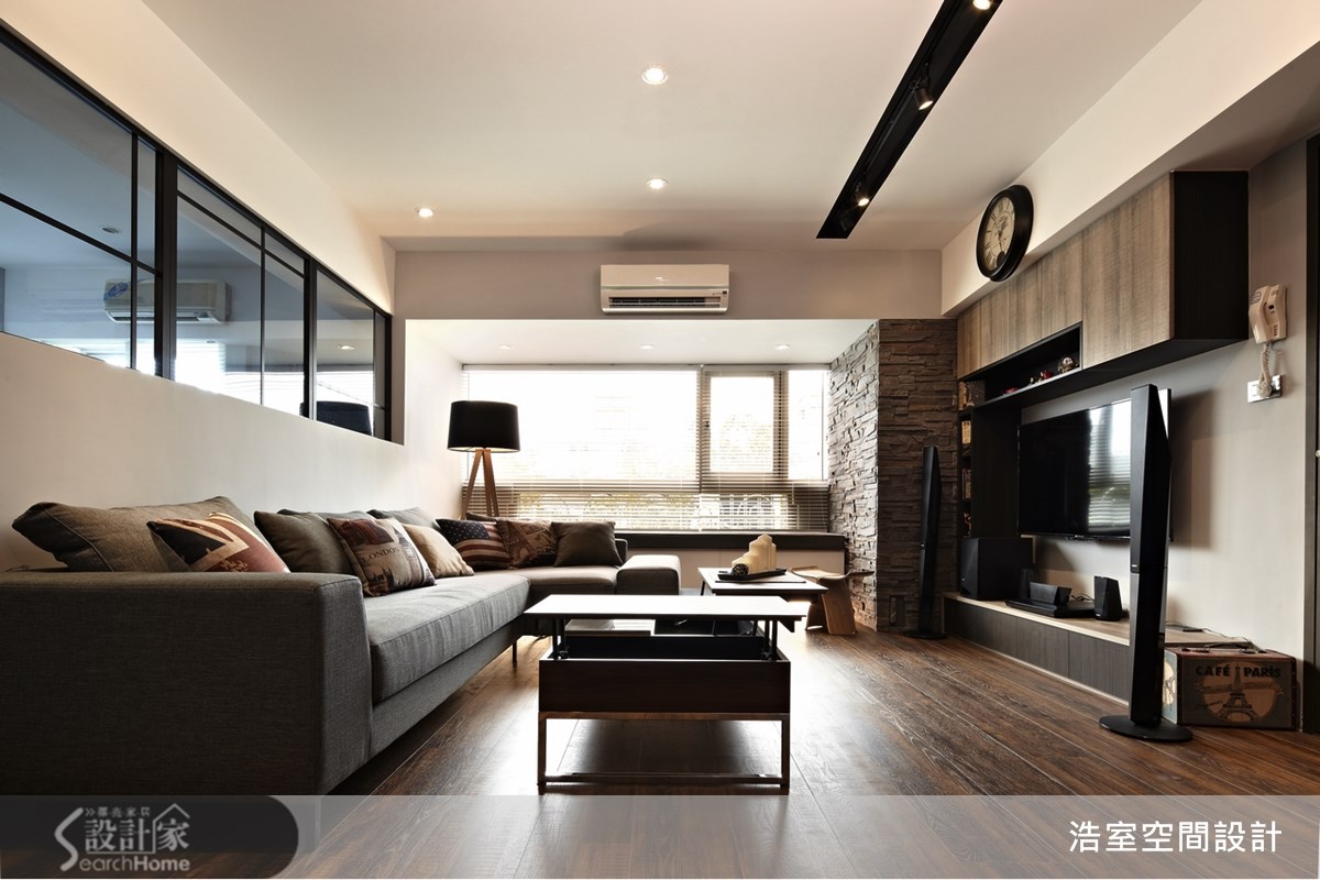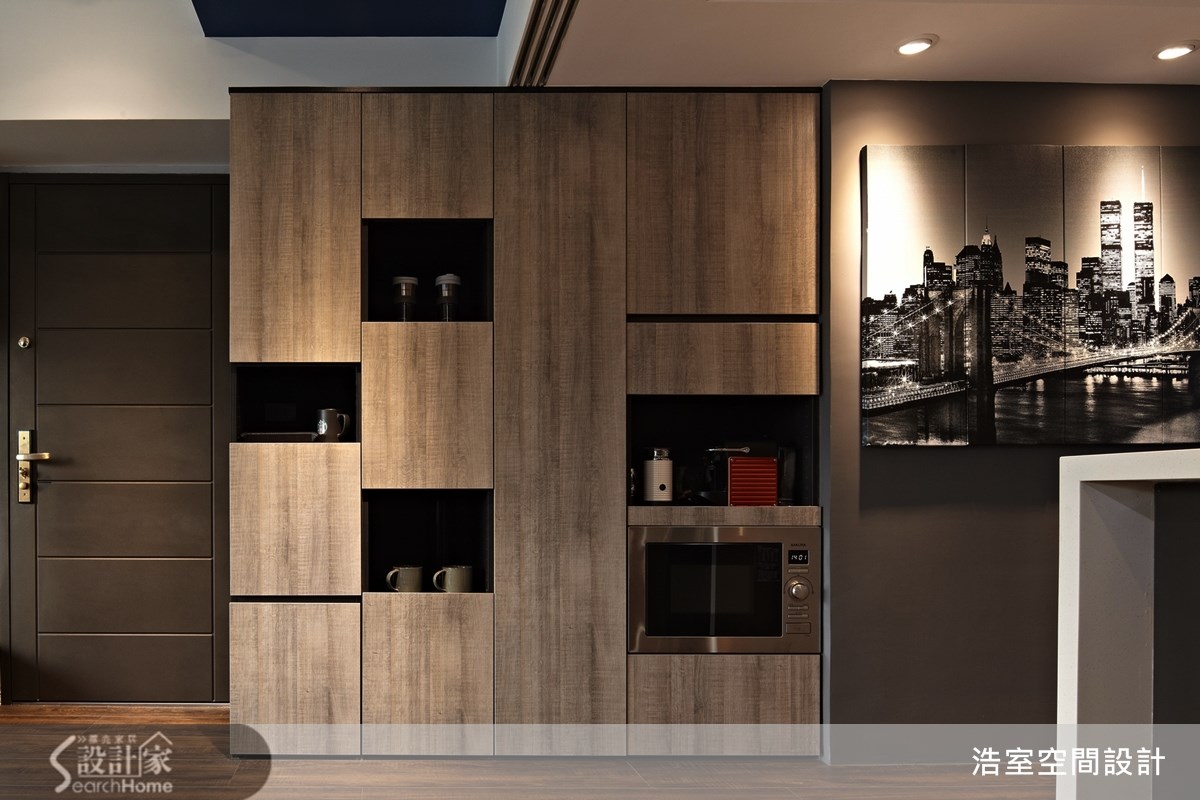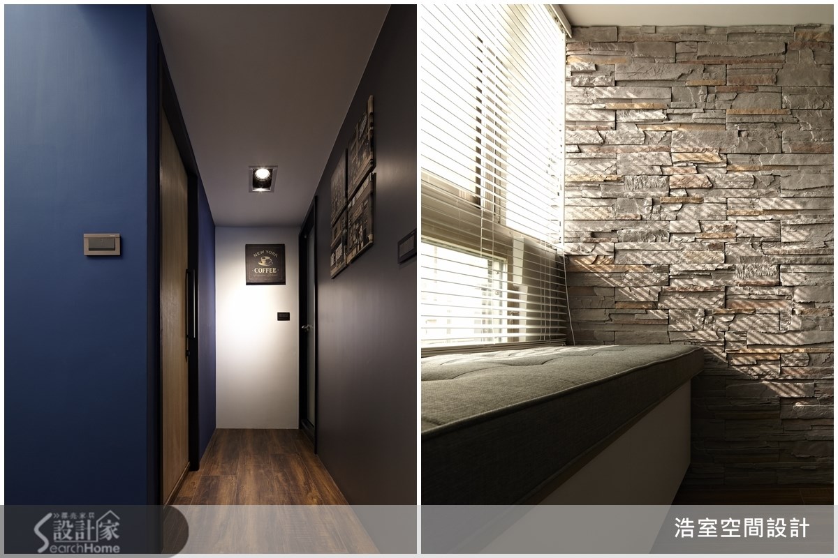 83平方米的老屋,设计师经由材质、色彩与线条感机能设计,让住宅大变身,成了如同纽约街角的咖啡馆空间,在这个家中,每一个角落都值得细细品尝。【聚焦文化石墙面,让家的风格更文艺】走进客厅,可见到和谐的咖啡色系空间,采用木质地坪与深色家具,营造出沉稳与随兴兼备的文艺气息,一旁休憩飘窗引入美好采光,在文化石墙面的呼应下,呈现出自然风味,并以铝件搭配清玻璃作为沙发背墙与书房的隔间,保有视觉光线的穿透感。餐厨运用玻璃拉门划分空间,并将电器嵌入壁面中,打造出兼具机能与美感的收纳展示墙;书房以圆弧线条包覆天花横梁,并在墙面配置大书墙与展示层架,打造出收纳满分的书香空间;卧房以百叶窗引入温暖的阳光,并注入淡雅紫与简约白色彩,打造舒适的卧眠空间。如海洋般的蔚蓝墙面,或大地色文化石壁面,都是居家中最醒目的色彩表现;尤其从公领域走进私领域时,可看见"New York Coffee"的墙面字样,并运用天花板的嵌灯照射,形成廊道尽头的宁静风景,深具文艺质感与意境。