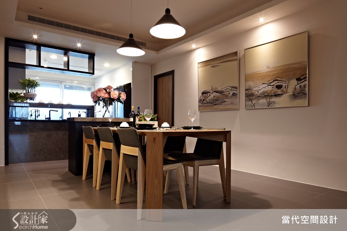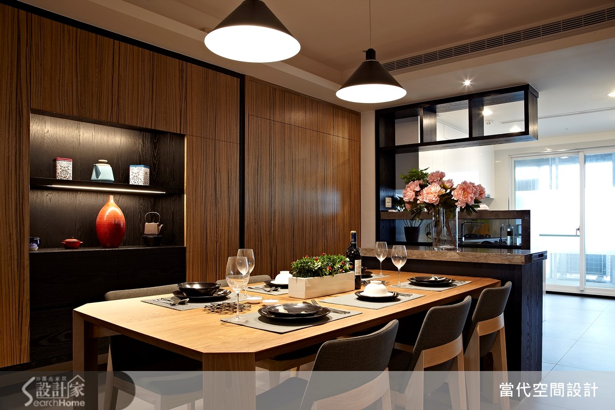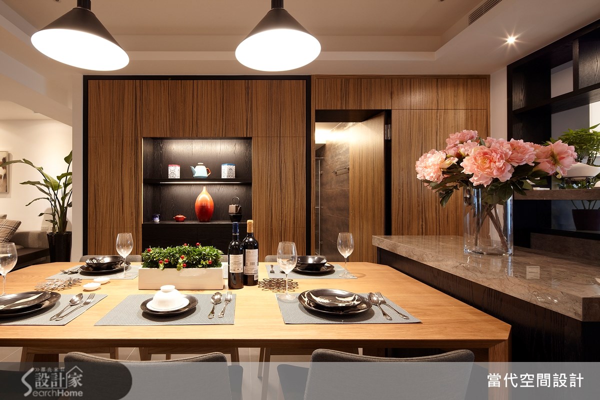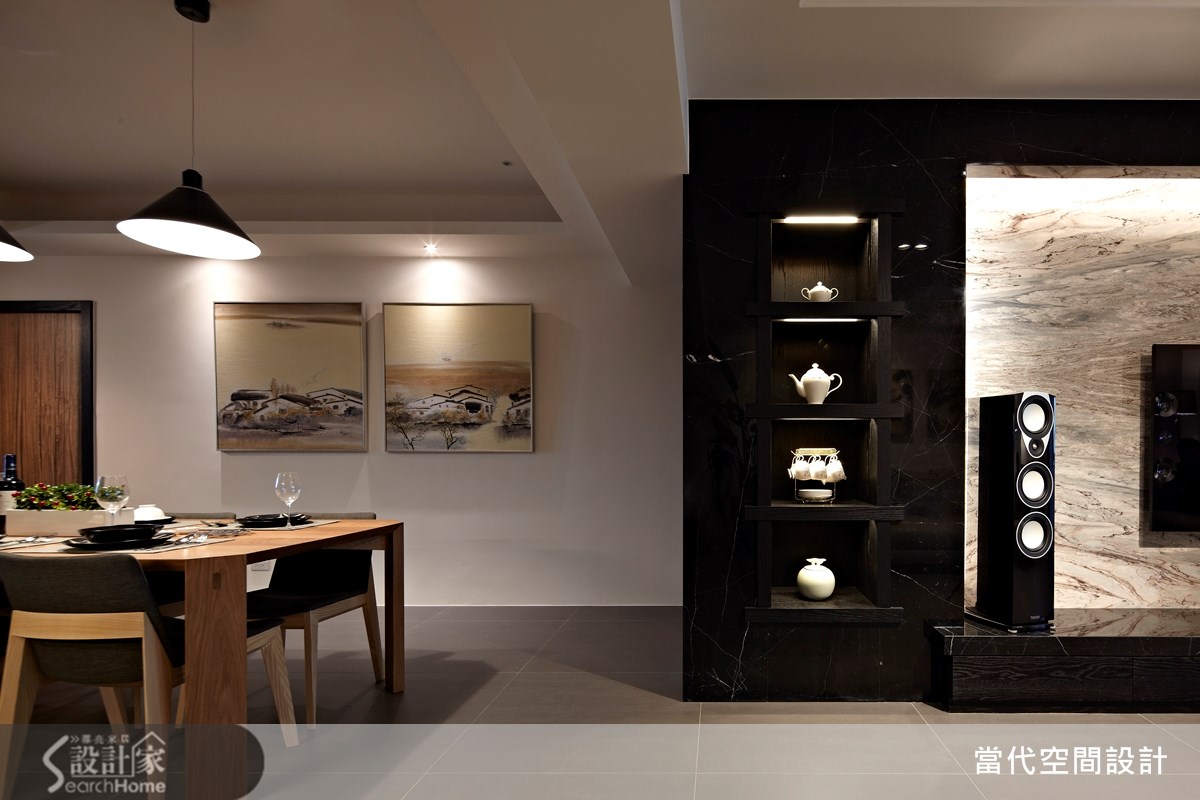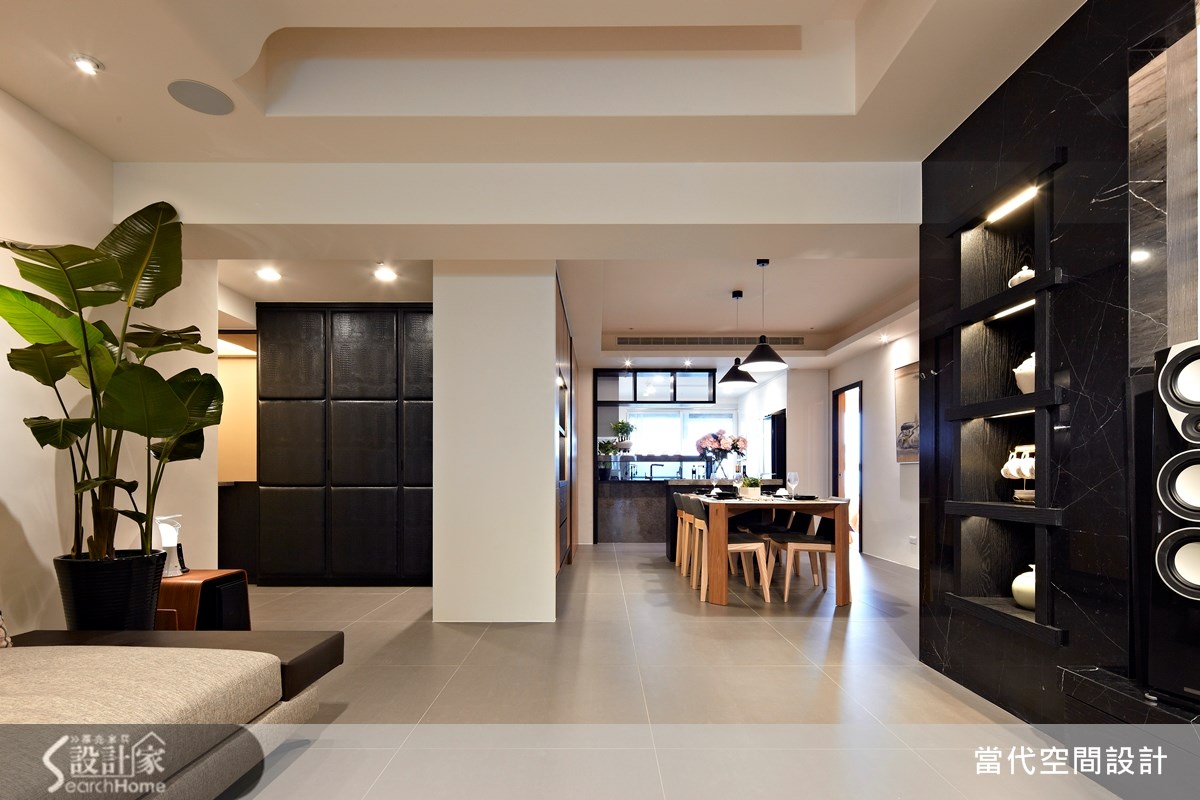 本案格局为4室1厅,看看设计师该如何运用设计美感与材质搭配,打造出兼具人文与艺术感的居住空间,让我们一起进入这个现代风屋宅瞧瞧吧! 【深色建材打造轻奢空间氛围】走进空间中,可见玄关采用黑色皮面质料,营造出开门见山的气势;客厅呈现简约现代的风韵,电视墙则以浅灰色石材带出天然原始的纹理,运用大尺度面宽展现大器感,一旁则配置亮面感的黑云石柜体,展示空间与灯光设计相得益彰,在稳重调性中散发着尊贵气息。【餐厅利用木质增添温暖感受】餐厅区域透过大面积木质墙面营造温暖感受,在木纹肌理中暗藏隐藏式门片,整齐立面上切割出内凹的展示空间,与间接光源互映成艺术感端景,并在餐厅空间里摆上粉红色的盛开盆花,柔化了空间中的刚硬线条。【穿透设计达到延伸扩容效果】在餐厅与厨房领域之间,则以餐边柜与吧台作为空间界定,运用穿透感的设计延伸空间视觉,让客厅、餐厅、厨房呈现无尽的贯穿感,并使户外暖阳能够引光入室,渲染至餐厅空间中,给全家人一个幸福的温暖飨宴。