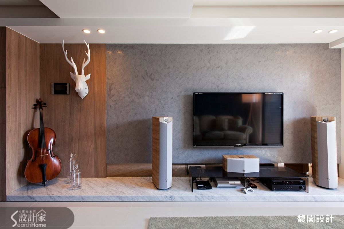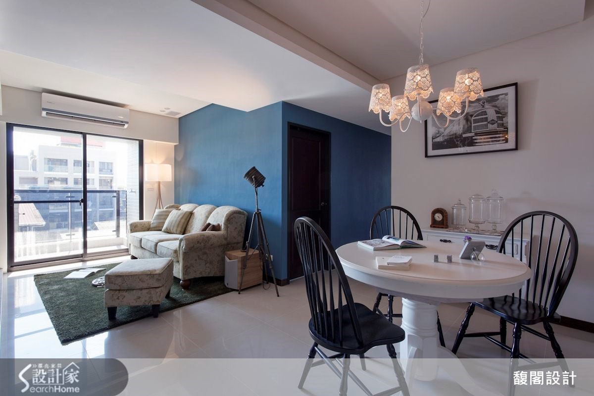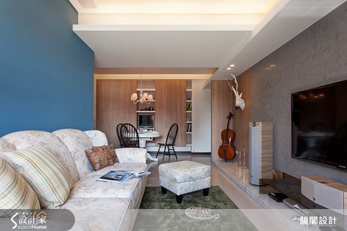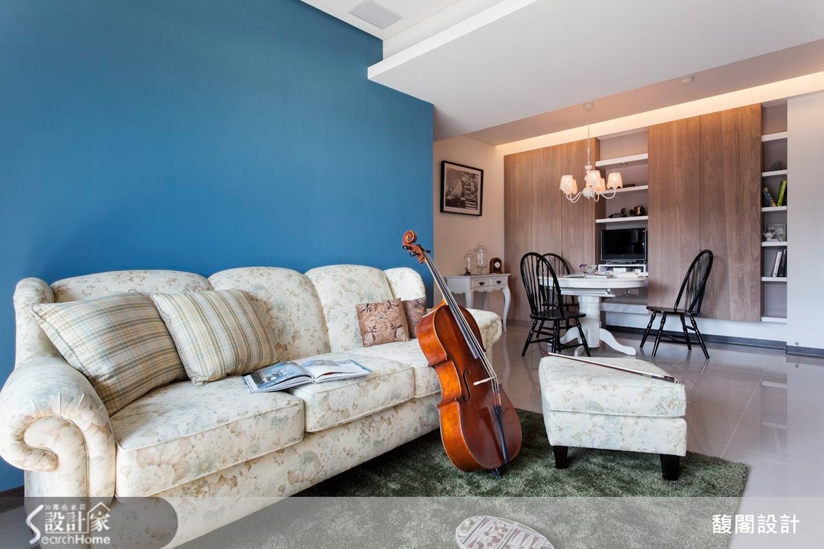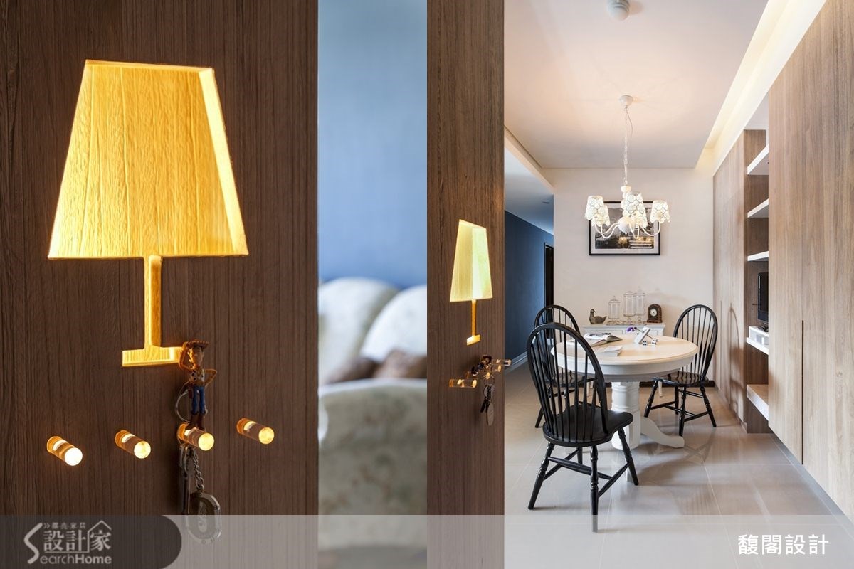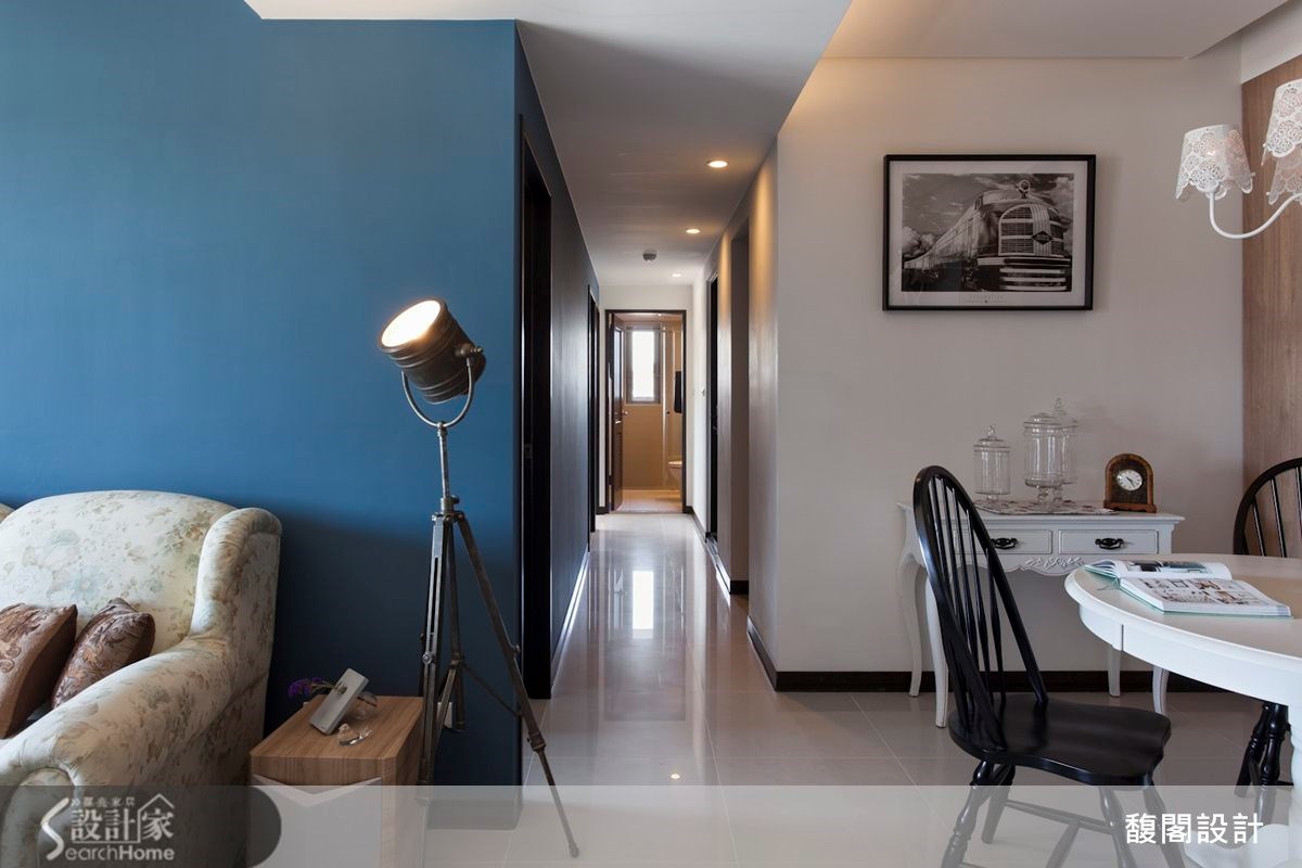 "家"在各种时期扮演着不同的角色,无论是成长房、新婚房、二代宅等,每种角色都有不同空间灵魂与个性。此次案例是母亲送给两个儿子的成年礼,希望可以让孩子们培养独立的精神,亦做为未来大儿子成家的居所。 【湛蓝墙色统合风格,凸显利落】设计风格以大儿子喜欢的现代感,加上小儿子喜欢的英式古典为主,但布置时加入母亲所希望的乡村风家具。设计师透过调整沙发背墙色彩手法进行风格整合,以满足三个人的需求。 玄关处壁面刻划台灯造型,并内嵌光源及设置钥匙座增添设计趣味。开放式的客厅与餐厅保留了宽阔的空间感,并藉落地窗引入大量采光增添明亮。湛蓝的沙发背墙搭配温润的乡村风家具,调和出舒适却不过分柔美的空间气质。电视墙使用马来漆、大理石及木皮相互结合,并设置了乐器的摆设空间,让客厅也能变身音乐演奏厅。餐厅以质朴的柜体增加收纳机能,白桌黑椅也可充当工作区,让书房概念巧妙地与公共空间结合。起居空间依使用者的喜好规划打造,大儿子卧房利用大量留白搭配木作,藉由光影丰富简约设计层次;小儿子房则特地选择典雅墙纸搭配沉稳的床组、家具,营造英式古典的优雅。