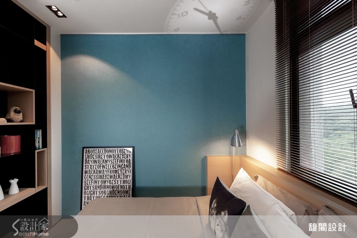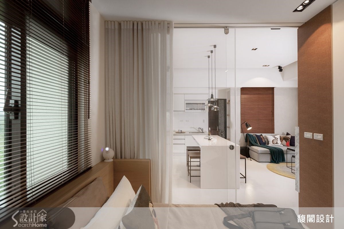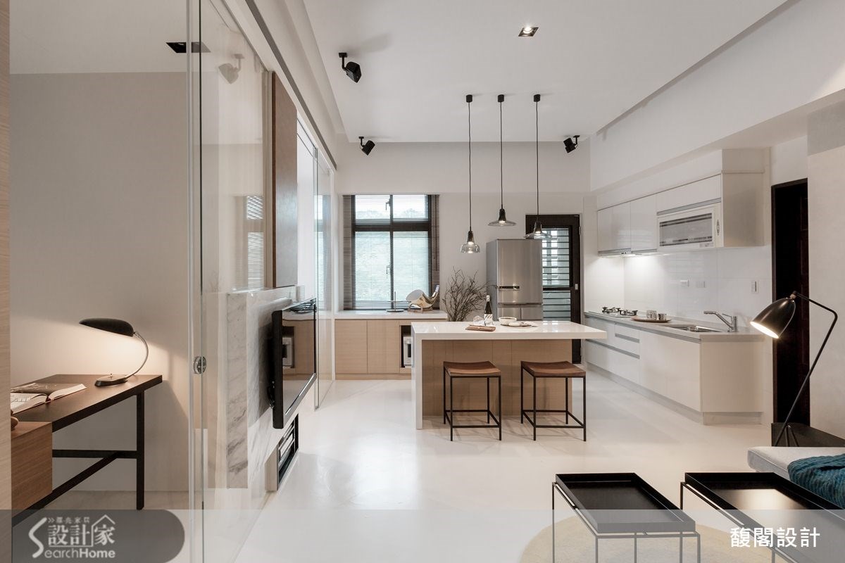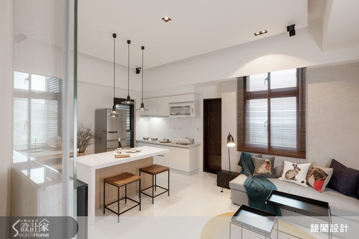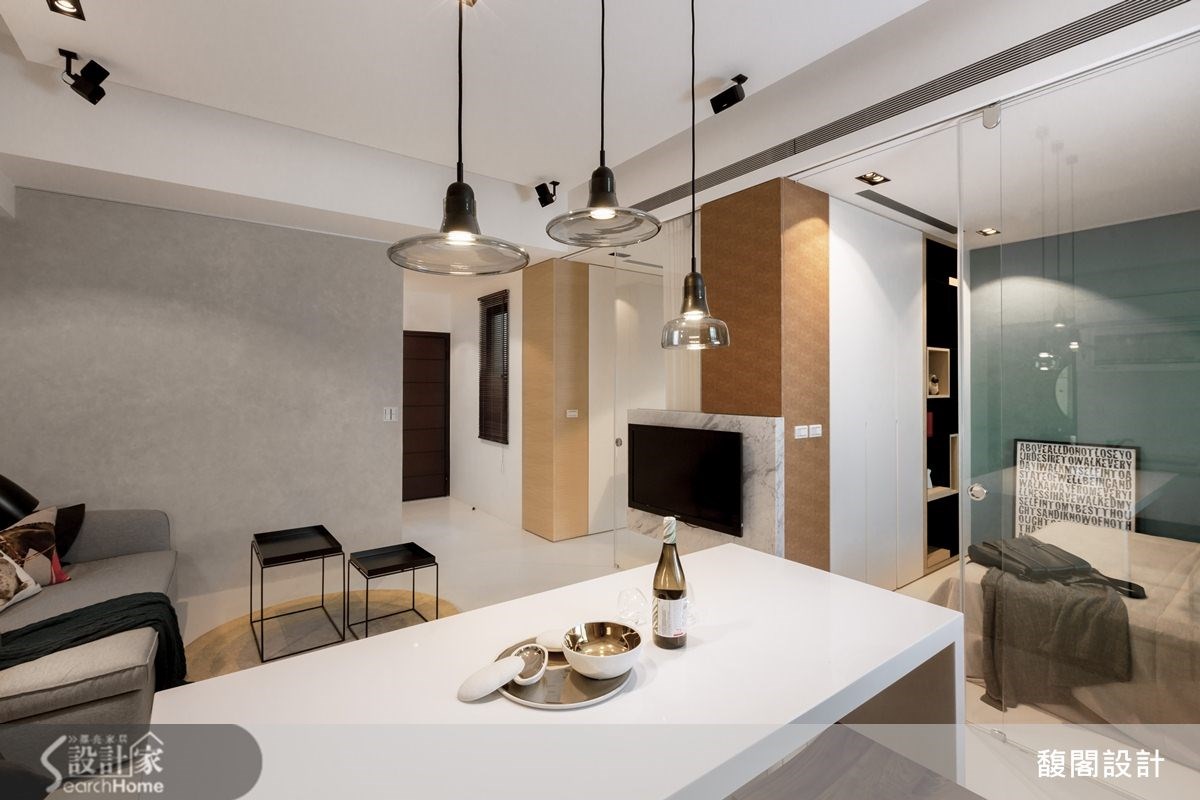 案例是一间约40平方米的挑高小户型,原来的格局配置将风景与采光遮蔽。因此,设计师以简约风格为主,利用异材质的搭配,创造出具质感及变化的纾压空间! 【舍赘墙,善用隔断规划收纳】设计师将格局重新规划,除了将隔断作为收纳区域,亦将不必要的墙面拆除,让光线能穿透而引绿景入室,打造出宽敞的生活空间。客厅中悬空的电视墙,以卡拉拉白大理石佐上皮革门板为建材,增添内敛华丽气息。靠窗且方正格局的厨房以纯白为主色,并透过吧台整合餐厨机能,型塑出清爽环境。三盏造型吊灯藉垂坠线条调动视觉,亦凸显了空间高度优势。因独居缘故,卧室使用清透玻璃隔断;不仅界定空间机能,也让人一进家门就能看见湖水蓝墙色,增添视觉趣味。