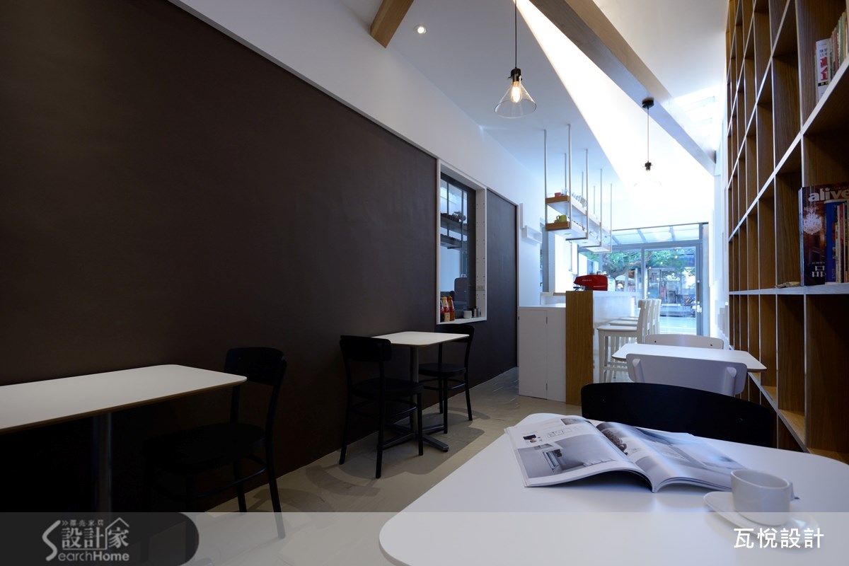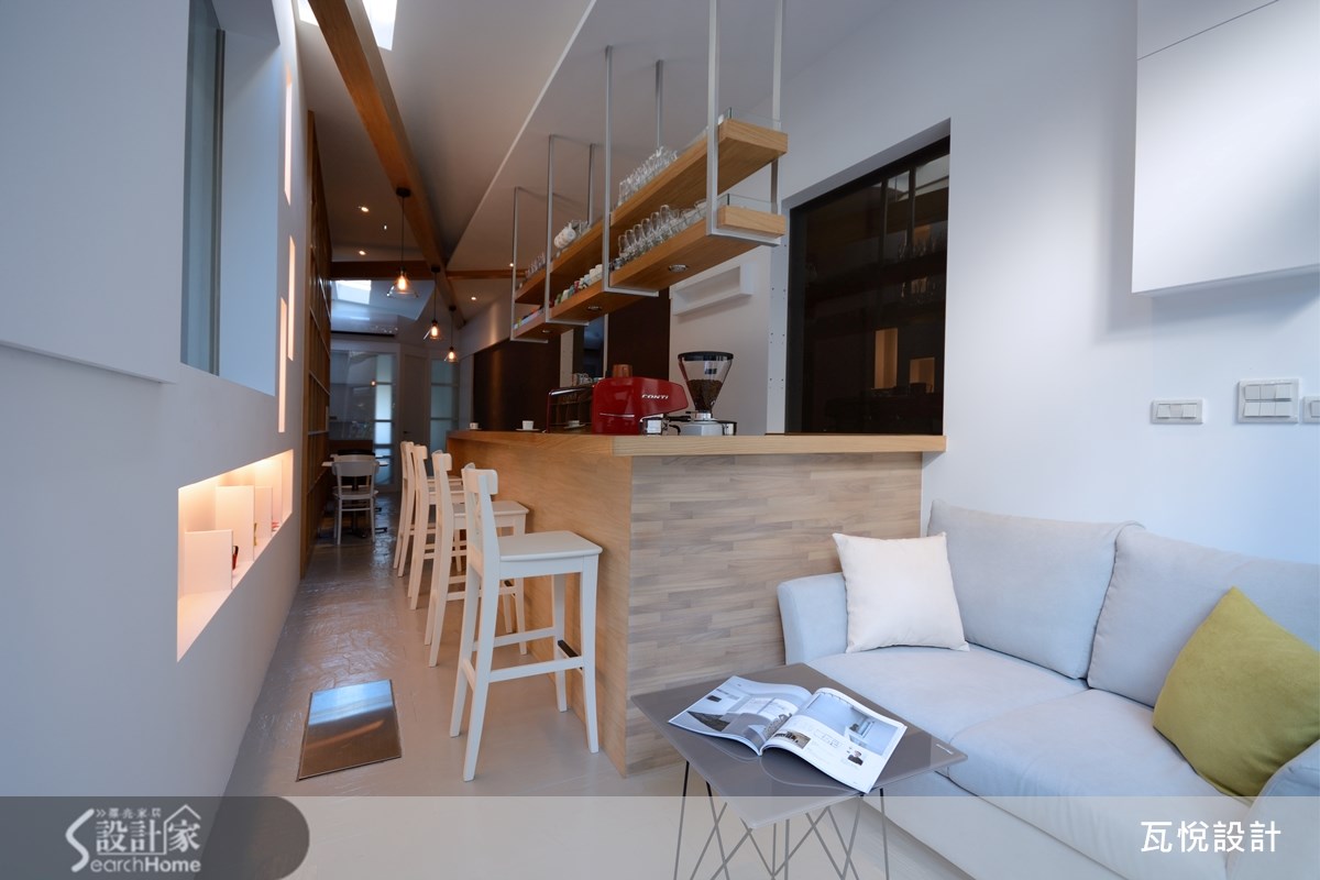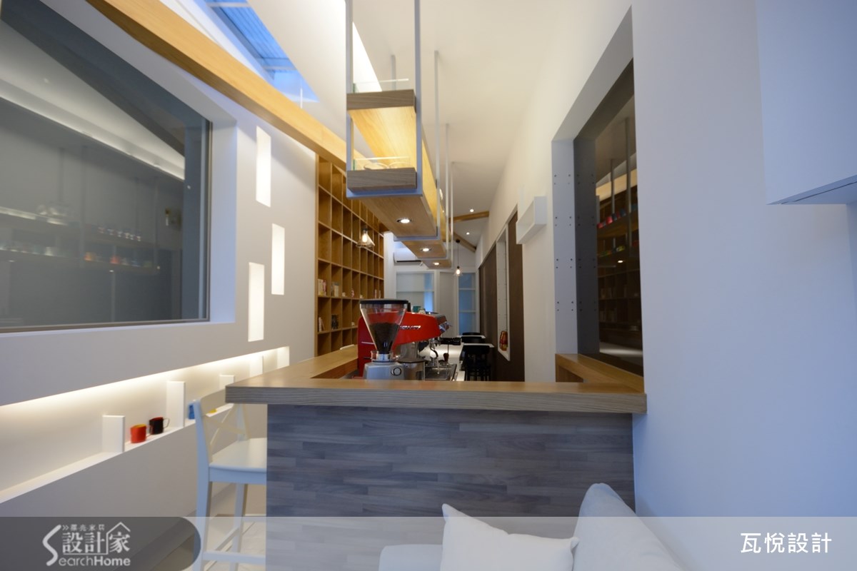 仅有33平方米的二手房,且先天格局属于长型屋,更形狭窄拥挤。而从英国回来的屋主喜欢咖啡,想要实现经营咖啡厅的梦想基地。因此,如何让小空间发挥高效益,且营造舒适清爽的咖啡厅氛围,就成为本案装修的重点任务。 【采光柔和明亮,营造视觉层次】为了改善屋案狭长阴暗的缺点,从采光安排与视觉层次两大方面着手。让人原本浮躁的心情,在走进咖啡馆之后逐渐得到安顿与沉淀,在明亮温暖的自然光与咖啡香气中,找到对生活的感动。 原屋案的天花板全以玻璃材质打造,虽能导入自然光,但也造成室内温度太高。为兼顾舒适温度与明亮感,保留两侧的玻璃天花板设计,并于天花板及墙面镂空处安排充足的灯光,且以整面清玻璃打造入口,让空间显得明亮清爽。 在视觉层次的经营上,设计师以墙面设计与柜体安排的交错聚焦。让人走进空间时不会直接注视空间底部,而是随着装饰灯墙、吧台、木质感书墙的交错配置,让视线逐步推移。接着再呼应深咖啡色墙面,塑造悠闲美好的氛围。