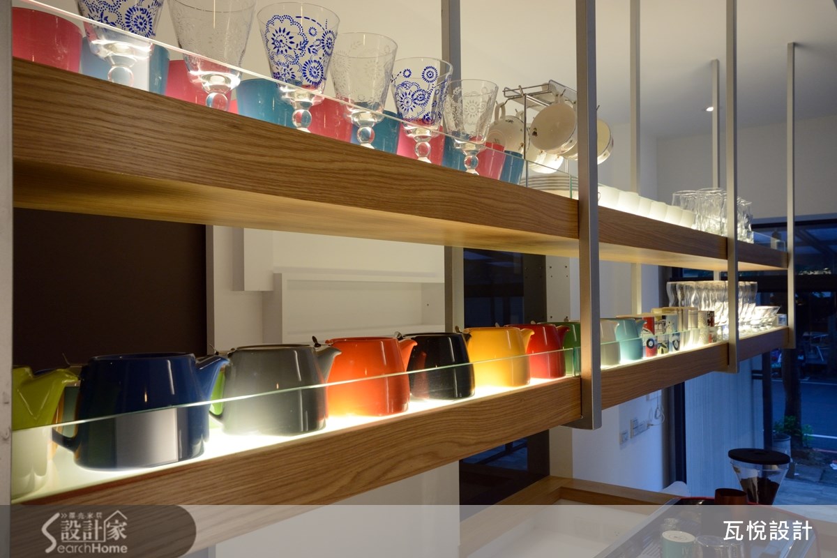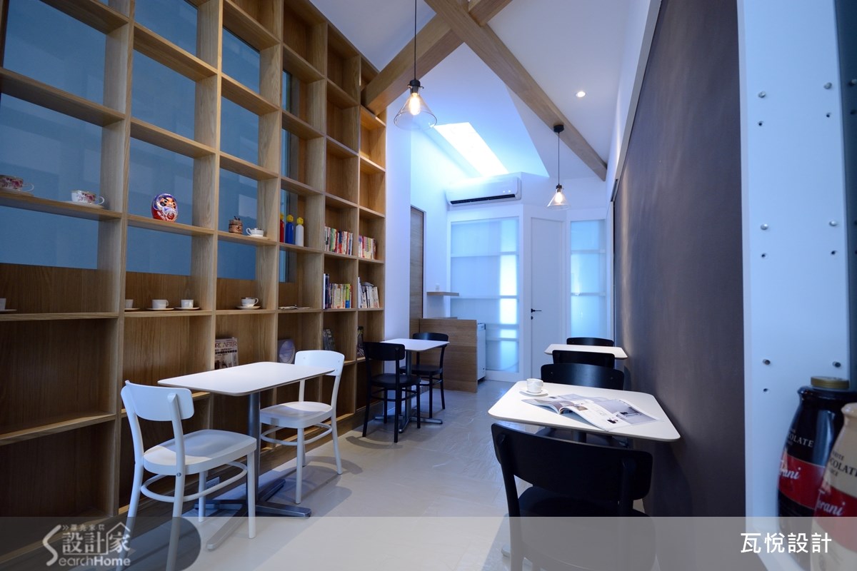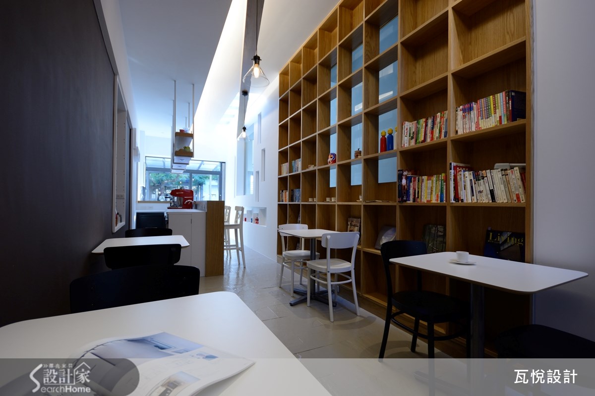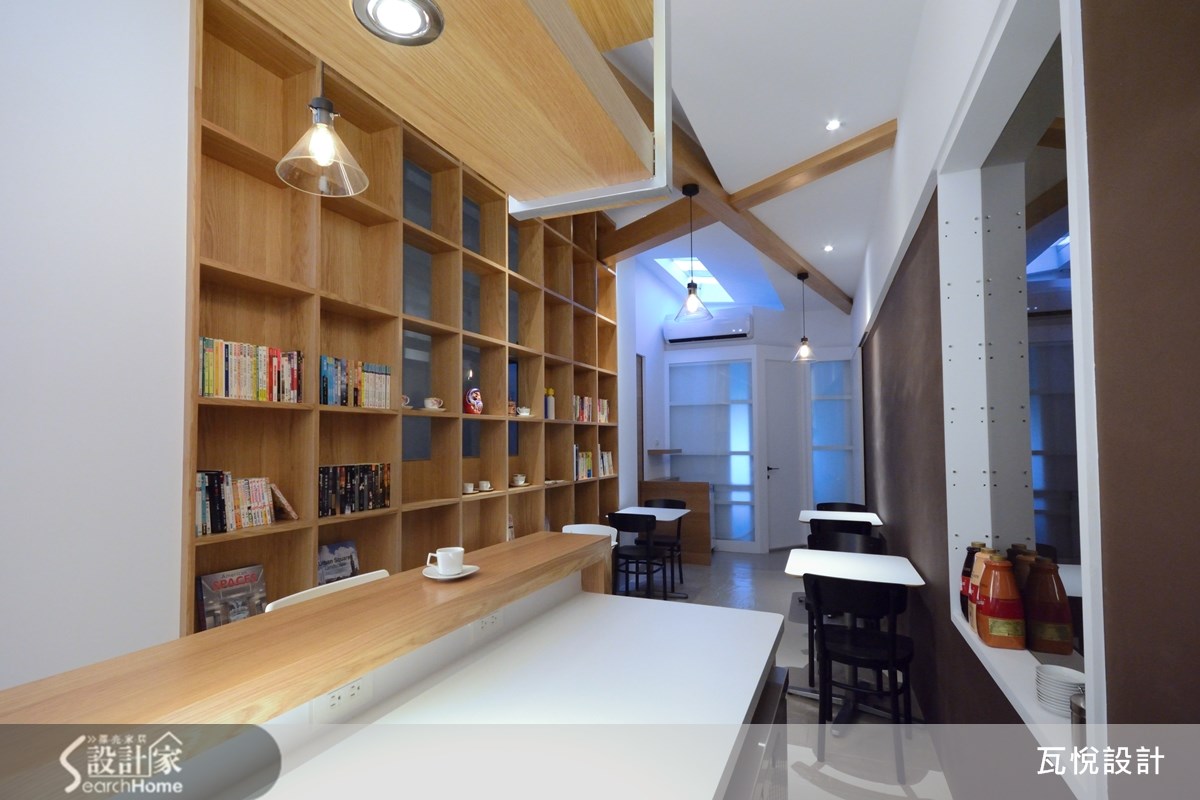 仅有33平方米的二手房,且先天格局属于长型屋,更形狭窄拥挤。而从英国回来的屋主喜欢咖啡,想要实现经营咖啡厅的梦想基地。因此,如何让小空间发挥高效益,且营造舒适清爽的咖啡厅氛围,就成为本案装修的重点任务。 【采光柔和明亮,营造视觉层次】为了改善屋案狭长阴暗的缺点,从采光安排与视觉层次两大方面着手。让人原本浮躁的心情,在走进咖啡馆之后逐渐得到安顿与沉淀,在明亮温暖的自然光与咖啡香气中,找到对生活的感动。 原屋案的天花板全以玻璃材质打造,虽能导入自然光,但也造成室内温度太高。为兼顾舒适温度与明亮感,保留两侧的玻璃天花板设计,并于天花板及墙面镂空处安排充足的灯光,且以整面清玻璃打造入口,让空间显得明亮清爽。 在视觉层次的经营上,设计师以墙面设计与柜体安排的交错聚焦。让人走进空间时不会直接注视空间底部,而是随着装饰灯墙、吧台、木质感书墙的交错配置,让视线逐步推移。接着再呼应深咖啡色墙面,塑造悠闲美好的氛围。