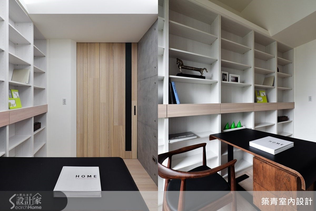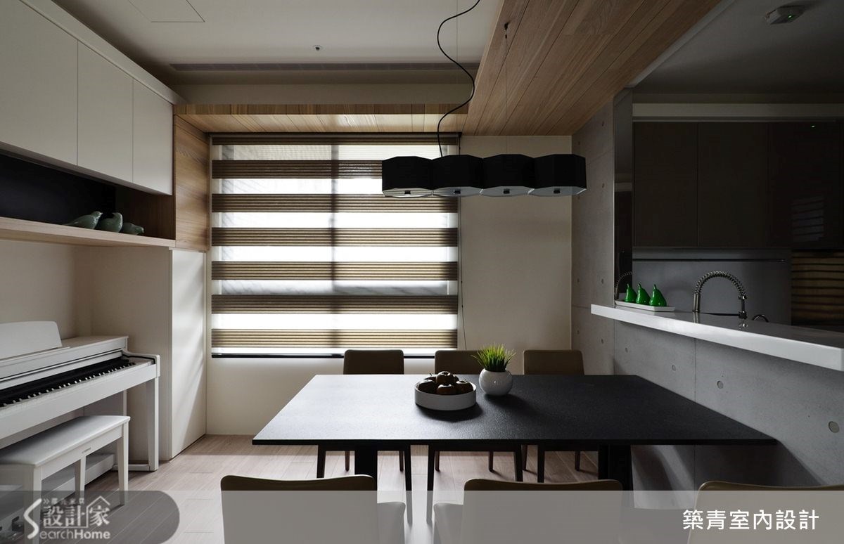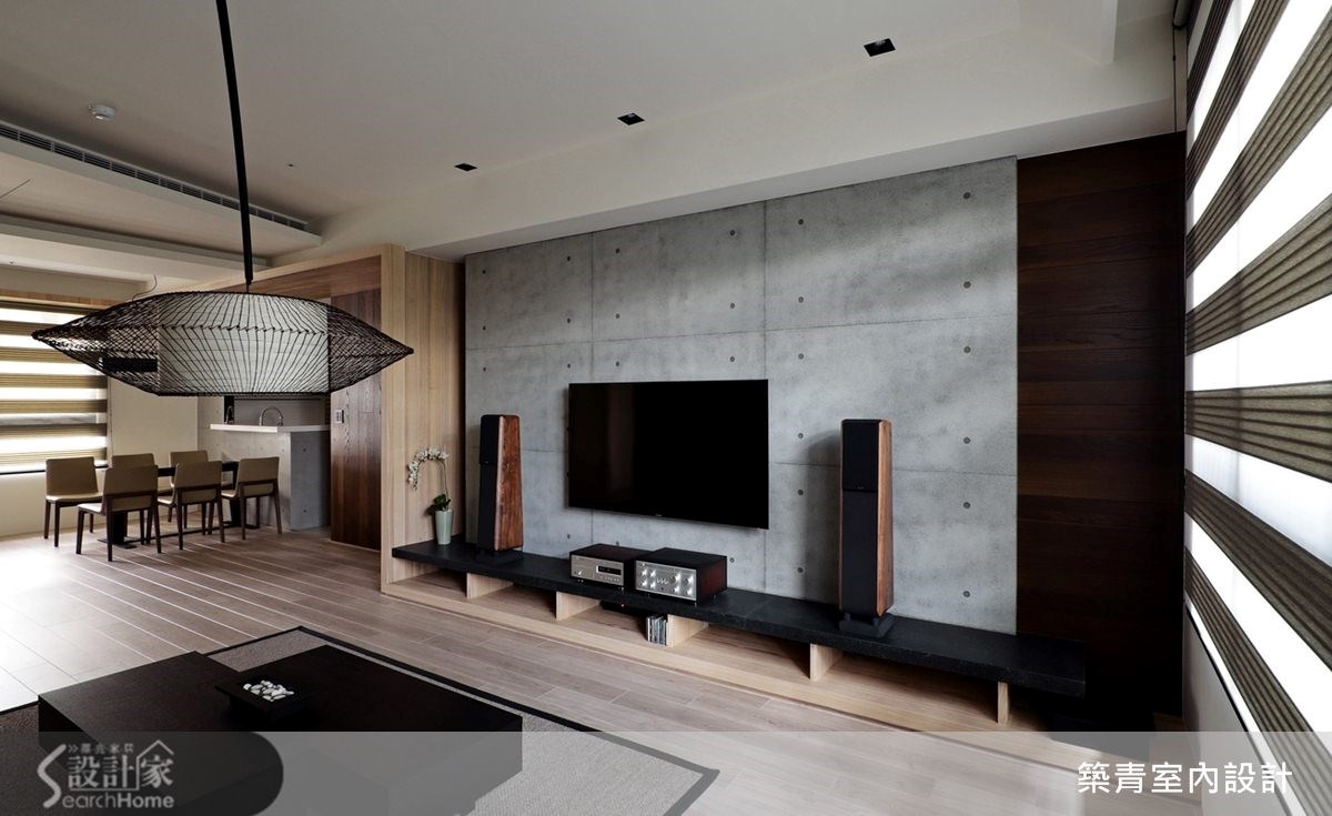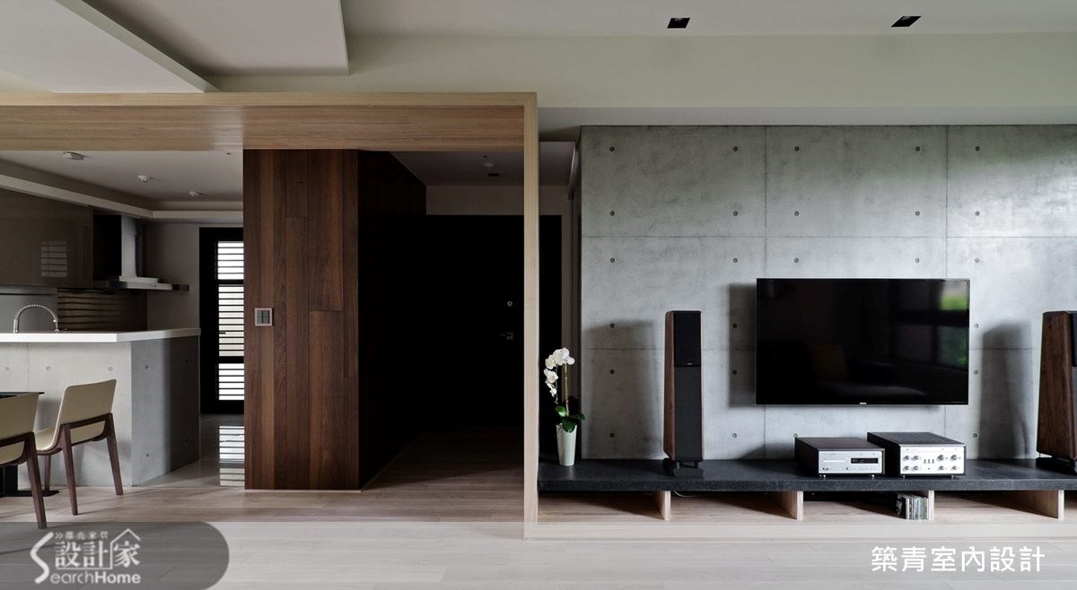 149平方米的现代风住家,规划了四室两厅的格局;挥别制式隔断,让开放式的客餐区成为日常活动主要重心,并融入了清水模涂装的静谧氛围,晕染出充满利落的空间意象。 【以木作延展变化趣味、划出分界】踏进公共空间便被独特的电视墙设计吸引;清水模涂装搭配整体空间用色及木材质,独树一格的建构出简约调性。随着光影的变化,更能感受这低调空间的宽阔美好。 电视矮柜下方的木头底板延伸至玄关侧墙,再拉到餐厅天花板,形成延伸交错的几何美感,造型框架也自然划分出空间的界线。清水模中岛吧台和电视墙面互相呼应,餐桌也特别挑选不反光的仿古面印度黑,以吻合沉稳的整体设计概念。餐桌旁的空间规划了收纳柜与开放式琴房,成为多元的复合式空间,造型利落外亦提升了机能性。书房选用白色的大型书柜满足收纳机能,开放层架除了可放大量书籍,还可作为展示空间使用。