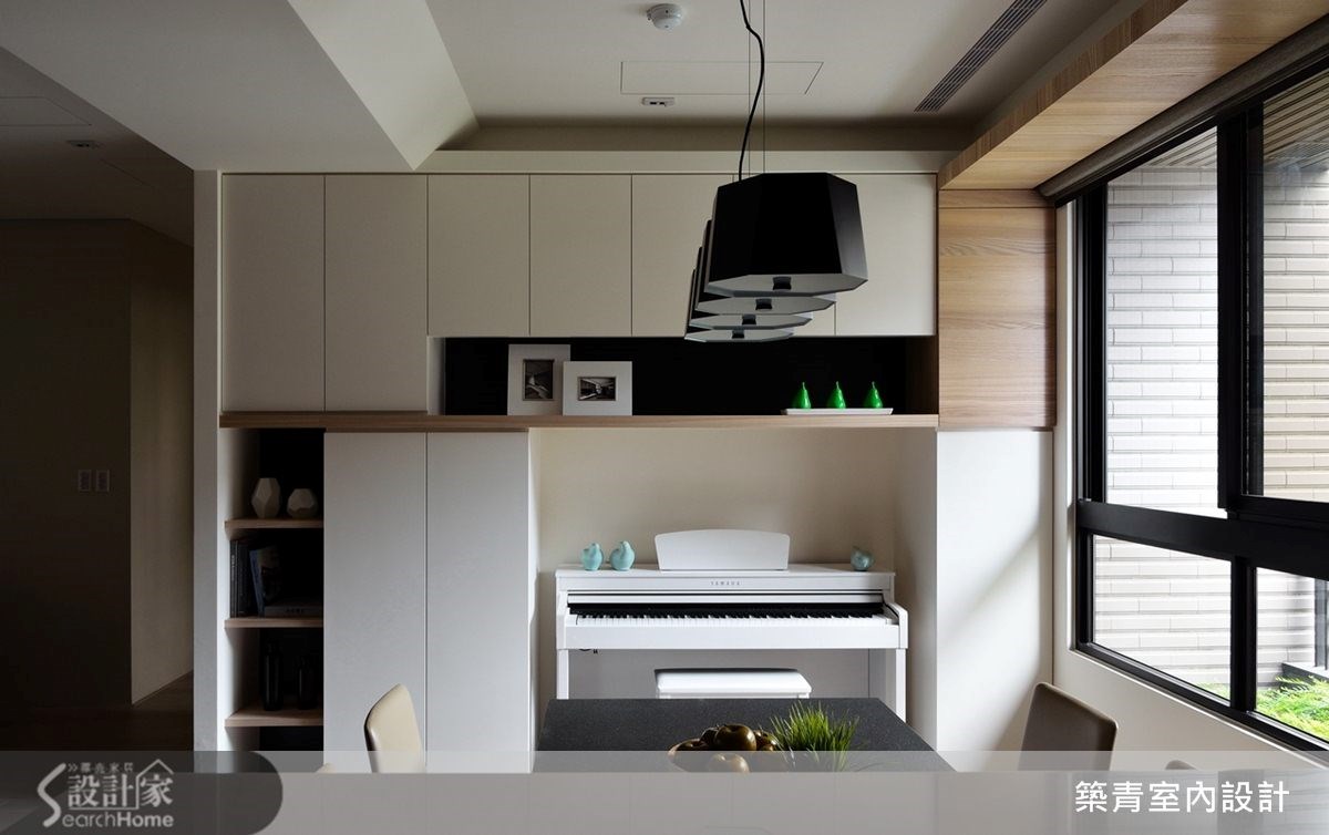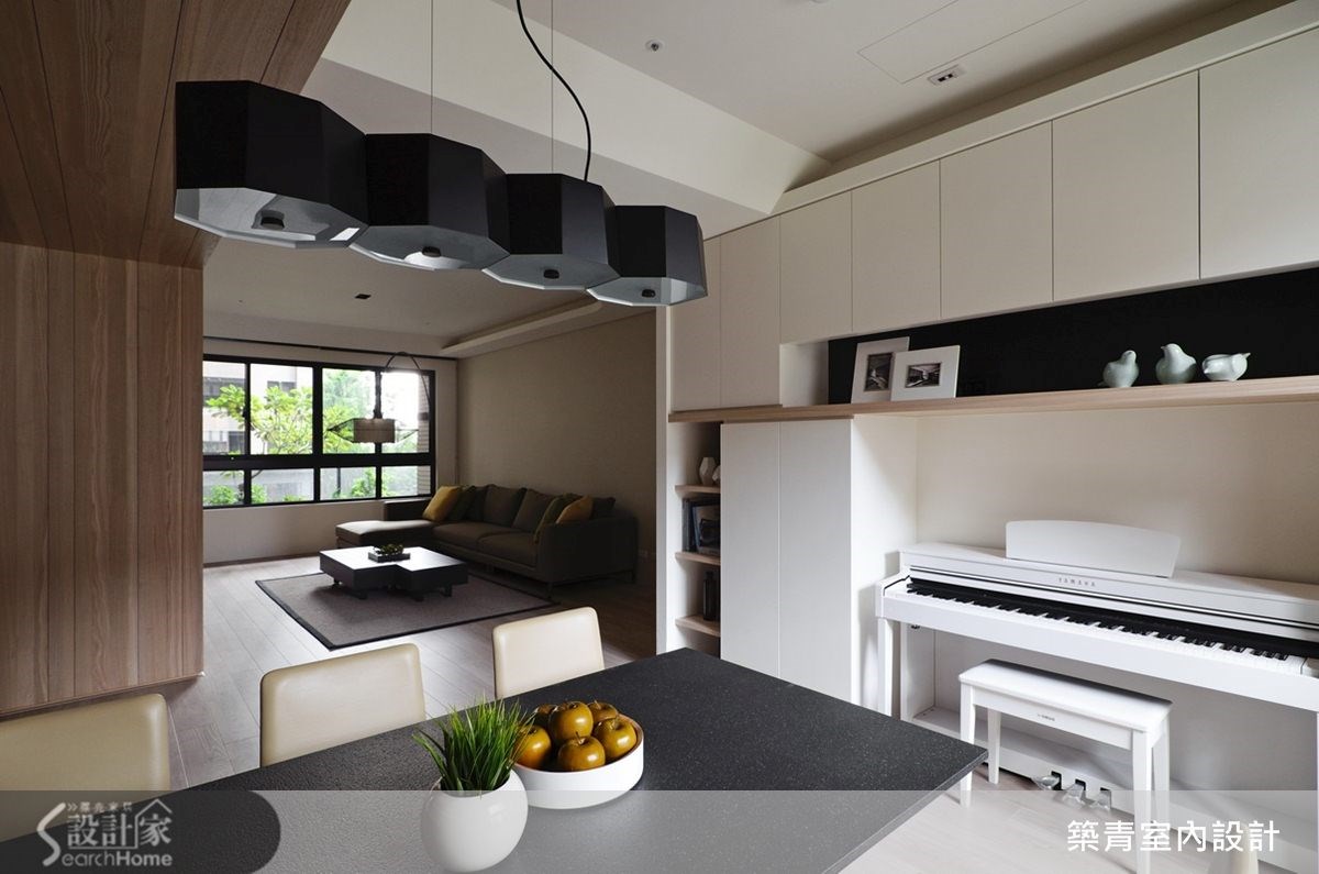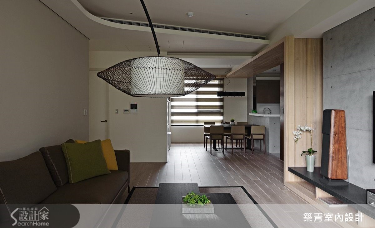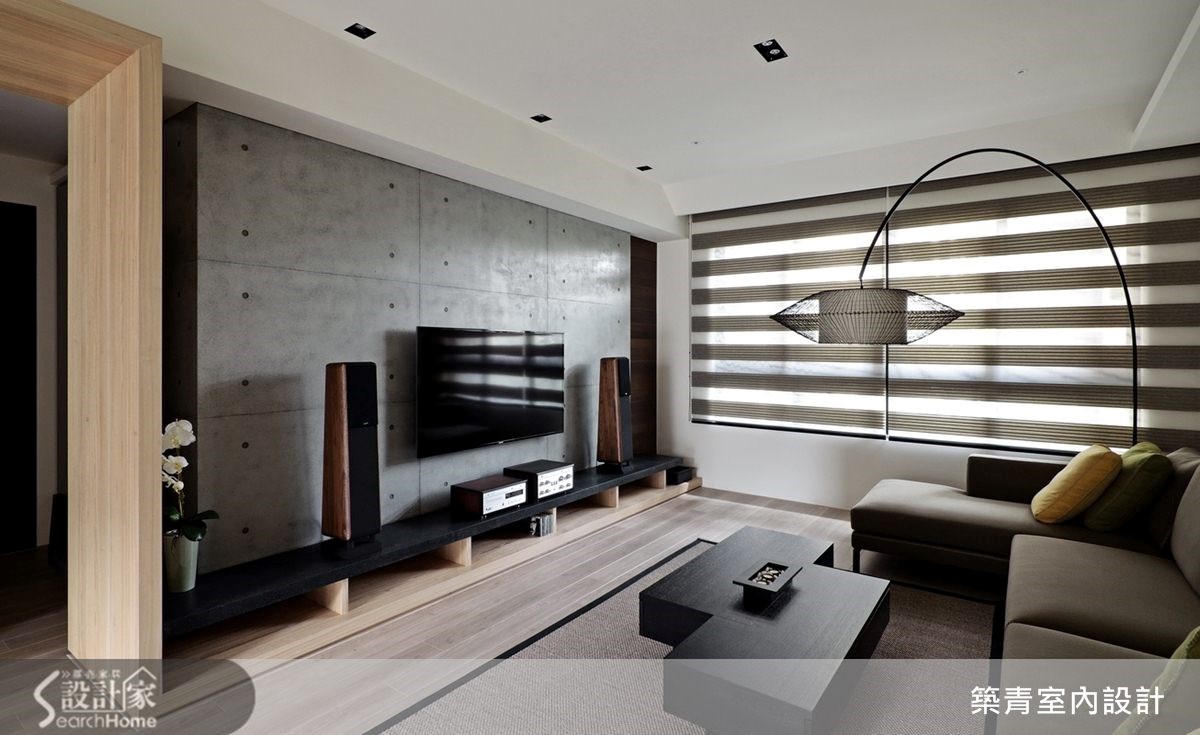 149平方米的现代风住家,规划了四室两厅的格局;挥别制式隔断,让开放式的客餐区成为日常活动主要重心,并融入了清水模涂装的静谧氛围,晕染出充满利落的空间意象。 【以木作延展变化趣味、划出分界】踏进公共空间便被独特的电视墙设计吸引;清水模涂装搭配整体空间用色及木材质,独树一格的建构出简约调性。随着光影的变化,更能感受这低调空间的宽阔美好。 电视矮柜下方的木头底板延伸至玄关侧墙,再拉到餐厅天花板,形成延伸交错的几何美感,造型框架也自然划分出空间的界线。清水模中岛吧台和电视墙面互相呼应,餐桌也特别挑选不反光的仿古面印度黑,以吻合沉稳的整体设计概念。餐桌旁的空间规划了收纳柜与开放式琴房,成为多元的复合式空间,造型利落外亦提升了机能性。书房选用白色的大型书柜满足收纳机能,开放层架除了可放大量书籍,还可作为展示空间使用。