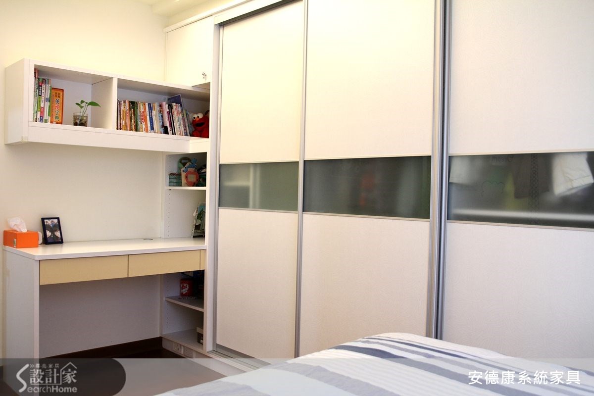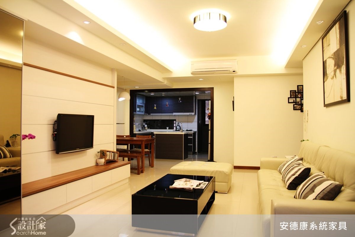 这间格局方正的二手屋是屋主一家四口的家,设计师保留原始优点,不大动隔断,并藉由规划及灯光引导,让空间线条更为俐落。打造出一个4室2厅,具有简约美感的舒适居家。 【系统柜沿墙设置,不占空间】客厅呈现温馨柔和的氛围,让人一回到家就可舒缓工作的疲惫,以系统木作作为电视主墙,呈现简约美感。视听柜上设计一小巧的CD置放空间,倾斜状的线条增添趣味感,并在白色主调中增添镜面材质,公共领域注入现代质感。餐厅采开放式格局,利用深浅木色交织出温暖自然的氛围,一旁墙面则配置完整的收纳空间,门片可隐约见到细腻的木纹肌理,并设计一个开放式展示平台,透过小植栽中注入空间清新感。主卧空间靠窗处为弧形格局,成了屋主的飘窗区,搭配落地窗引进的空气与阳光,让人可随时小憩一下。并在床头墙凿空嵌置灯光,不只满足了睡前的照明需求,也成为居室中具温馨感受的展示背景。