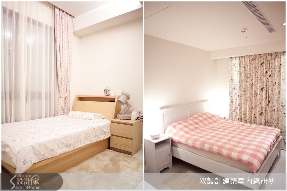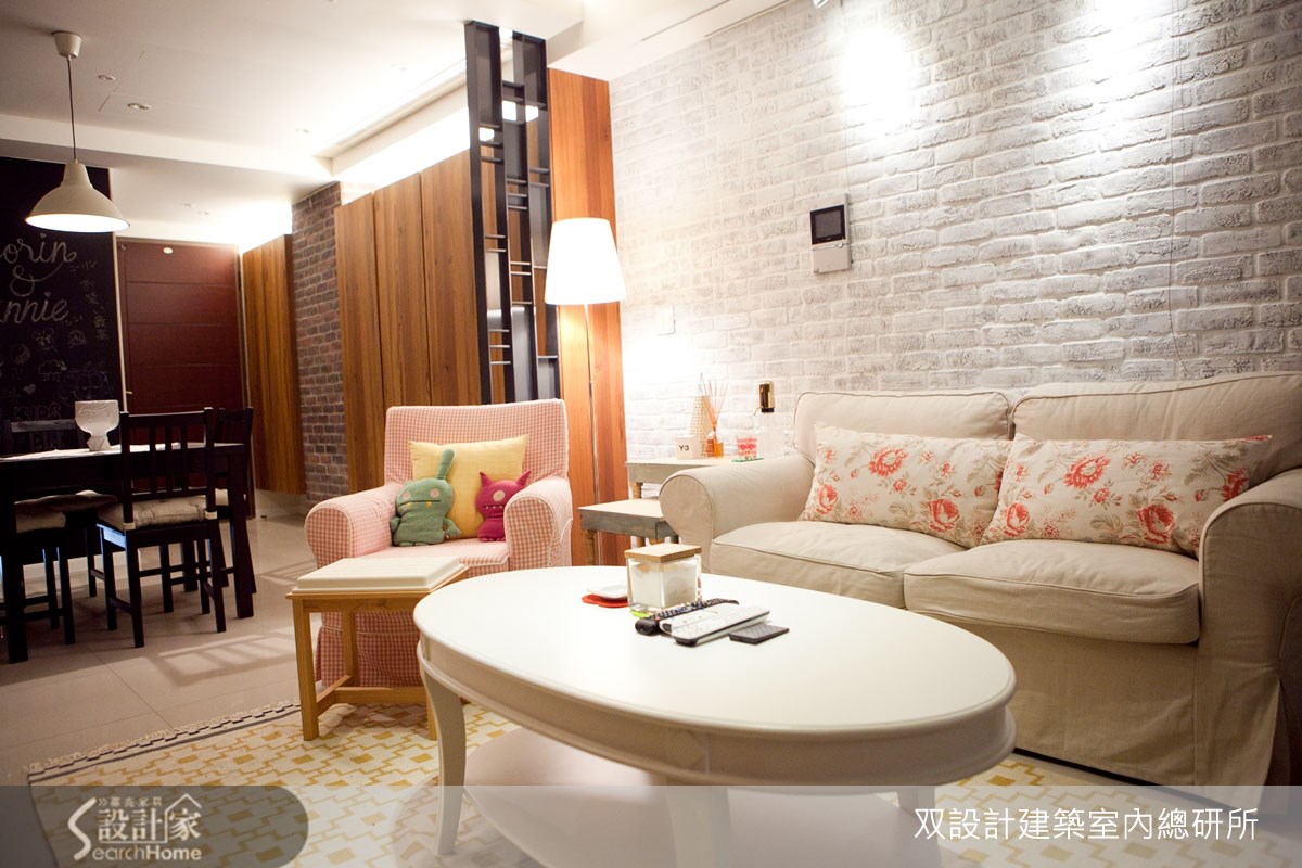 隐身在新大楼里,隔绝了外头的熙攘,建立出一处具有杂货风的现代乡村居家。设计师将公共空间采开放式设计,舍去制式的隔断,并融合不同的设计元素巧妙点缀其中,展现出明亮又温馨的好感居家,一同看见住宅的无限创意吧。 【对比跳跃的视觉感,温馨有新意】厚实的大型收纳鞋柜,成为进入家中的一道沉稳印象,搭配具有斑驳感的砖墙相互错落设置,让视觉拉长了空间比例,也对尺度因此改观。玄关处的屏风,具有工业感的镂空黑色铁艺,也巧妙的界定出客厅与其它空间的交界。 电视墙以原始的木设计展现出木纹的暖感,并呼应纯白的文化石沙发墙,跳跃性的色彩对比反倒让空间中产生对比的美感,砖形的粗旷风貌搭配自然系的家具家饰,塑造出温馨又具有新意的客厅空间。一整面落地窗反射的媒材效果让空间有了放大的作用,同时打造飘窗区,提供屋主休憩的角落。餐厨空间为了避免油烟四溢家中,采活动推拉门设计,用餐空间搭配一面黑板墙,可随手涂鸦留言,呈现手感的居家设计。私密空间以柔白作为主要用色,可爱的小碎花窗帘立刻让空间暖感升温,为了提高整体的使用机能,在墙面嵌上了隔板,可做为展示及收纳的使用,让空间一点也不浪费。
