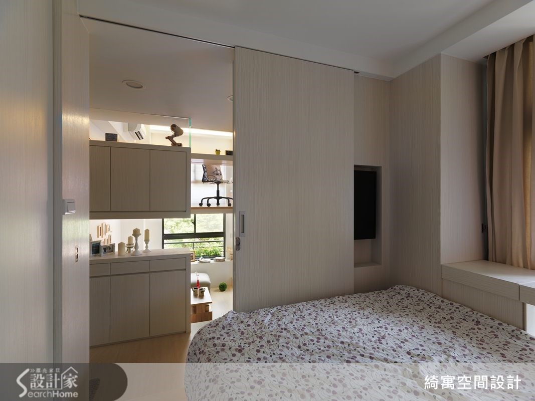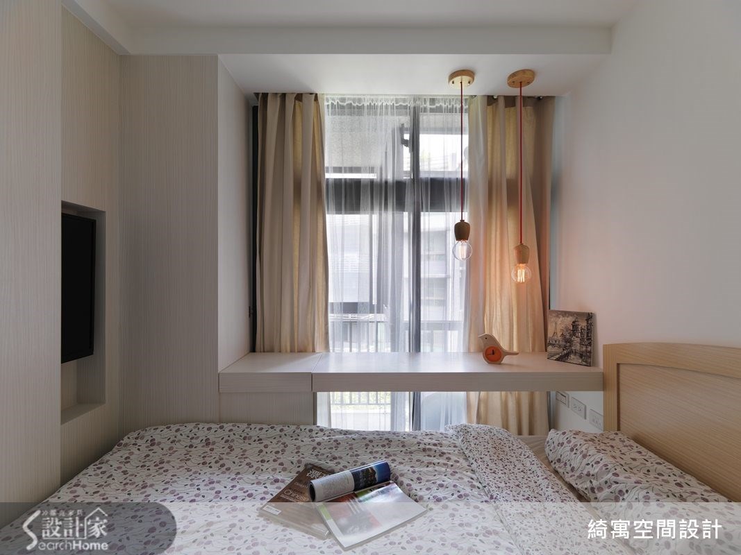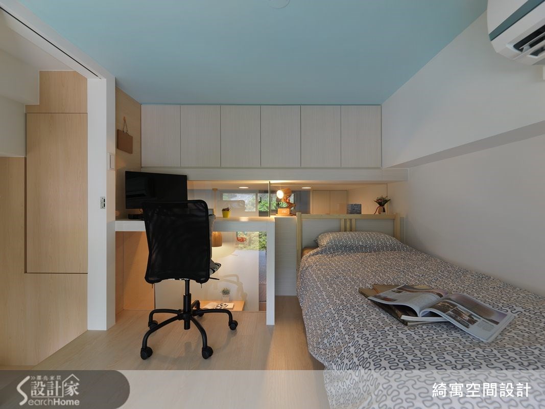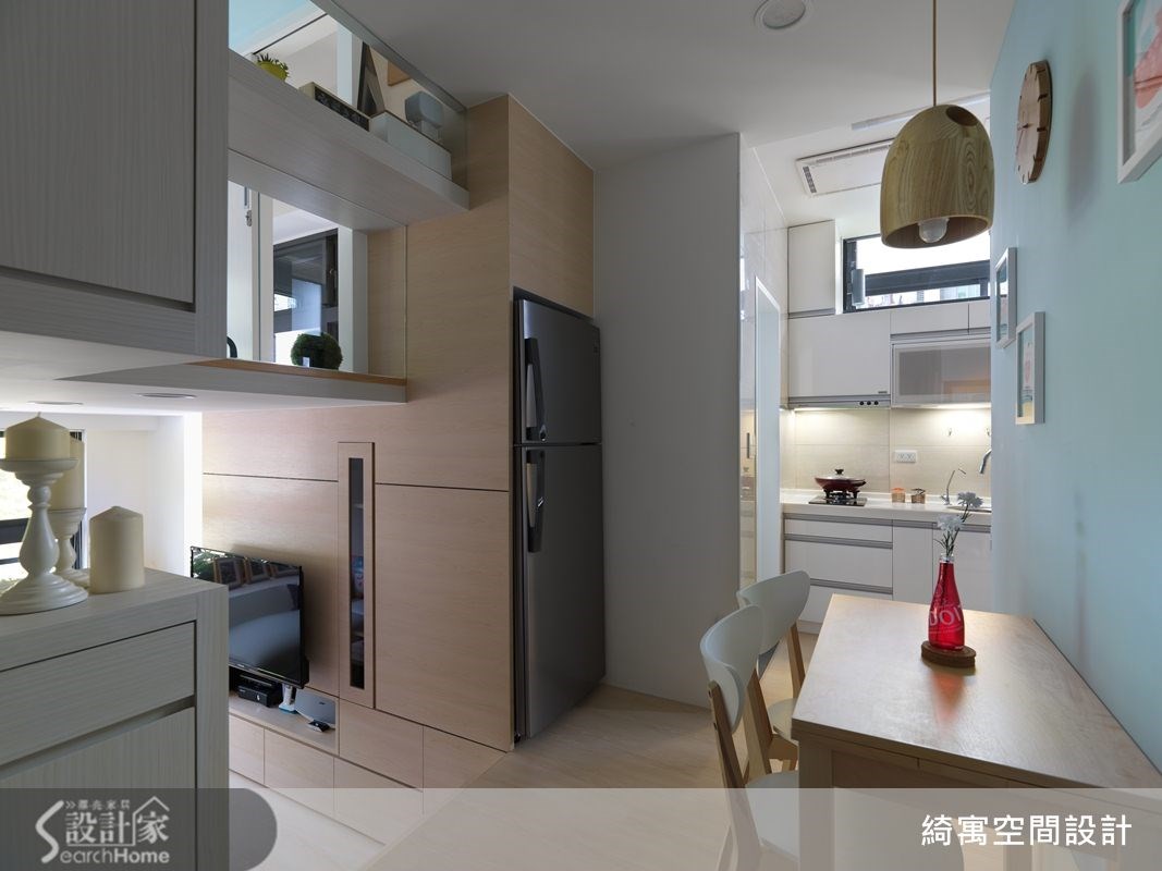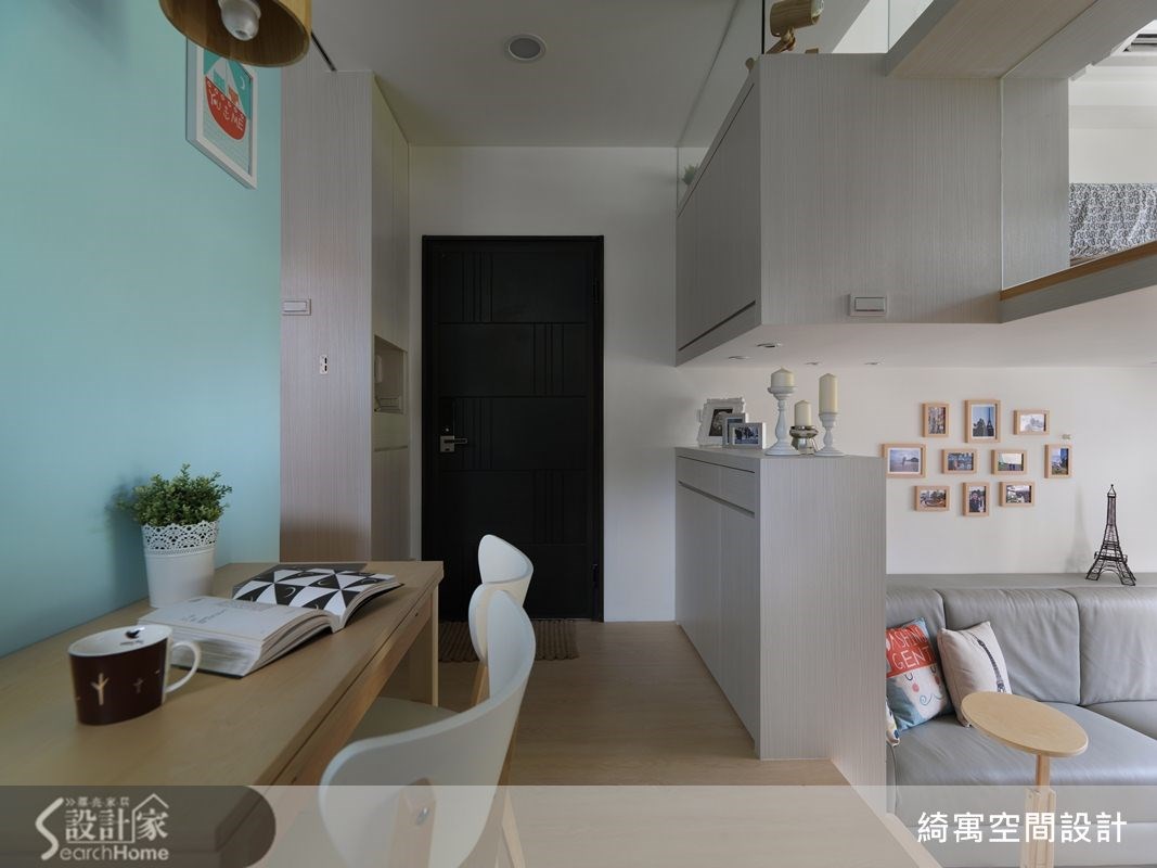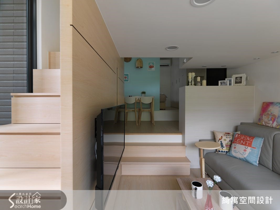 年轻夫妻买下微型小户型,经由设计师发挥巧思,透过跃层划规划出2室2厅,让小宅也能拥有客厅、餐厨空间与两间居室,并点缀采光、色彩等元素,注入北欧风的品味质感,建构出都市小资族梦寐以求的居宅!【开放场域设定,节省室内空间】进入家中,迎面而来的是开放式餐厅,架高的地板台面以色彩墙面作为背景,以天空蓝展现出自由轻盈的视觉感,延伸入内则可进入厨房区域,将冰箱推入墙面,节省不少空间。【窗景延伸视觉,广纳阳光绿意】顺着阶梯往下,可来到客厅领域,因天花板较高,可设计跃层,透过窗户引进阳光与绿意,让视觉可往户外延伸,缓解格局压迫,同时在大片木作电视墙后方配置收纳空间,满足机能需求。【简约实用,合理的机能配置】卧房空间以木作移门作为弹性的空间界定,关上时则与电视墙结合成完整立面,并在墙面衔接隔板、悬吊灯饰,构成了简约却实用的置物台面;沿楼梯往上还设立了阅读空间,运用清玻璃媒材,让视线由上往下一览无遗!