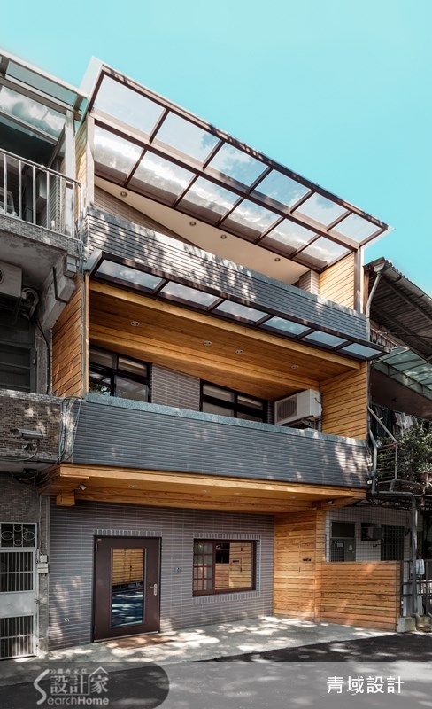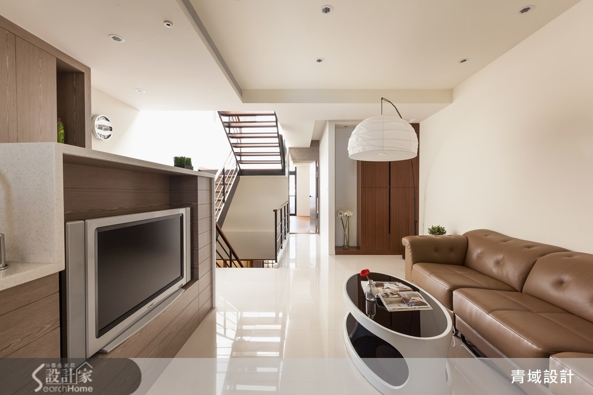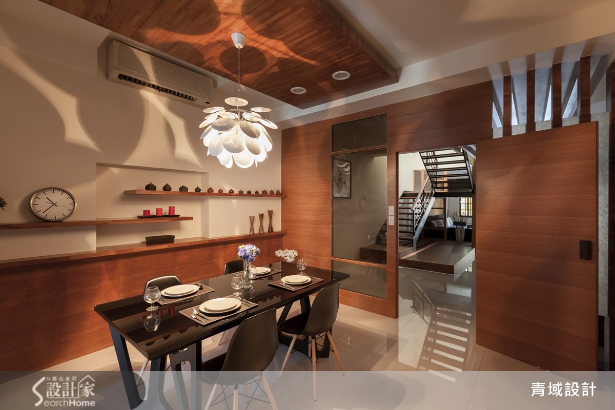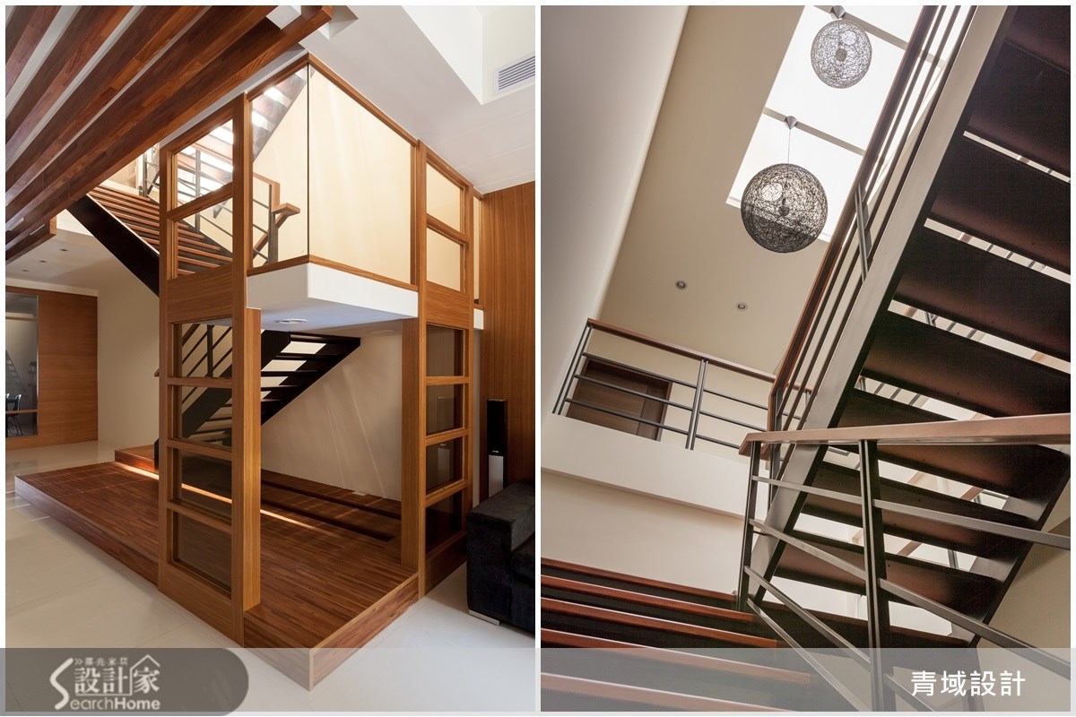 屋子本身为长型屋,加上屋龄已高,面临着漏水、采光不良的恼人问题,且看设计师运用了那些妙思,让这间347平米的老屋空间,重新展现迷人的风格气息。 【开放格局,解决幽暗不通风问题】设计师以中庭概念,将原本封闭式的楼梯移位,并结合开放式设计,使楼梯巧妙带入明亮的自然光,点亮原本幽暗的住宅氛围。此外,一楼公共空间也利用开放式格局,搭配格栅、夹纱玻璃等建材,一举解决长型屋常见的幽暗又不通风的缺点。 【兼具机能与收纳,贴近生活的起居空间】来到二楼,为全家人的起居空间,设计师结合电视矮墙与吧台,大大增加了电视矮墙的机能性,创造出乐活优闲的时光,三楼则是挑高式的天井,让阳光可以从三楼洒落至一楼,流泄的自然光,让生活空间,增添出柔美的生活情趣,也可避免楼梯显得幽暗。