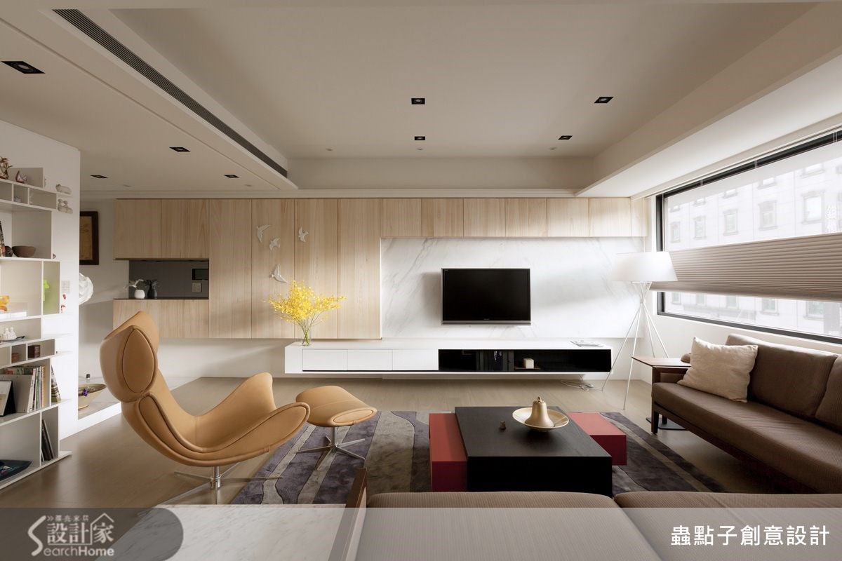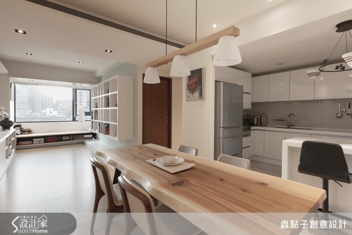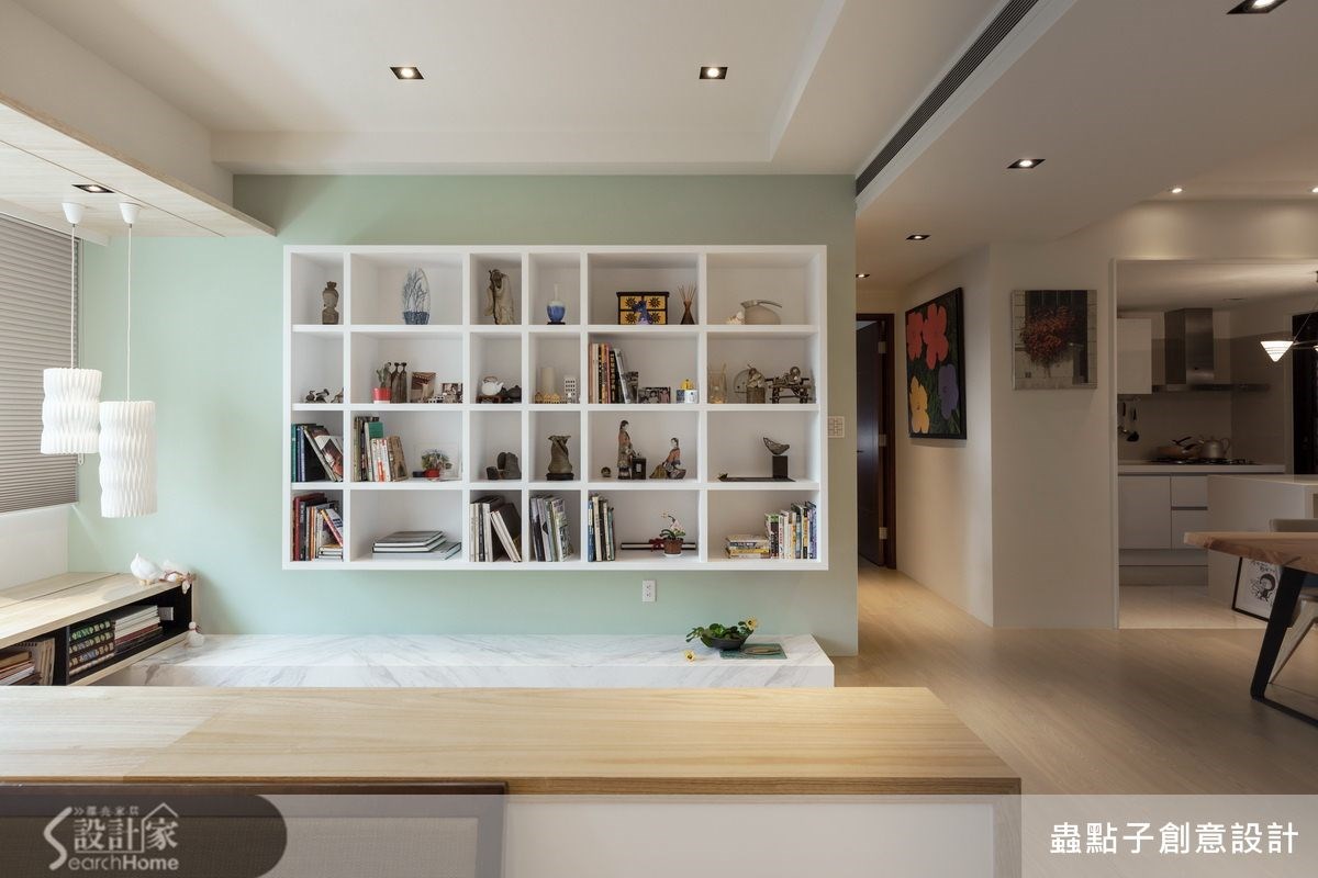132平方米屋宅,格局4室2厅,是屋主一家4口的新居,设计师保留大面积窗户,延揽充足光线,同时采用大量天然感材质,以实木皮及石材等来串联空间,让家族成员可享受家的温馨感。【利用自然材质,打造静美居所 】玄关以深色镜面材质为背景做出装饰平台,呈现艺术感;公共空间透过大片木材质围塑,并结合大理石材质,营造轻盈的居家感,窗户配置风琴帘调节采光与视线,让人可随时欣赏户外景致。餐厅与厨房则利用吧台作为界定,长型木餐桌不加修饰的线条,打造出森林感的用餐氛围;沙发后方的开放式书房,则以嫩绿色为色调,搭配悬吊书柜,帶出轻盈不厚重的视觉感,并在书房各角落开辟许多收纳格柜,展现复合机能。