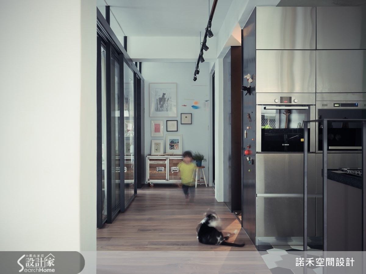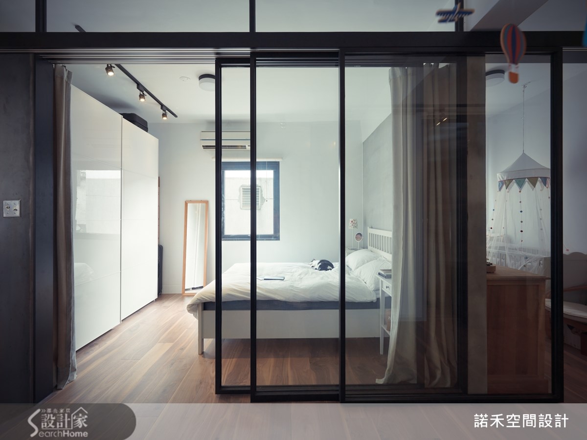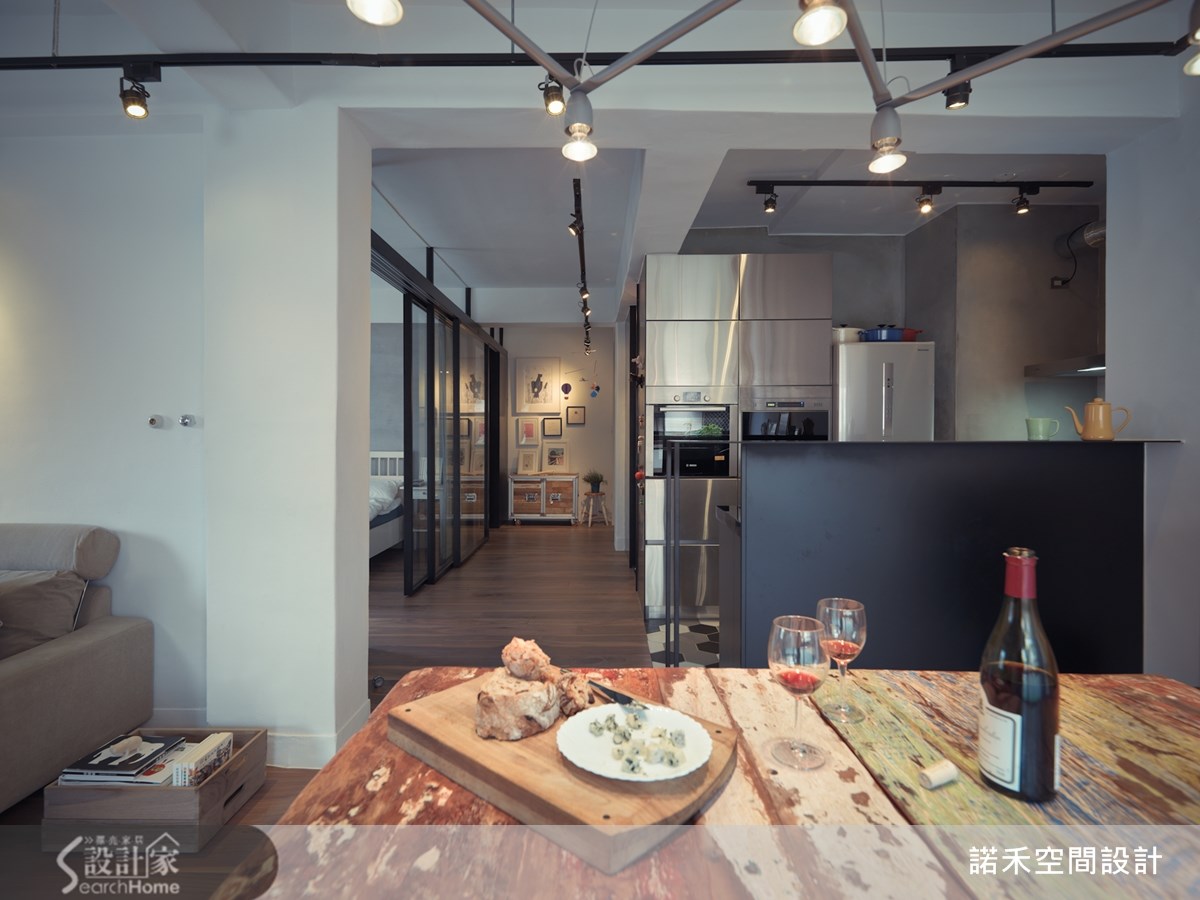 63平方米的loft风格宅,住着35岁导演与太太、小孩,他们的家由老屋所翻修而成,翻修灵感受到日本作家太宰治所撰写的短篇小说"奔跑吧!梅洛斯!"所启发,将故事的构思转化为对空间设计的灵感与活动的适切需求。【重整格局,营造扩容效果】卸下过多人工的装饰,设计师与导演论后,决定以简约感结合轻工业的概念,打造出拥有自由动线的Loft宅。为解决屋内采光阴暗的问题,设计师除格局重整为2室1厅的开阔格局,让通道与机能空间放大,提供孩子安心游玩的居住环境。【旧木回收新生,化身复古家具】客餐厅以白色为主,搭配浅色沙发来提升明亮度,利用回收木材转化成为复古的餐桌与书柜,增添不少温润感受。同时,设计师也利用黑色的铁件灯架,营造出利落个性,能360度旋转的电视,则满足屋主能在客餐厅区域看电视的需求。【采用透明隔断,点亮卫浴、厨房】另外,卧室隔断则采用透明玻璃,使视觉上具穿透感并减少空间的压迫感,使原先阴暗的卫浴与厨房,能纳入自然光而明亮起来,满足了男主人热爱厨艺烹饪的生活习惯。
