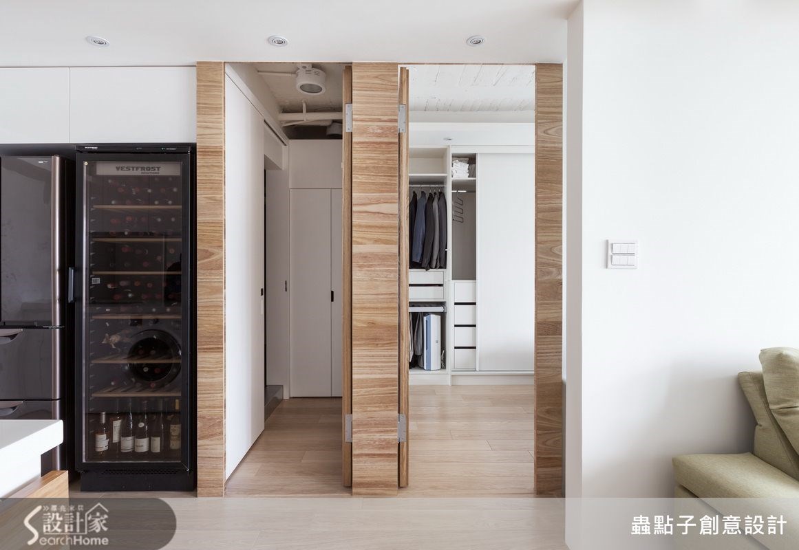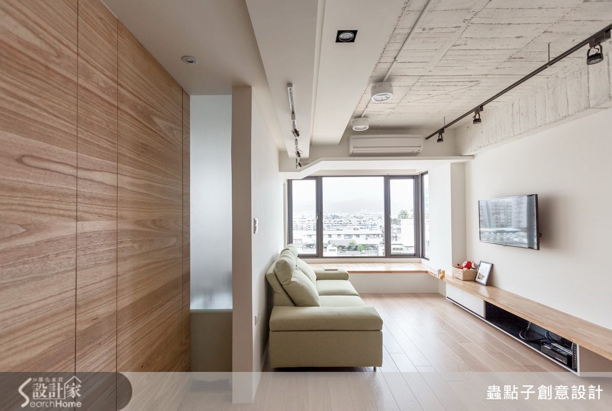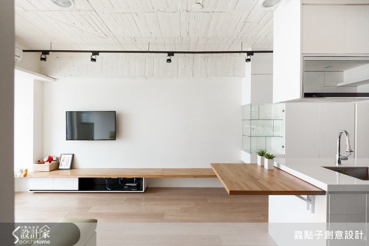 单身男屋主拥有一间40平方米的二手房,虽有著地段优势,但屋宅内部老旧、昏暗甚至还会漏水,于是设计师透过居家装修,进行"单身男性居家改造计划",透过室内设计规划,呈现内外兼具的美感。【充裕采光,营造舒爽明亮空间】2室1厅的居宅以大量木质铺述公共空间,白色的空间主调搭配丰沛采光,营造明亮放大的视感,天花板则呈现隐约的粗犷刻纹,呼应粗犷率性的工业风格,同时将木层板结合视听柜,并以清玻璃打造收纳柜体,打造一抹视觉亮点。餐厅充分展现机能,透过弹性收放的木板,延展流理台台面,并将酒柜、冰箱与墙面结合成完整立面,形成简化的格局线条,化解屋宅梁体的突兀,同时在墙面配置隐藏门片,推开门即可通往私领域空间。