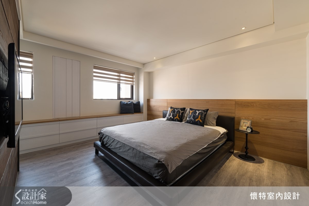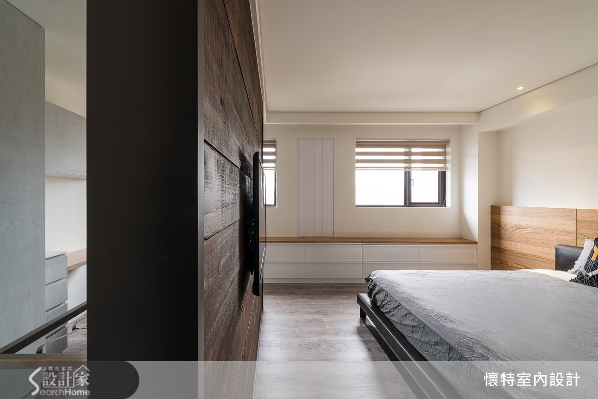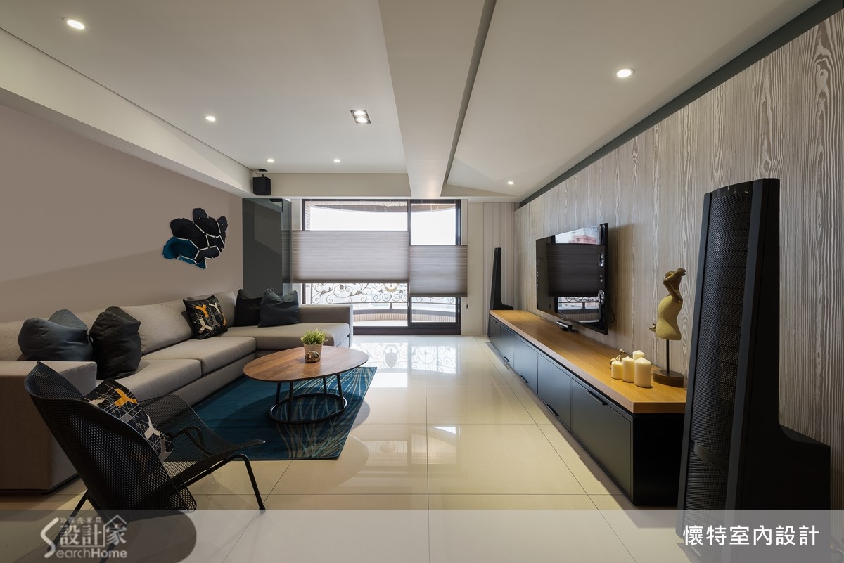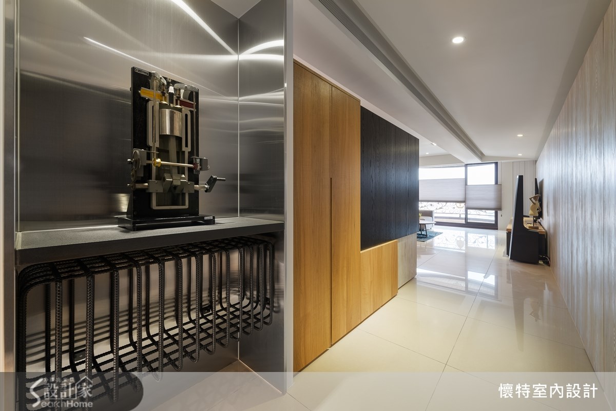 这是一间132平的新屋,由于屋主偏爱工业风格,又需要大量的收纳。设计师将粗犷钢筋、木纹水泥板纳入设计,再融合具现代感的木皮,并在各区扩增柜体,打造了崭新的轻工业风。 【黑灰简约色调,视觉不复杂】格局配置上将开放式客、餐厅区域,利用横亘于天花板的假梁贯穿,不仅让空间更大器也能互相呼应,同时巧妙将空调管线隐藏于其中。餐厅和厨房间则以铁件玻璃拉门区隔,不仅可满足女主人隔绝油烟的需求,也符合男主人对现代风格开放式格局的喜好。 特别的是在玄关入口处,设计师使用汽车零件与捆绑的钢筋结合,呈现工业感的装置艺术。餐厅上方运用火车汽笛,透过工业时代中划时代的发明,让空间多了更多的想象。选用简单的色彩,如黑、灰、木皮及不锈钢本色等空间底色,再缀以壁面装饰及抱枕、地毯等鲜明色彩的家饰来表现。省略繁复的装饰和布置,而透过巧妙的格局、动线安排,及画龙点睛的装饰,便是一间融合现代与工业感的风格潮宅。