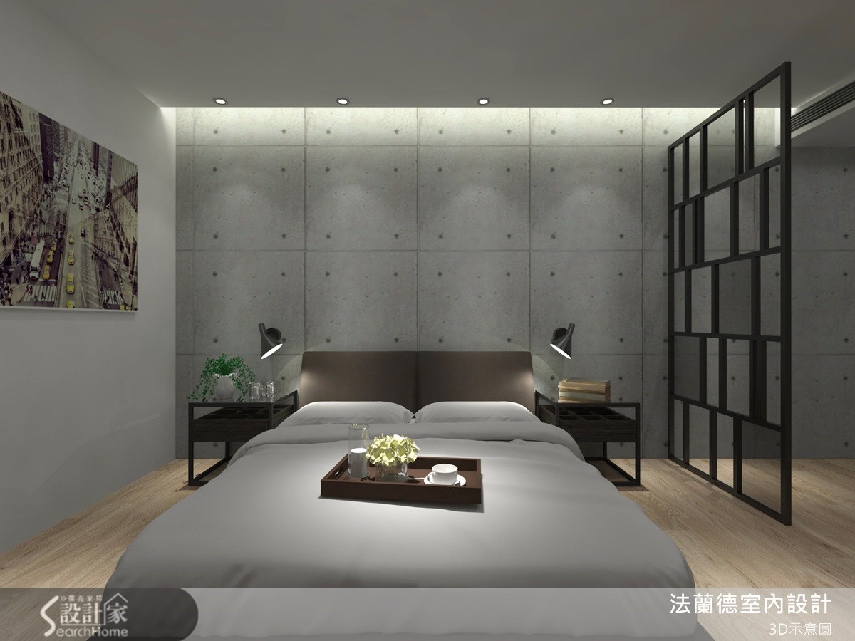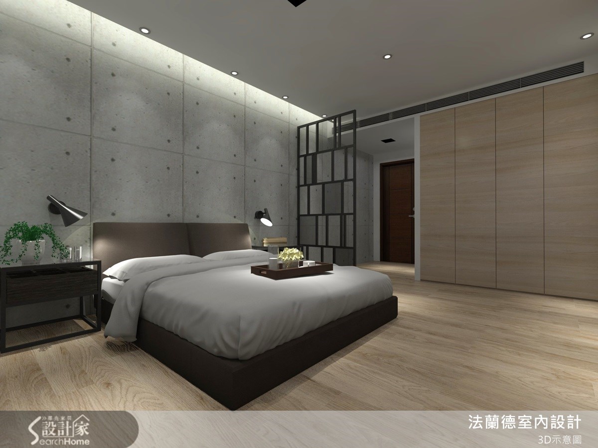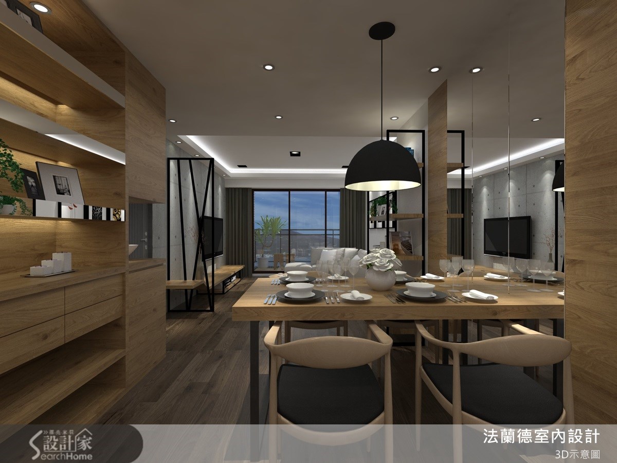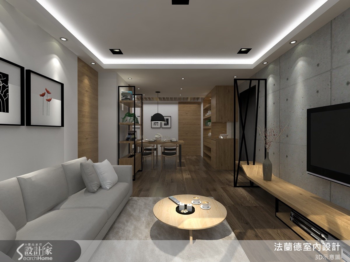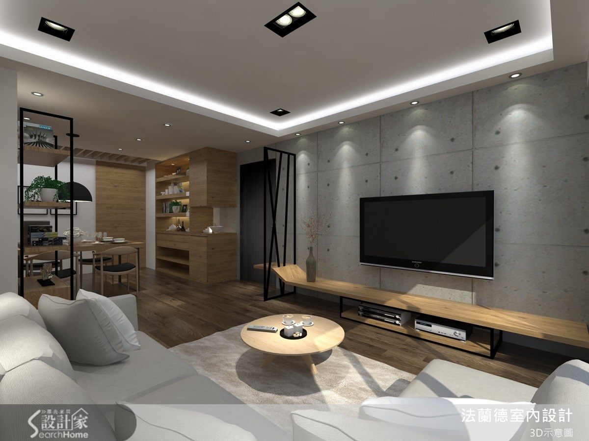 屋主希望住家能引进自然美感,于是设计师将钢刷木皮、仿清水模建材、铁件等材质融入居家,将温润与粗犷美感做出完善比例分配。空间里营造了轻工业风咖啡馆气质,并引进酒店式的居住概念,让一家三口坐享休闲风的美好居家感受。【仿清水模与铁件,造轻工业质感】客厅由大量木材质与仿清水模建材打造而成,在空间内配置不少收纳柜体,注入储物机能,并由木质隔板架构平行延伸的视听柜层架,与入口的铁件玄关做出融合,黑色线条交错轻工业风艺术感,成为异材质搭配的美感设计。餐厅则透过木质柜体强化收纳展示功能,同时添入镜面材质,让狭长的用餐空间增添空间广度。公共领域透过大片落地窗引进良好采光,以通透材质围塑出向外延伸的阳台区域,让人可随时在此赏览户外景致。卧房空间呼应公领域,同样以大面积仿清水模建材作为床头墙材质,在天花板嵌灯光的搭配下,照应出粗犷的原始风情,同时在灰色个性感中点缀木色,透过温润平衡冷调,构筑自然舒适的寝卧气氛。