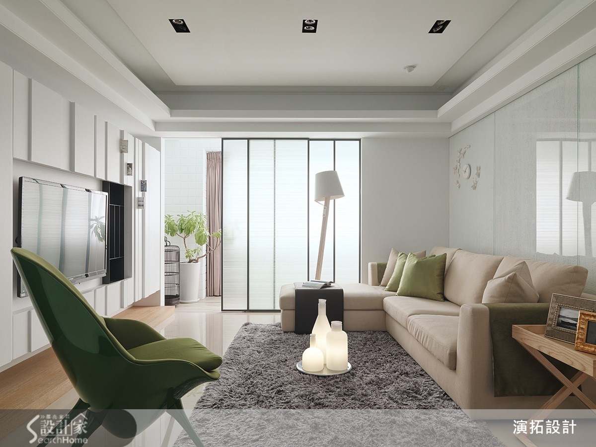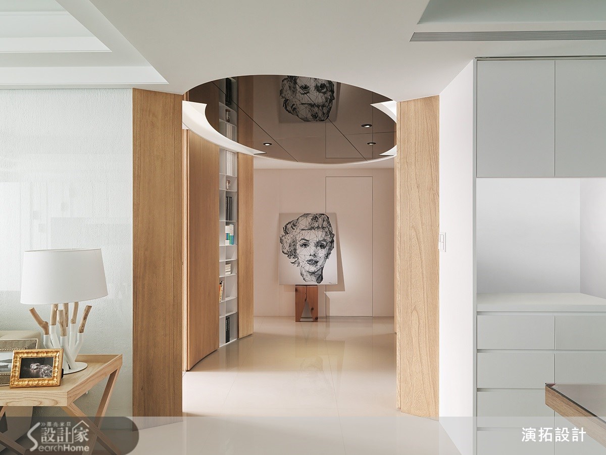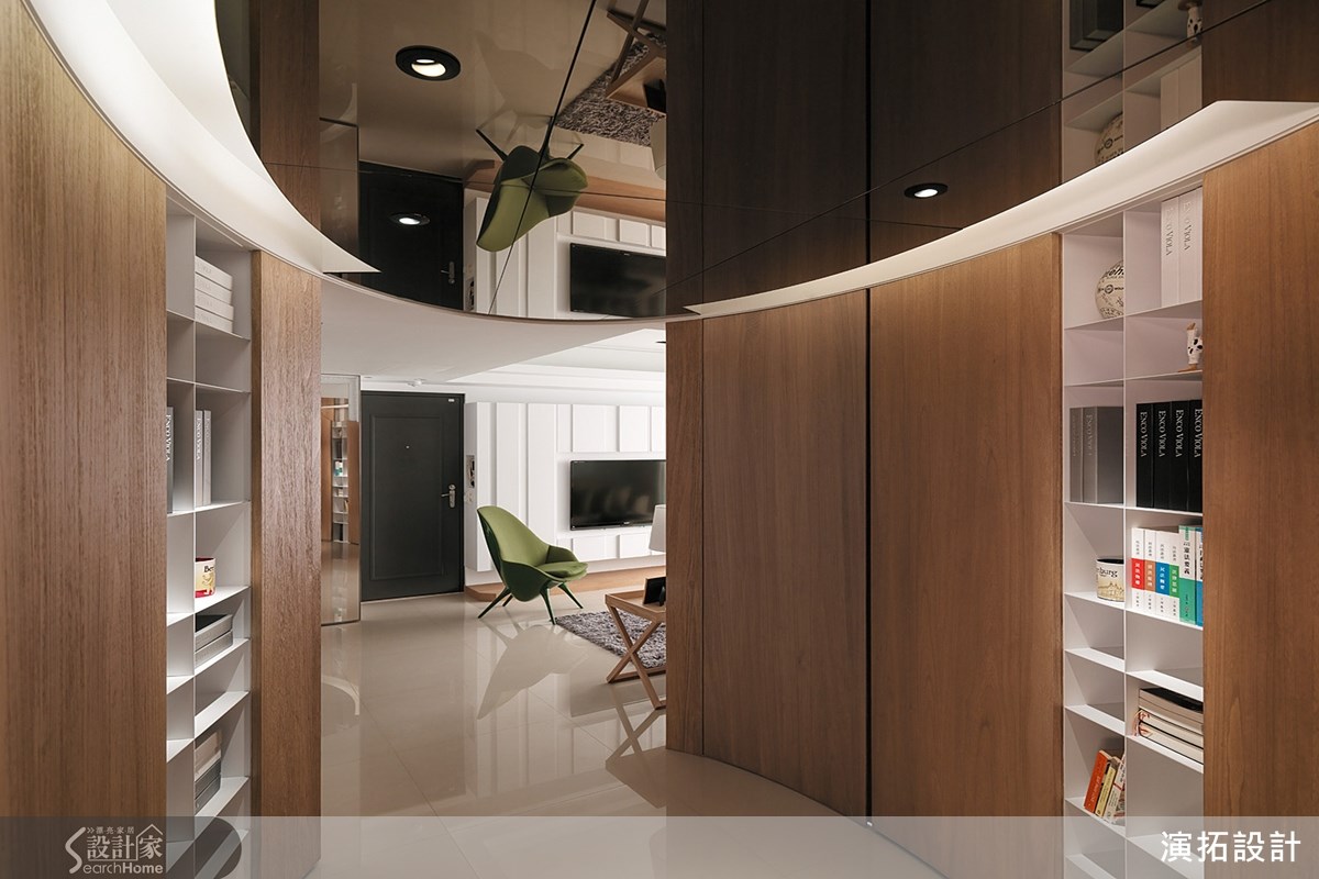 明亮的白色空间、质朴的人文气息,让人丝毫想不到这原先居然是间阴暗老屋。其实能有这样的空间感,是设计师运用了巧思的结果,客厅旁与餐厅外的拉门均使用透光度好的材质,带入和煦的自然光。【玻璃与镜面材质,提升明亮度】运用镜面效果的材质也是屋内更加明亮的关键,沙发背墙使用的是玻璃材质,而在客厅与餐厅间的过渡空间,以及玄关处的上方也利用茶镜的设计,也有扩容的效果。仅仅透过材质的运用,就能让空间感大不同。【椭圆形玄关,增设书籍展示区】跳脱传统设计也是这个案例的亮点,玄关处椭圆形的设计,改变了空间动线,弧形壁面嵌入开放式铁件隔板,运用积木堆栈的方式,让屋主的书籍都有了摆放处,也达到实用的收纳机能,把收纳变成生活风景,让人喜爱设计师的设计巧思。