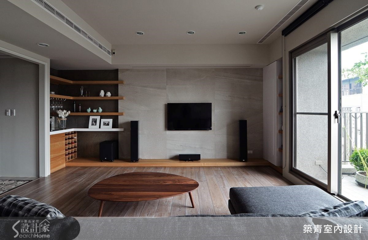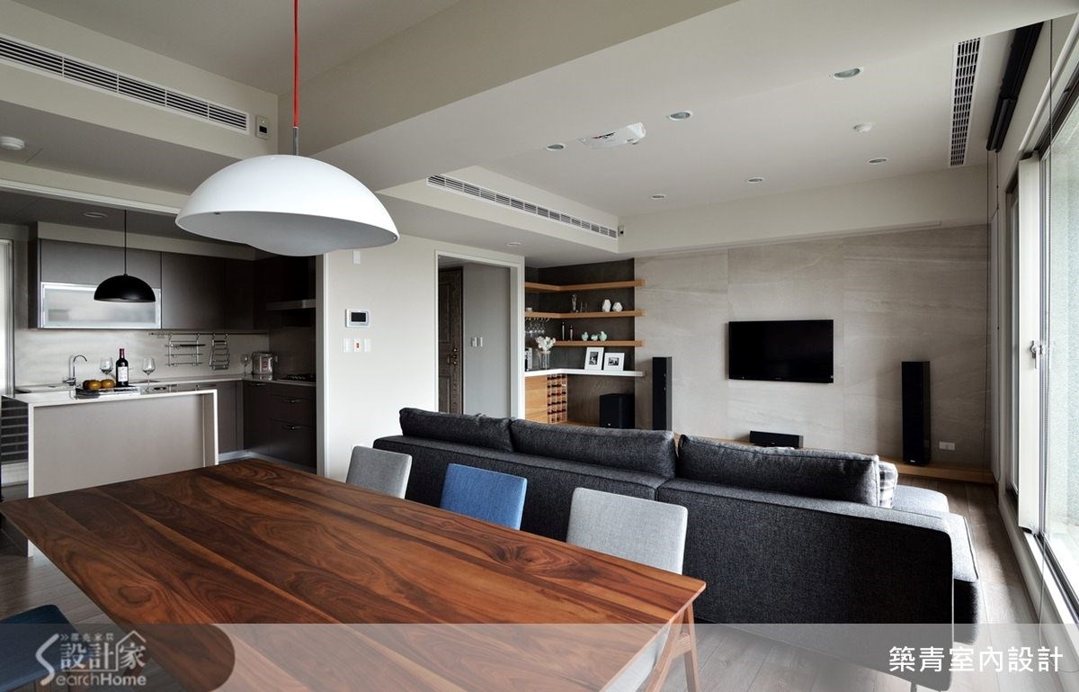 149平方米的单身宅,格局为三室两厅,考虑屋主个性及生活需求,以现代风格为基础,并采用开放式公领域强化空间宽敞度,打造出一间实用机能与美感兼具的屋宅。 【低彩度空间,藉家具凸显质感】走进公共空间,开放式格局彰显了大器感,户外阳台区则替室内揽进充裕的自然光。客厅的电视墙、地坪、家具则可见到细腻的材质纹理,搭配低调的家具色彩,呈现居家稳重感。客厅天花板采内嵌投影屏幕,运用高度不阻碍视线的低矮沙发,延伸客厅景深,使餐厅也可享受到视听娱乐;并配置长木餐桌,扩大聚餐场合。走进U字型厨房,可见到中央的流理吧台,将内嵌式冰箱与热炒区作出区隔,形成流畅且安全的动线。卧房融合充裕的收纳机能,在床与衣柜间作出墙柜,透过线条感的门片加深空间层次,并以上下悬空设计减轻厚重感,兼具电视墙功能,后方则是专属的更衣室。