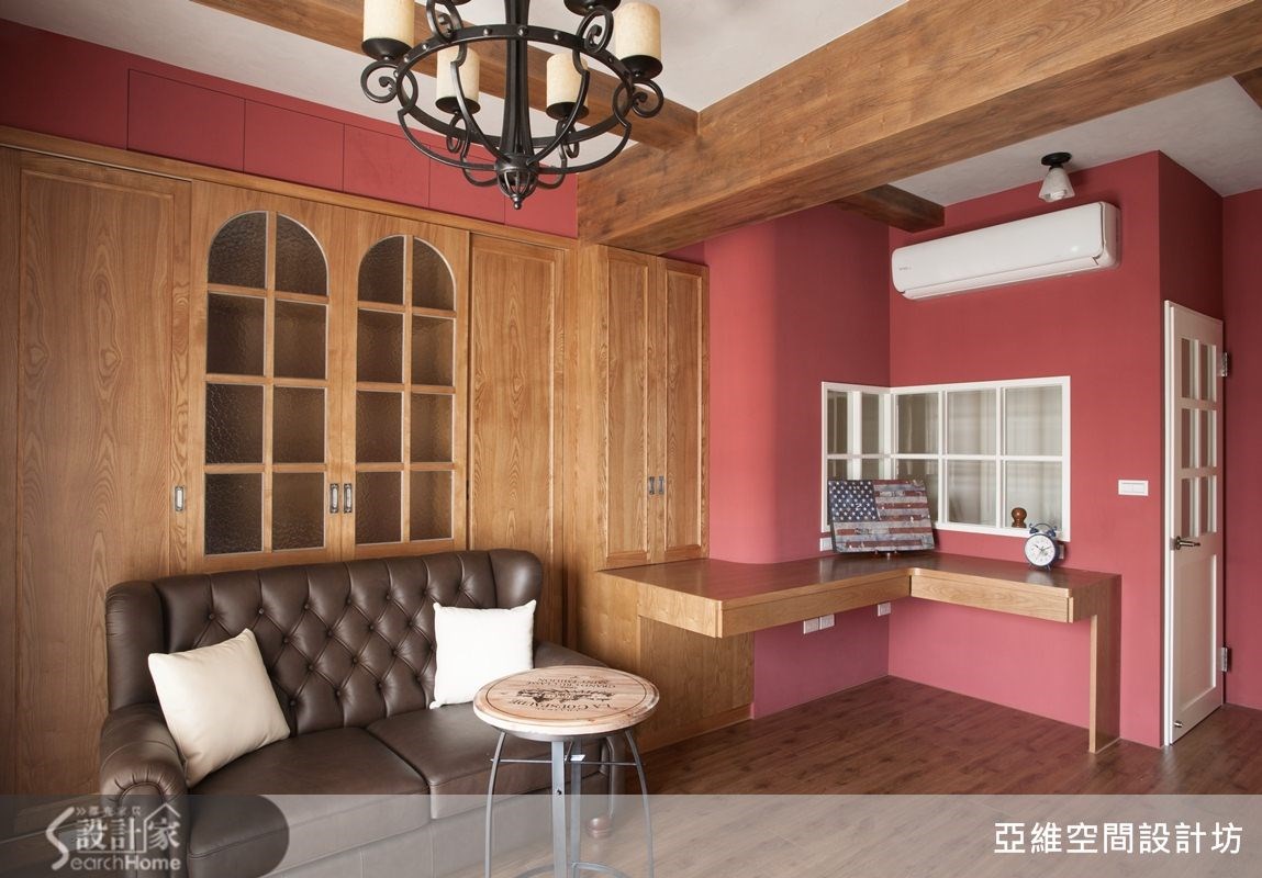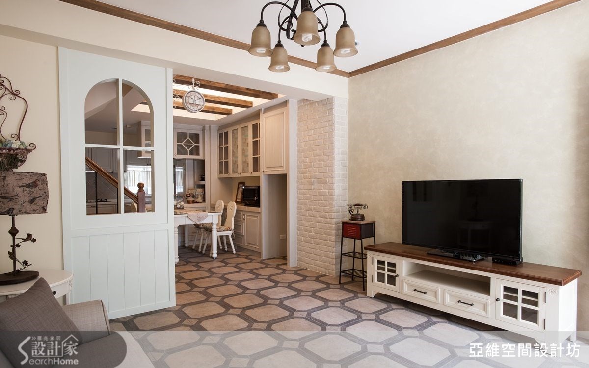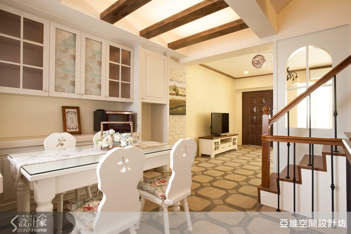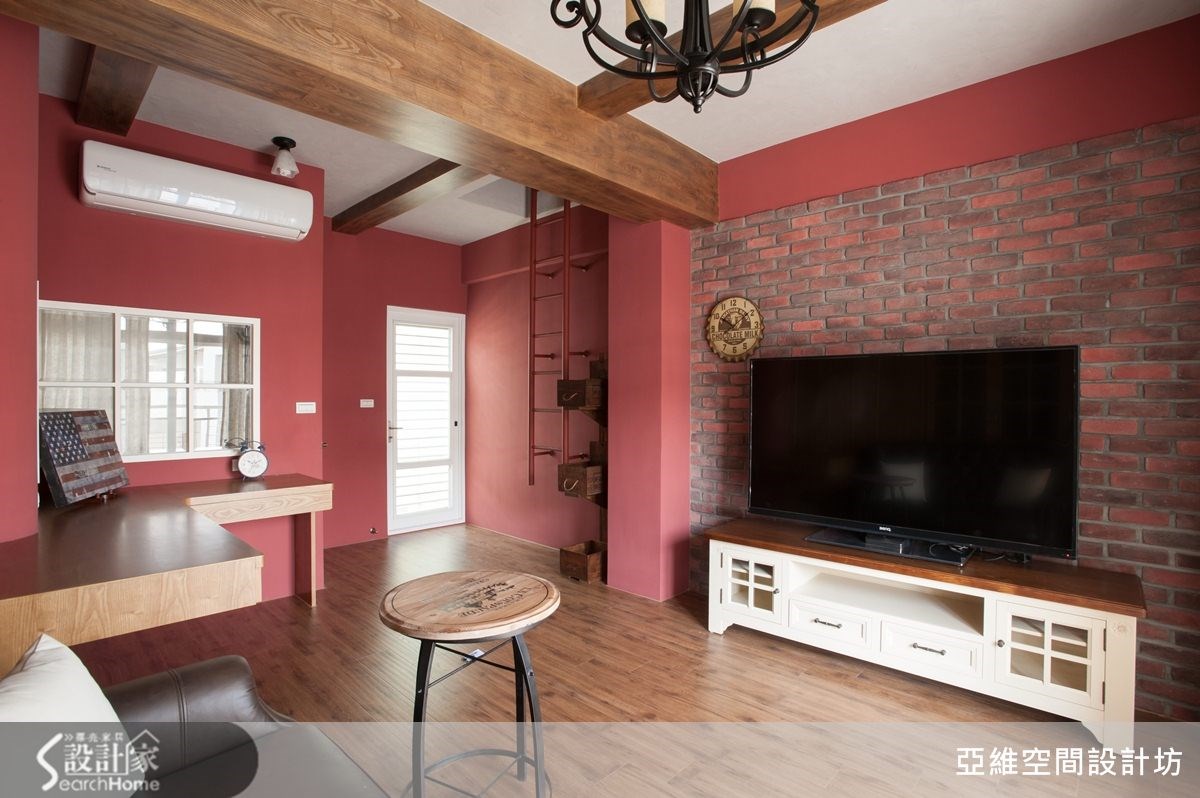 谁说居家表情不能选择两种?透过材质与彩度的运用,也能将清新的乡村调,及热情抢眼的红砖墙和谐结合。两种客厅,无论是安定或奔放,在这个238平方米别墅全都拥有!【缩小梯间,带来扩容效果】238平方米的3口之家,拥有4室3厅的格局,由10年二手屋改造而成,在4层楼的空间里,清楚划分了不同机能,并重新调整格局,把梯间缩小,延伸空间宽敞度。【特殊地板图腾,展现质朴质感】特殊的地板材质铺陈客厅,展现居宅层次,在浅色调中展现朴实质感,打造美式乡村格调,墙面高处并配置平台,保留沙发背墙的完整高度,也融入展示机能性,窗户引进好采光,旁边的座椅台面则与柜体结合,同时满足收纳与休憩功能。【木梁天花板,凸显地道乡村风】餐厅区以温润木条装饰天花板,营造清爽不失温润的用餐空间;另间客厅则以跳脱色彩呈现,以热情的红色壁面围塑整体,创造惊喜的视觉感,搭配电视墙的红砖材质,营造陈旧粗犷的气息,同时将木作设计运用在天花板上,瓦解横梁劣势。【浅色墙纸,调制优雅气氛】以收纳柜作为沙发墙背景,结合木作展示平台,让空间的线条感显得流畅自然;在卧房内,则透过浅色的壁面与床头墙纸,搭配天花线板的简单层次,呈现优雅质感的寝卧气氛!