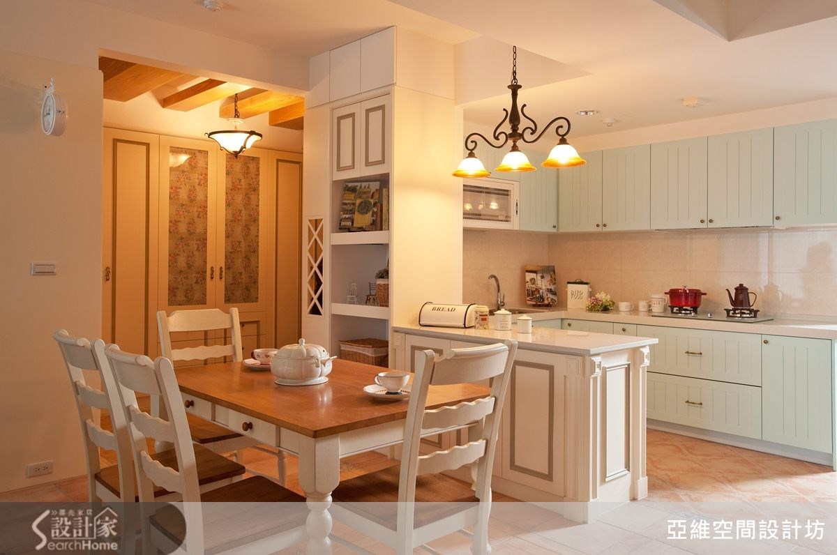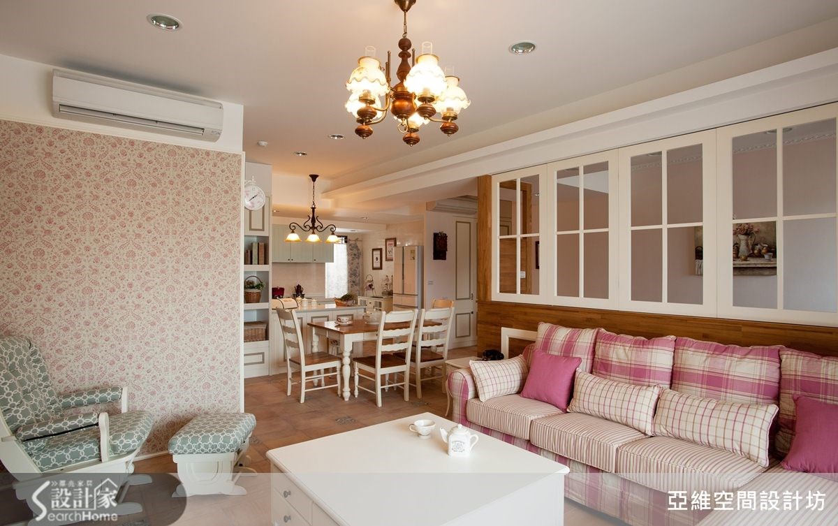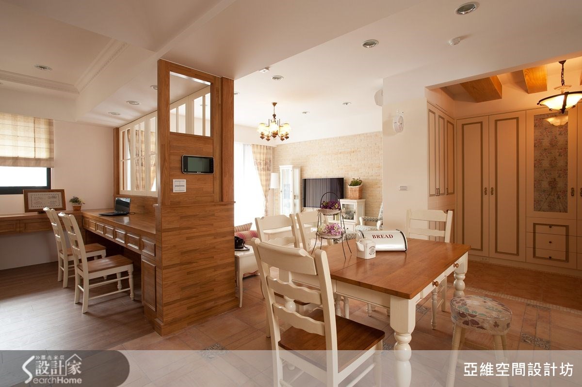 来到135平方米4室2厅的空间,设计师将俐落的都会感与乡村风结合,以粗犷材质勾勒居宅质朴氛围,同时在公共区域采开放式格局,营造出宽敞的格局线条,在纾压的居住氛围中,也融入现代时尚的生活精神!【西班牙复古砖,营造质朴意象】走进大门,玄关透过西班牙复古砖界定领域,营造出乡村的质朴印象;在公共空间中,将客厅、餐厅、书房领域做开放式处理,使采光可流通于居宅各个角落,打造出利落且明亮的气息。【粉色碎花语汇,挹注乡村气质】客厅运用大面积文化石墙营造风雅品味,同时搭配碎花墙纸、粉色沙发来妆点居家,注入纾压的乡村感;并与后方书房采白色隔断,透过清玻璃打造通透无碍的空间视觉,在书房内,则采实木桌椅打造天然感阅读空间。【充裕收纳规划,让餐厨更实用】餐厨空间运用纯净色彩搭配温润木质,并兼具充裕的收纳柜体,打造出清新且兼具机能的用餐空间;卧房则呈现浅绿色调,搭配白色线板的勾勒,不只营造出空间层次,更彰显居住者的优雅生活态度!
