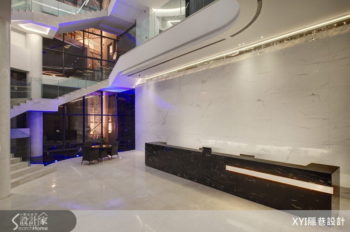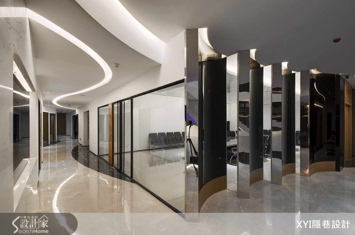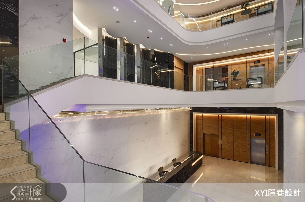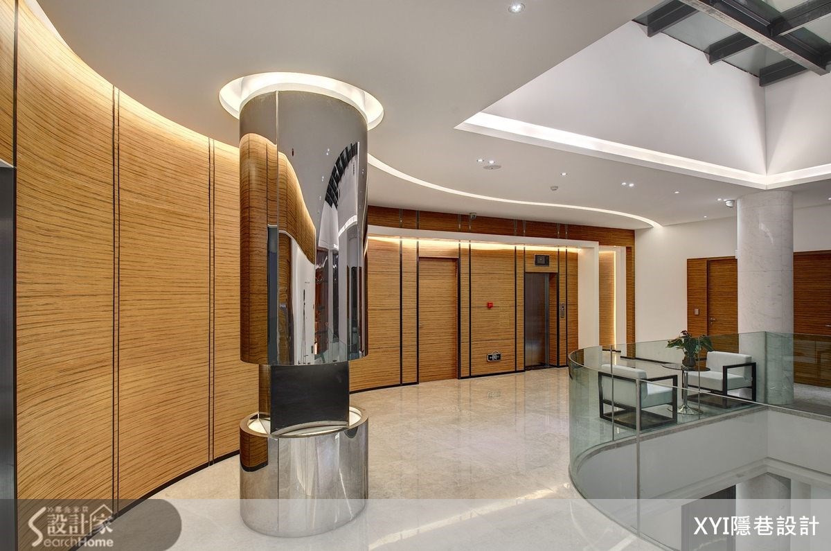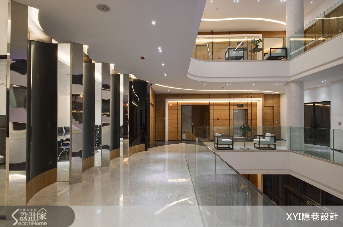 在贵阳花溪区,有一栋弧形的新潮建筑。在内部1550平方米的商业空间内,设计团队以化繁为简的手法,替空间带进大方、时尚且具休闲氛围的美感巧思,佐以色彩搭配、灯光设计、挑高格局等元素。在演绎现代风品味的同时,也完美精准传递了企业理念。【挑高格局和亮丽材质,造大器范】1550平方米空间里,弧形流线的天花板搭配灯槽设计,形成俐落的流畅感。并在挑高三层楼格局中采玻璃屋顶,透过钢骨的线性交错,勾勒出细腻线条。一楼深色接待台则呼应浅色背景,展现大理石的深浅对比之美。楼层电梯门皆呈现统一设计,以银丝橡木板铺贴并利用不锈钢板分割,注入温润暖调感。大理石楼梯配置12毫米钢化玻璃的楼梯侧墙,增加安全性。而在一楼大厅区在楼梯下方配置水池,注入了水波与光影等元素,打造自然情调。走上二楼,廊道地面采跳色处理,搭配反射光线,缓解了狭长格局,也营造光影。会议室则以大面清玻璃,展现宽敞视觉感;并以黑色烤漆玻璃和镜面,做出半弧墙面,呼应整栋建筑的线条。三楼柱体以镜面不锈钢板包覆,透过反射与挖空设计弱化梁柱,展现工艺美感。