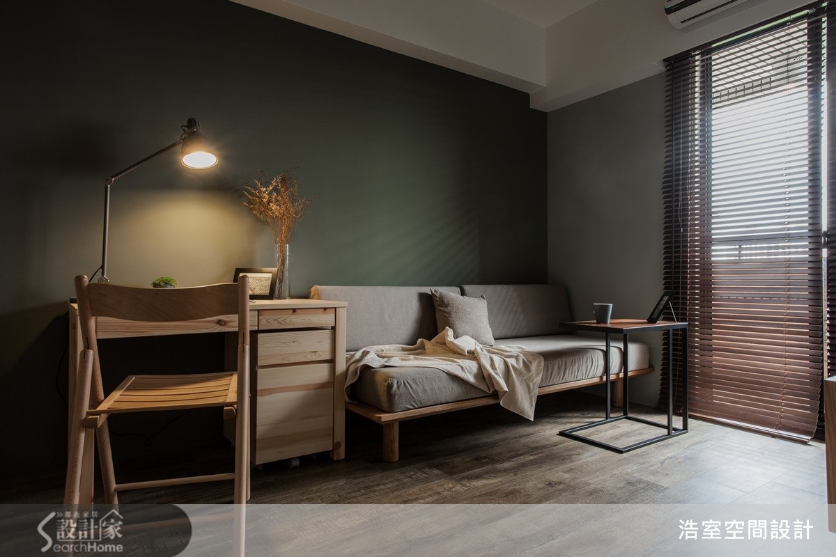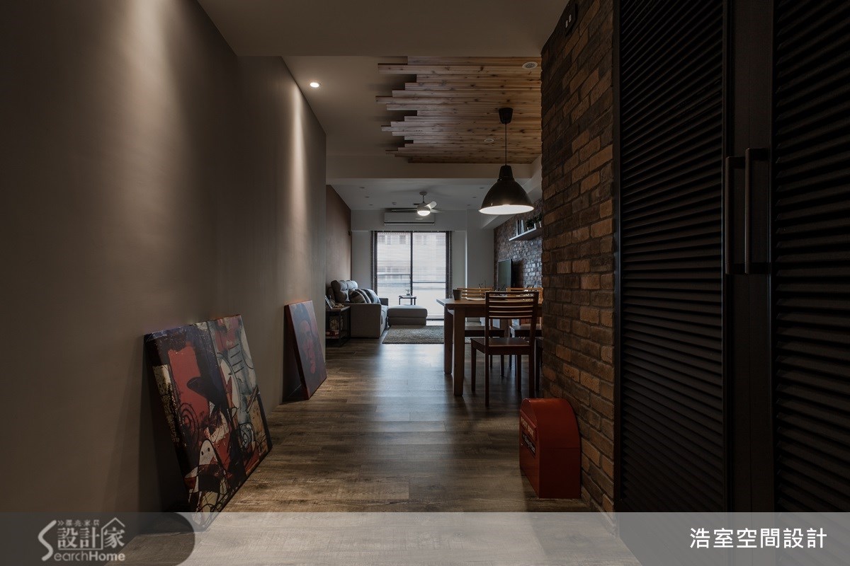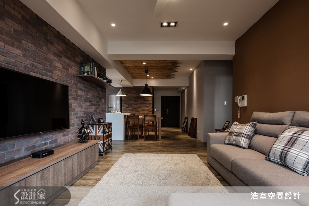 在83平方米的小世界,也能体验满满的幸福。设计师替空间注入美式风格,采用大量的木质媒材、红砖文化石等,完美搭配出疗愈人心的大地色彩,使居家散发着宛如街头咖啡馆的氛围,让屋主夫妻婚后也能随时在家约会,一起品味香浓的咖啡,享受不被打扰的双人世界。【舒适格局让小家更有爱】走进玄关即见鞋柜结合墙面的设计,在满足收纳的同时也维持平整立面;客、餐厅则采开放式格局,透过百叶落地窗调节自然光源,营造出不同的光影氛围,缓解狭长格局的压迫感,而客厅的红砖电视墙,搭配简约的木质层板与视听柜,呈现出率性的个人风格。餐厅天花板以不规则的木条陈列,让空间线条更添活泼,中岛吧台则作为餐厅、厨房间的界定,同时结合木长桌延伸用餐台面;卧房区则善用畸零地,打造出不少实用的收纳柜体,并将书桌配置在角窗前,结合柜体、展示台面,形成围绕整个墙面的流畅设计! 书房呼应整个居宅的调性,采墨绿色作为墙面色彩,并摆放不加修饰的原木书桌椅,活动式设计使空间配置更弹性,在卧榻沙发、明亮采光的搭配下,呈现了超疗愈纾压的气息!