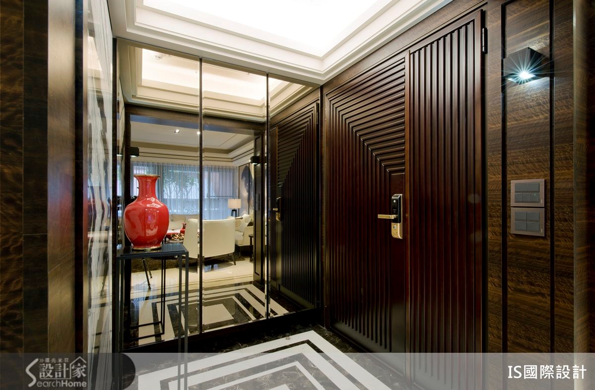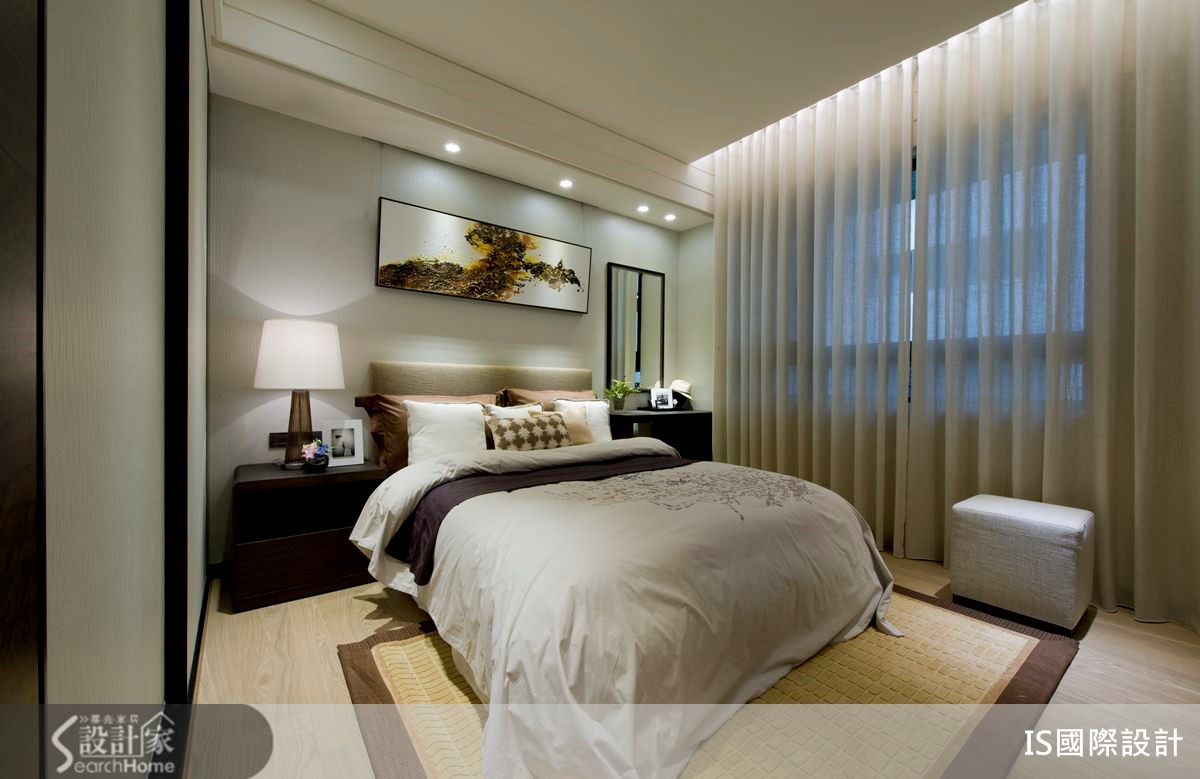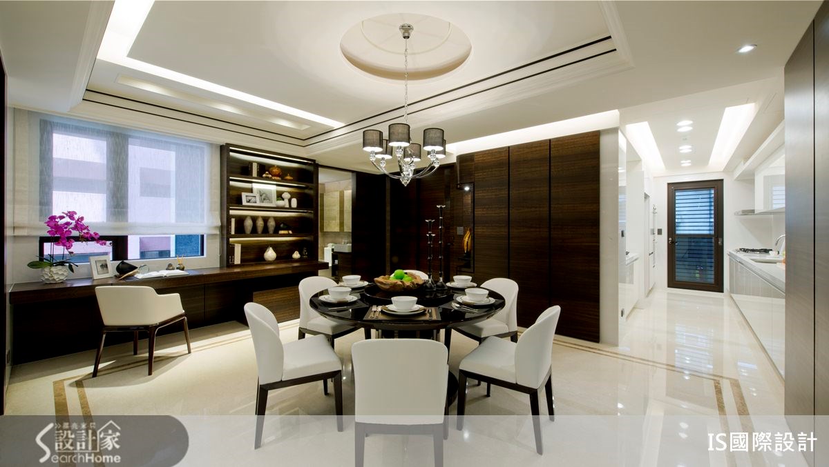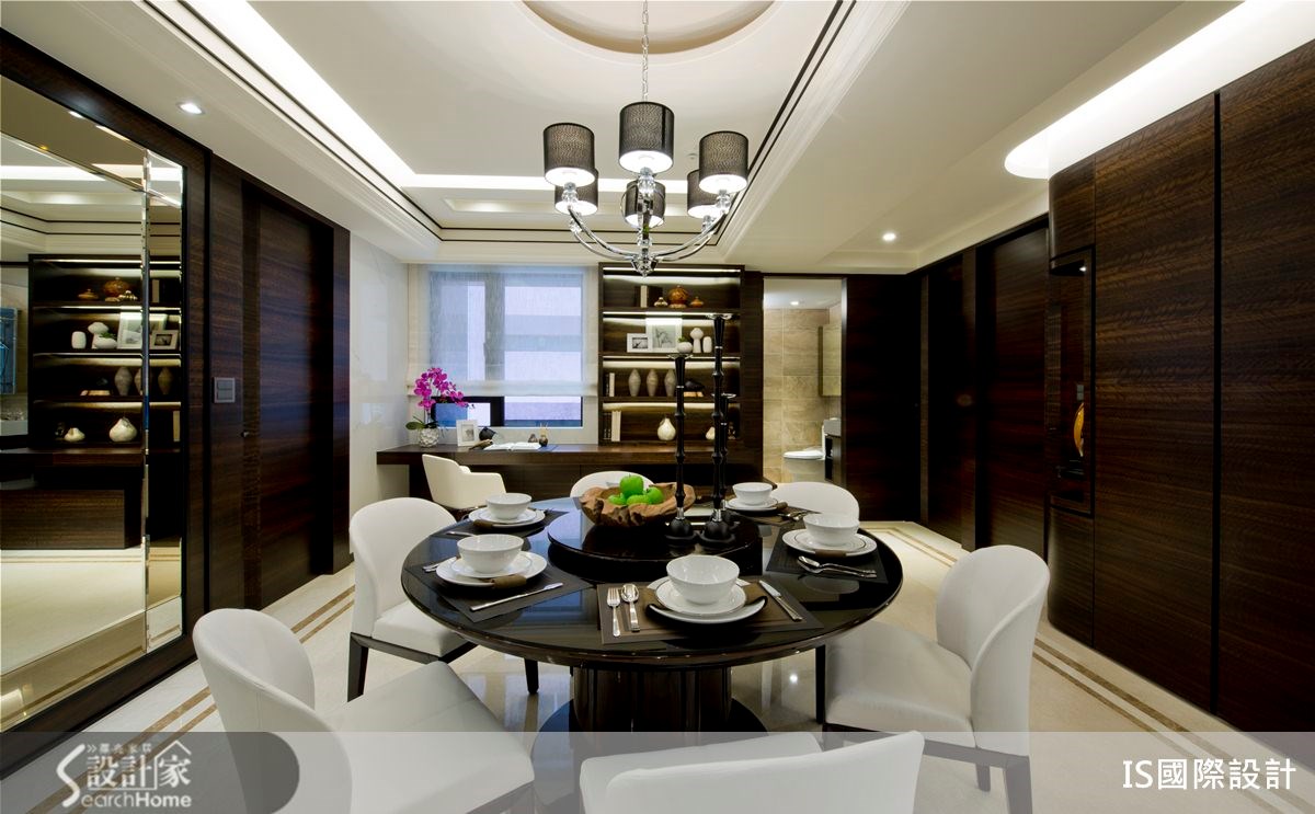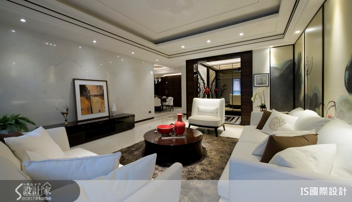 你所追求的豪宅,是"大器感"还是"大户型"?这间4室2厅的住宅,在这129平方米的空间里,该如何拥有豪宅感受?设计师将雪白碧玉、香槟玫瑰、金镶玉等大理石材,以恰当的比例分配运用于空间之中,并佐以深色木质、镜面材质,打造出充满稳重感的中式人文宅。【水墨画上墙,尽显大器范】走进129平方米的空间里,客厅以纯白色定调,搭配沙发墙的整面水墨图像,传递出浓浓的中式古典风情,同时在天花线板、大理石地坪拉出深色线条,加深轮廓与层次,展现公共领域的大器范。走进餐厅,以圆形餐桌和圆天花板设计作为空间中心,表达了中式圆满之美。并配置一面镜面墙,创造双倍的空间感。居室门片则隐于深色木色墙体中,使空间完整不零碎,一旁还将书桌台面结合展示柜体,以贴墙方式打造开放式书房,精简了不少地坪空间。主卧室、次卧室皆以木质地坪铺陈,以浅色为主体色调,搭配深色木皮材质,勾勒出稳重美感,并将水墨画作为床头墙主视觉,彰显内敛不张扬的艺术品味。