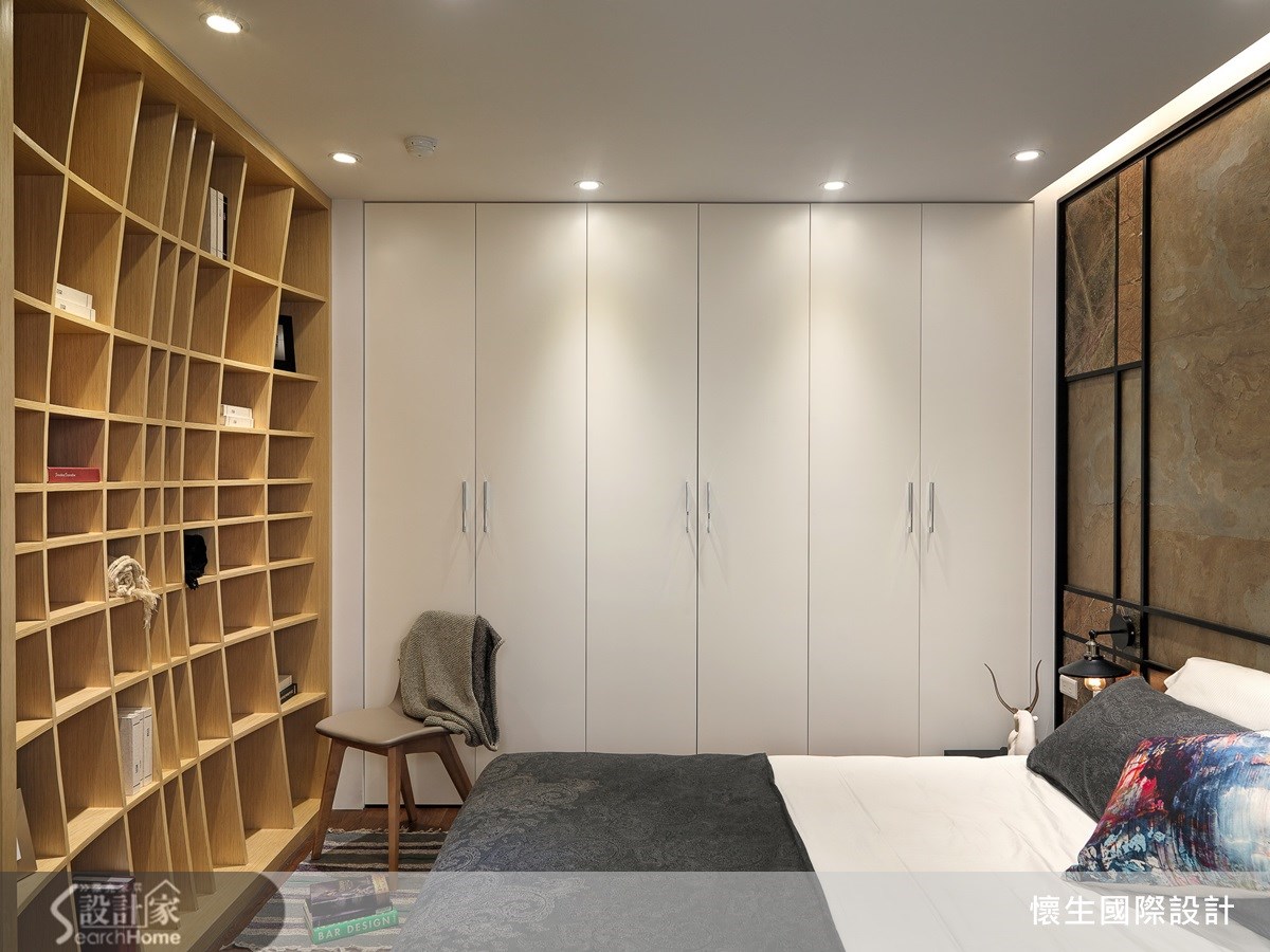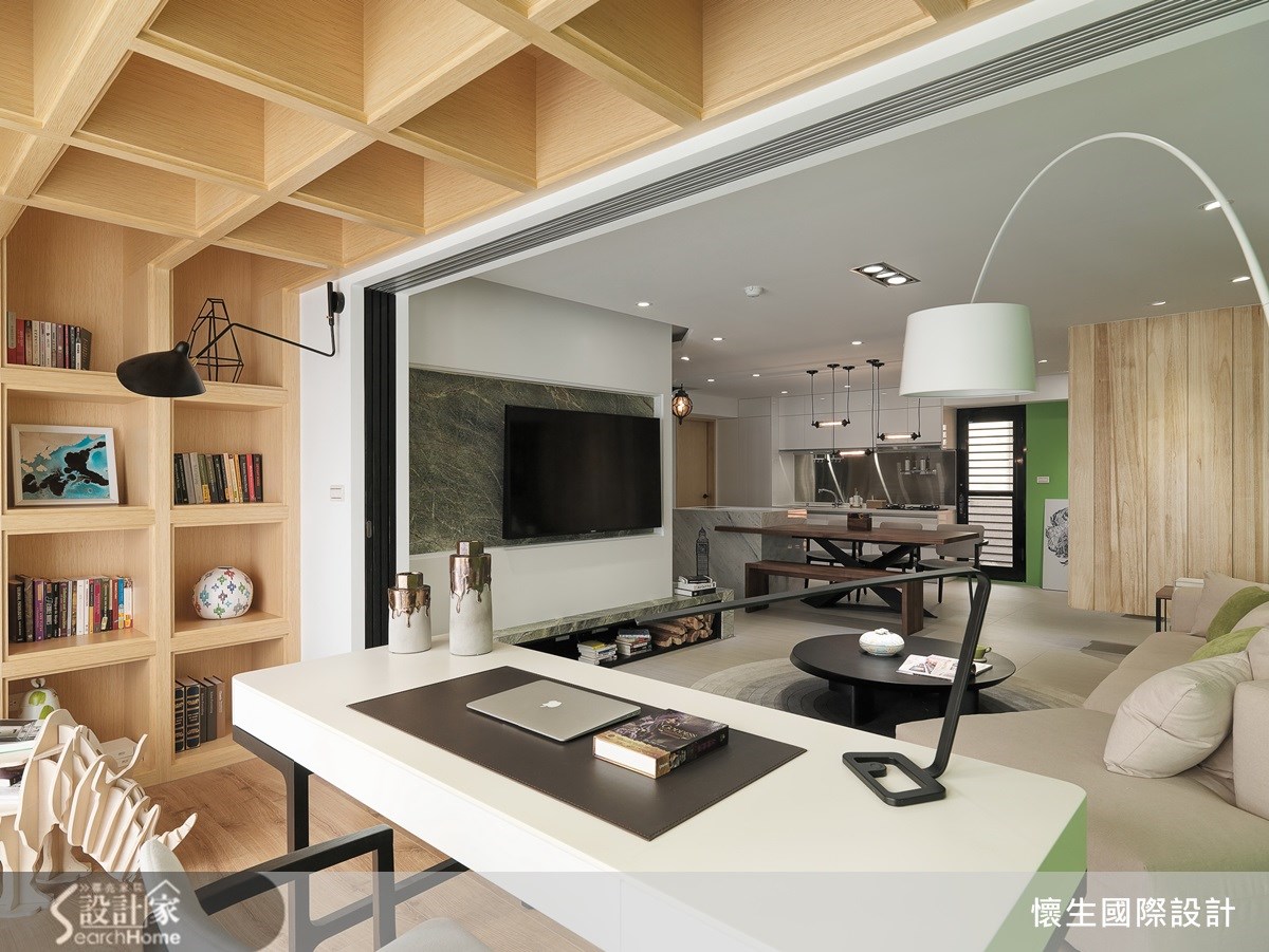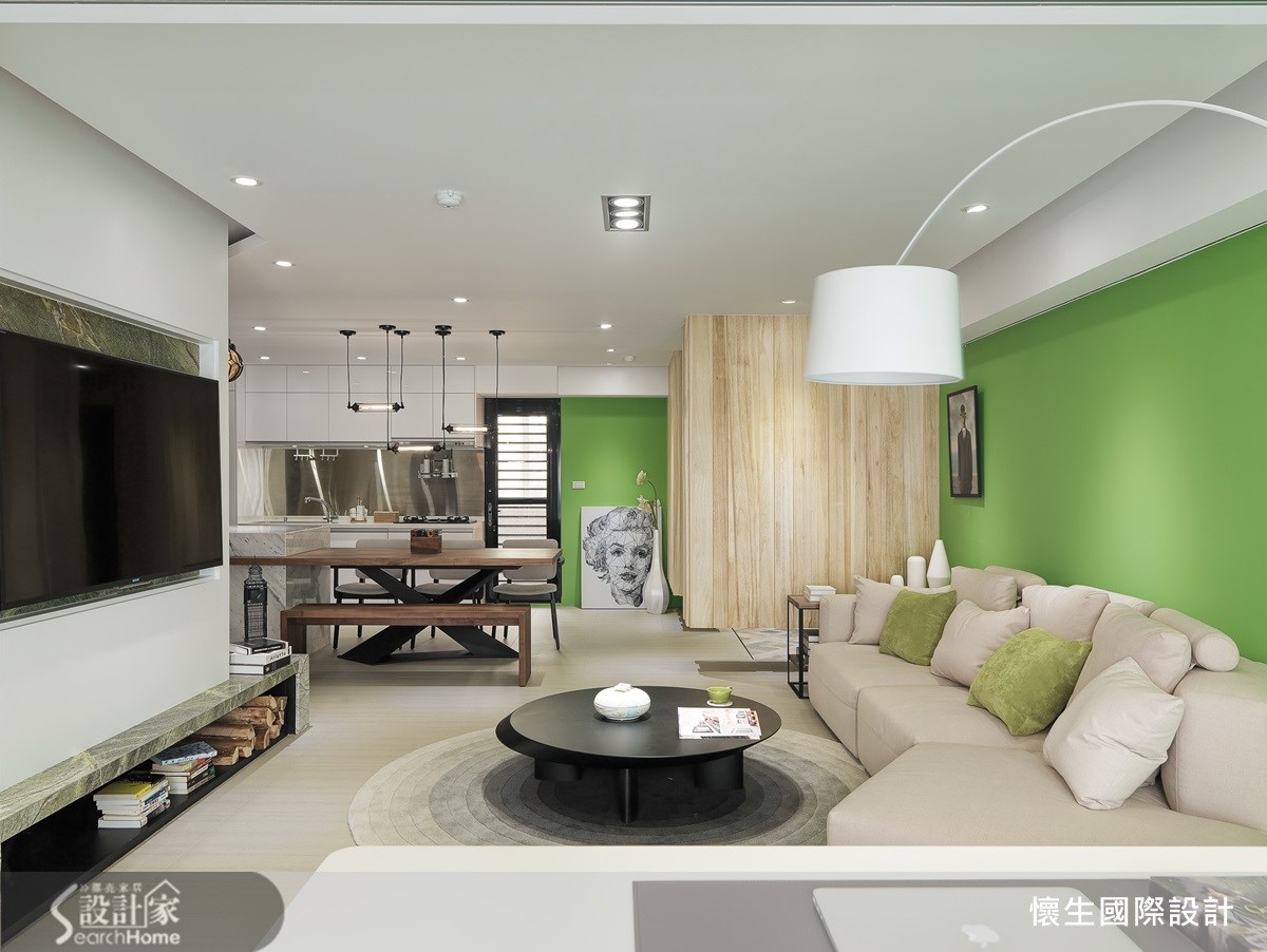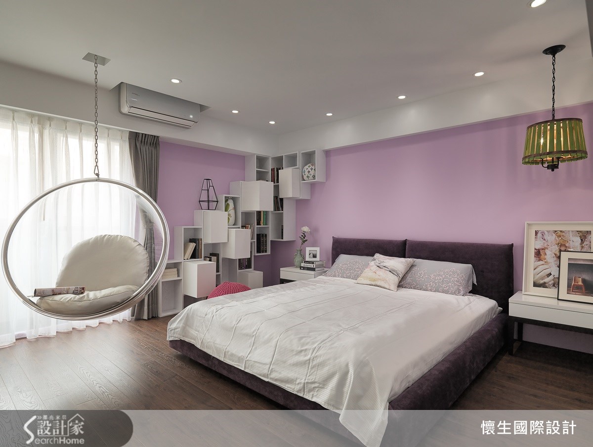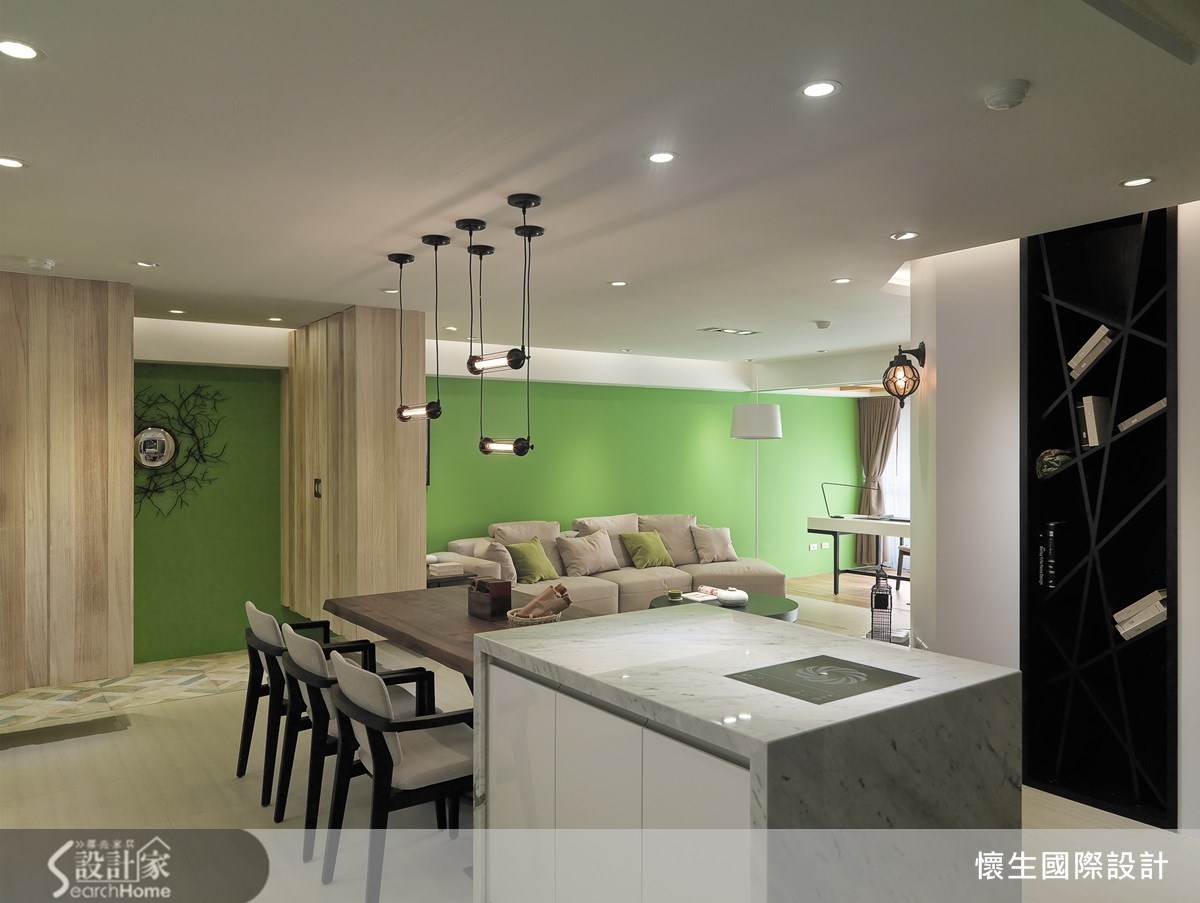 3室2厅的老屋,屋主将这间房子作为礼物,送给她两个永不变心的忠实情人"书籍"和"宠物"。在空间中,不只具有大量的书柜空间,更添加体贴爱猫的设计,并注入超清新的色彩,打造出单身女子的知性生活!【清新绿色与木质,营造疗愈印象】165平方米居家中,即可见到玄关墙配置的造型镜子,透过树枝营造的自然意象,搭配鞋柜的温润木质,营造清新感受;公共区域以绿漆打造主墙,让跳跃色彩从书房、客厅、玄关延续至餐厨,使绿意延伸在整个开放式空间中,营造疗愈风格。【内嵌式书柜,让阅读无所不在】在客厅、书房间,设计可弹性变化的隔屏,不只可切分领域,更让光线自由穿透延伸,保有明亮度,书房则将书墙连接天花板,满足女屋主的书籍收纳需求;连餐厨墙面,也做内嵌造型书柜,以不规则线条增添层次,让阅读无所不在。【书柜结合猫跳台,随时陪伴爱猫】主卧呈现浪漫的紫色调,空间里悬吊秋千吊椅,更将床边书柜与猫跳台做出结合,替女主人和爱猫量身打造每天的欢乐时光!