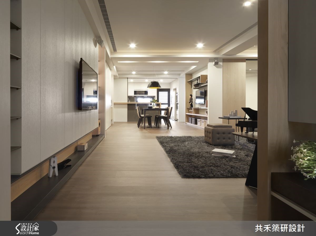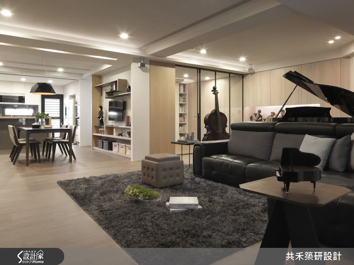 来到台中市北区的192平方米老屋,屋主是从事教育产业的夫妻,育有两个孩子,设计师体贴屋主的需求,特别强化屋宅内的收纳机能,并规划一间孩子的复健治疗室,以现代风为基调,同时注入音乐元素,运用环境与音乐,疗愈一家人的心。 【大面积玻璃隔断,延伸透透感受】客厅采木质地板铺陈空间,传递温润气氛,电视墙体呈直线条设计,宛如美丽的钢琴白键,并在墙面两侧结合隔板,增加居家的收纳机能性。沙发后放置一架钢琴,成为家中传递疗愈力量的中心。餐厅以吧台区隔餐厅与厨房,置物柜体透过铁件、木质交错而成,在墙上勾勒出现代感的线条之美;书房门片以铁件为框架,搭配大面积清玻璃材质,保有阅读的安静,同时延伸空间通透度。
