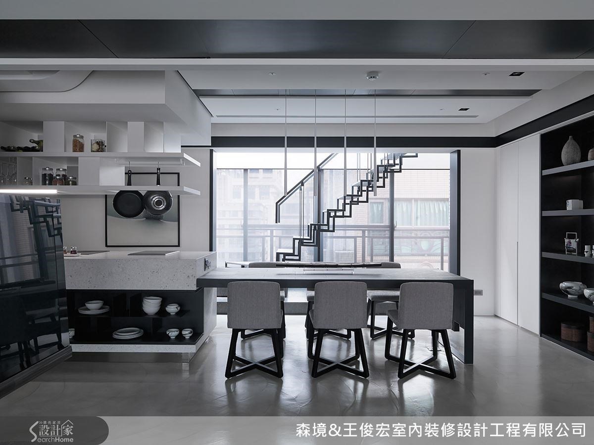 将扎实的混凝土梯,改为细致的线条,让想像中的厚重材质看起来变得轻盈。同时,镂空的楼梯设计,也让光线自在悠游于公共空间,再透过开放式客厅、餐厅和厨房,让空间变得更大器。
