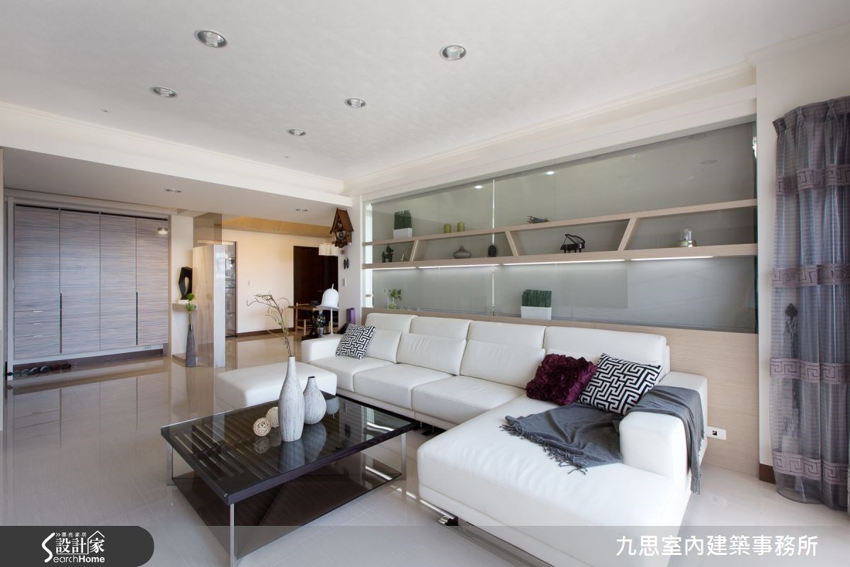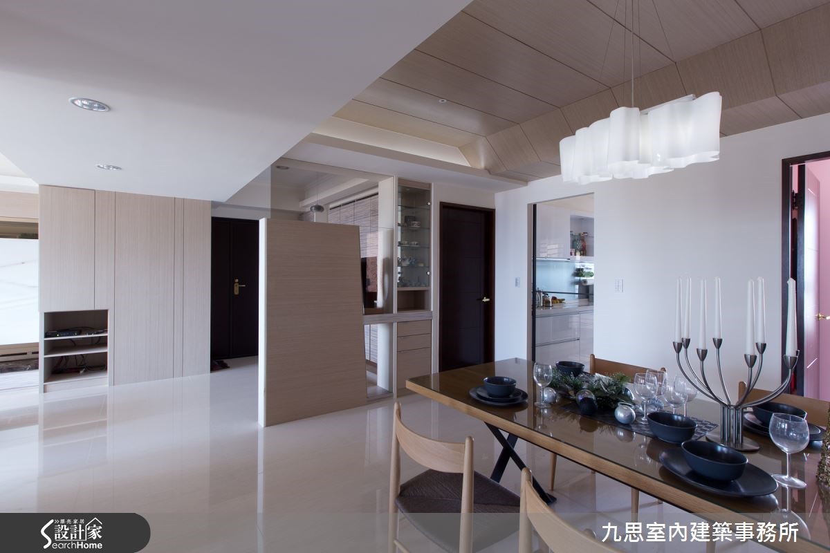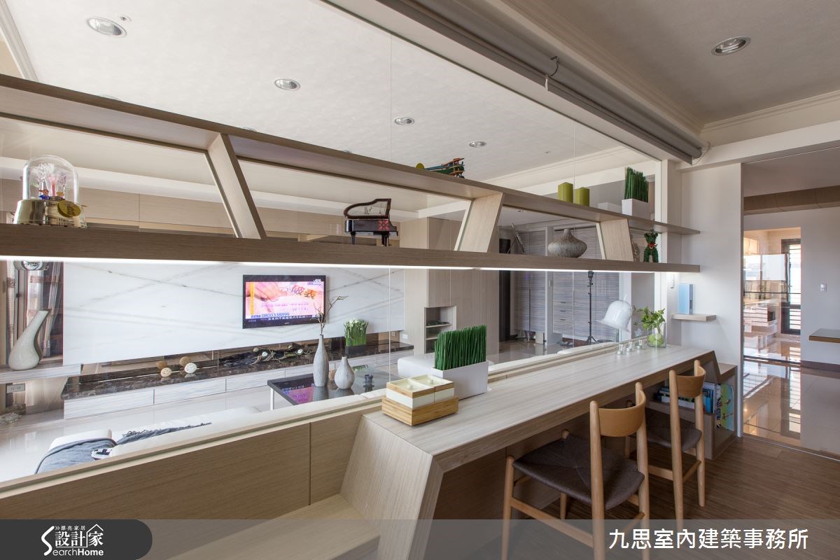 在秋天午后,一起沐浴在难得的温暖阳光下,品尝生活的惬意吧!在这户138平方米的住宅,设计师延揽满满的自然阳光,让公共领域充满幸福且明亮的氛围,同时佐以木质、大理石等天然感材质,打造出幸福的四口之家。【自然光衬托木质石材,怡然纾压】4室2厅的居宅空间里,客厅配置大面积的落地窗,搭配粉色透光窗纱,让引进的自然光更显纾压;透过象牙色沙发、白色大理石电视墙等配置,空间呈现隐约的层次美感。沙发背墙则采用清玻材质,视线可无阻碍地穿透至后方书房。书房区域延揽丰沛采光,打造出清爽的阅读气氛,同时在玻璃墙面结合木质隔板及书桌,于上方设计弹性垂降的屏幕,让阅读空间也保有隐私性。在玄关处,设计师作出一面屏风,化解入门见餐厅的风水问题,并透过玻璃材质缓及视觉阻碍,正面采大理石结合艺术造景,营造开门见山的大器感;而屏风背向则采用木材质,呼应餐厅的温馨气氛。来到卧室区域,以浅藕色调营造居室的纾压感,并在窗边配置一排休憩座椅,床尾规划贴墙的白色展示平台,透过矩形与线条,勾勒出现代风美感,同时刻意采用低矮设计,创造出无距离的亲切感。