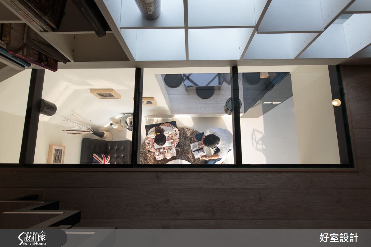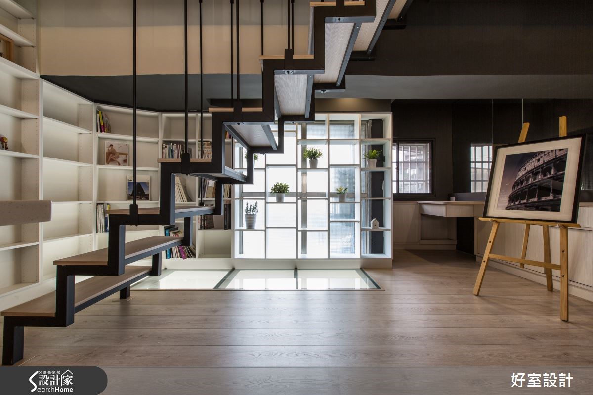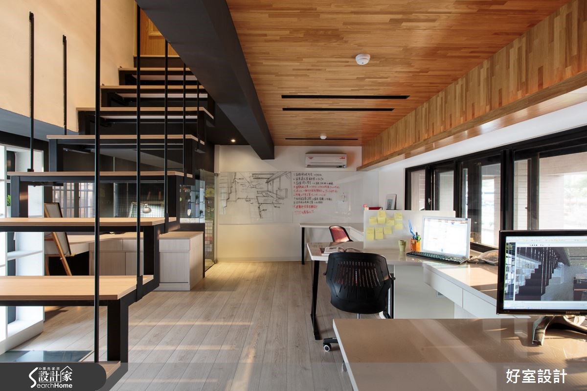 这户是设计师的个人工作室,有别于一般商业空间的格局,去除了整齐的隔板与工作桌,避免写字楼的制式及冰冷;并利用经典家具与丰富色彩打造居家情境,让访客感受在家般的舒适自在。【居家情境模拟,体会设计用心】一楼的空间以交谊会客为主要机能,提供访客与设计师讨论交流的空间。设计师以黑白为主要色系,铺陈出简洁利落的空间氛围,同时透过整面落地窗将户外景色与日光纳入室内,创造出开阔延伸的格局。一旁以黑色沙发与棕色地毯,营造简约柔和的客厅,搭配墙上相框传递出家的惬意与自在。餐厨以四人座的白色中岛与黑色个性吊灯,予人时尚大器的气息。利用居家情境模拟,让访客感受设计师的巧思妙手。客厅后方则是利用窗户打造出简约禅风的飘窗区,或卧或坐都满足身心灵与自然的互动。空间的另一角落则是木质吧台与设计单椅,除了操作台面,水族箱的配置也增添生命力。 二楼空间则是设计师的主要工作区域,以超耐磨地板铺陈朴实气息,而柚木天花板和粉色墙面相映,让空间更为活泼。嵌入透明钢化玻璃的一角,成为上下楼层互动的窗井。同时透过整面开窗与展示柜,以及通往三楼的黑色铁件楼梯,展现明亮采光与简约的设计精神。
