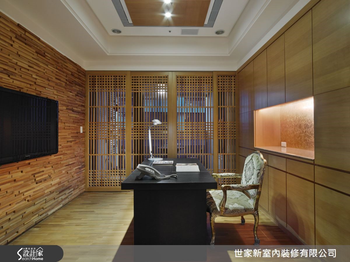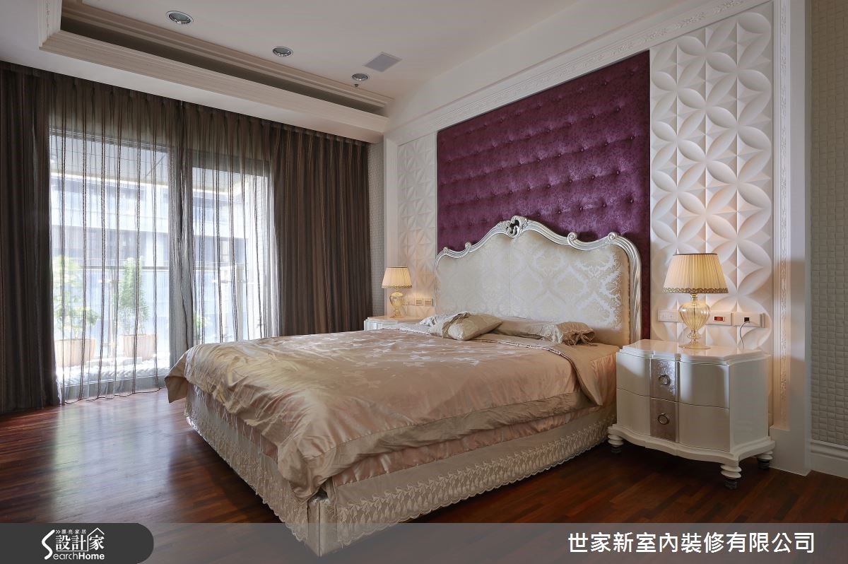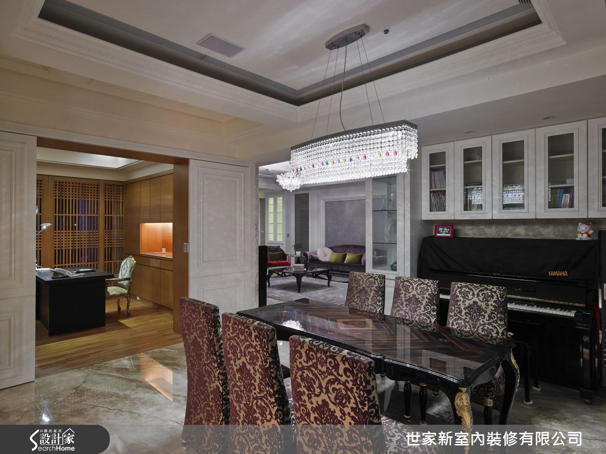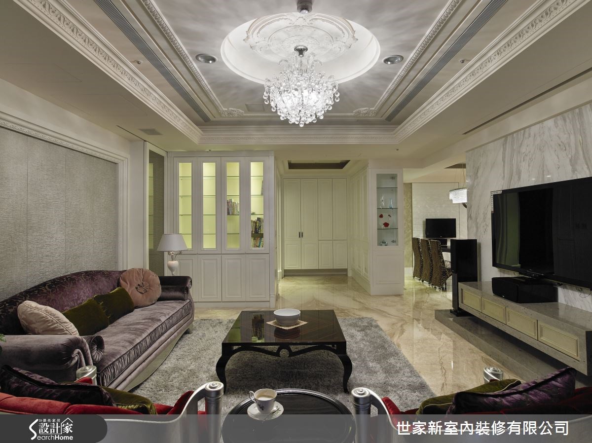 来到这间231平方米大宅,可见到居家充满精雕细琢的巧思。设计师加入线板、石材等材质,再搭配奢华感的灯饰、沙发,替空间妆点出华丽的宫廷气息,呈现新古典的层次美感。快跟着小编走进这个家,体验贵族般的生活吧。【轻奢材质,展现大器范】走进客厅,设计师以一盏华丽水晶灯作为天花板焦点,中央采圆形内凹设计,搭配线板框架,在隐藏冷气出风口的同时,也堆叠出公共领域的精致层次。并以大理石打造电视主墙与地板,大器且不失自然风韵。客厅整体虽呈现浅色主调,却刻意配置古典造型沙发,透过深色的天鹅绒材质,注入贵族的专属质感。厨房则以吧台作为餐厅、厨房之间的界定,吧台运用镜面和灯箱设计,创造出典雅的用餐氛围。主卧空间则充满宫廷气势,紫红色的床头绷布让视线聚焦,替寝卧注入优雅感。并在床尾处配置活动式电视墙。推拉门的设计使空间机能更弹性,也让梳妆和卫浴空间隐于其后,做出完善的动线规划。