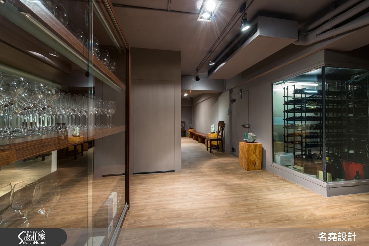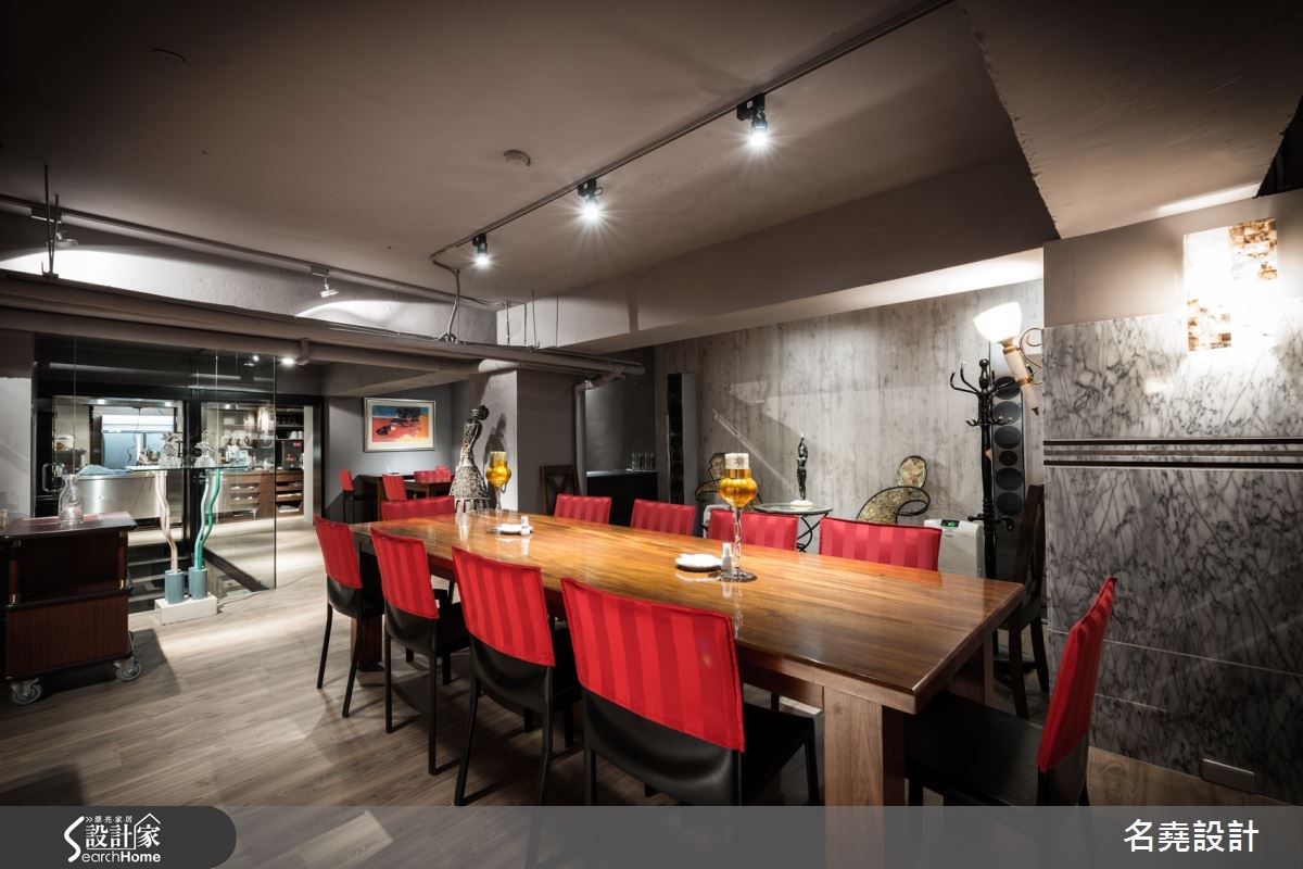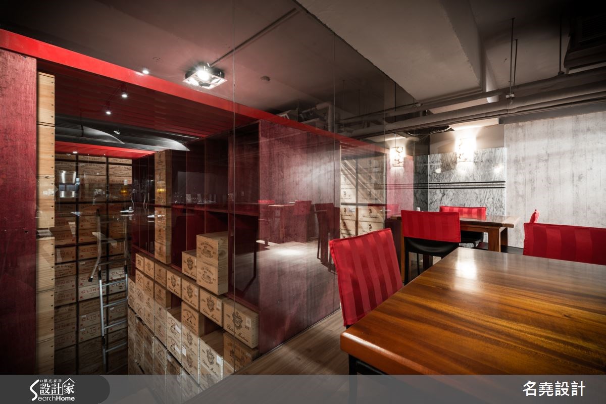来到酒窖餐厅,设计师将店内规画成现代风商业空间,以代表甘醇美酒的红色作为焦点色彩,不只做足收纳设计,配置出完美的酒类收藏区,更搭配餐桌椅与艺术摆设,陈列出宛如艺廊般的用餐环境,打造出酒饕的梦幻殿堂。 【清水模灰打底,造高冷腔调】跃层设计的185平方米商业空间,将餐厅配置在地下一楼,走下楼,可见到大面积的玻璃收纳柜体,替酒杯做了完好的陈列规划。并透过清玻材质围塑厨房,打造出透明开放的烹饪环境,使料理过程可一览无遗。用餐空间则以大面积灰色作为空间基调,以粗犷裸露的天花板、仿清水模墙纸,呈现出自然不造作的氛围。采用木质餐桌打造温润的用餐气氛,餐椅则加入与"酒"形象相符的红色,替灰阶空间点缀一丝鲜明色彩。而这里不只是酒窖、餐厅,更于各角落添置艺术摆设,无论是楼梯旁的大幅画作、充满艺术气息的造型摆饰,都让这个商业空间处处是风景,充满了高雅品味。
