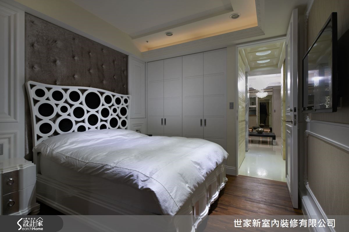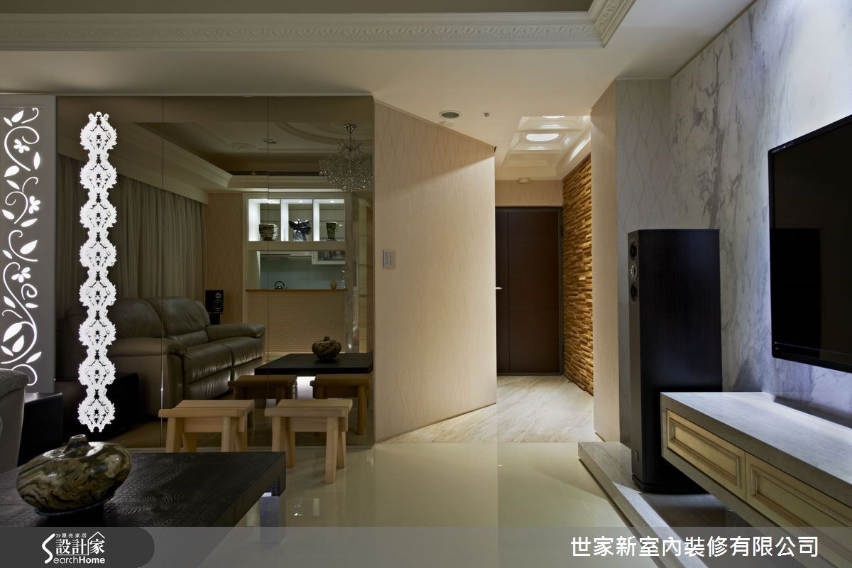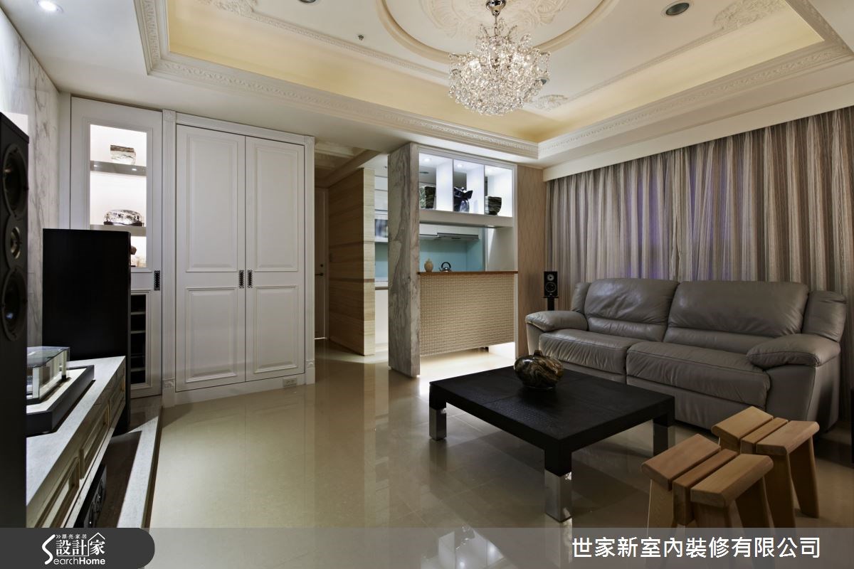 走进这间新古典奢华宅邸,却仅仅56平方米的格局,刻意将大理石、金箔等材质运用于空间中,堆砌出小空间的奢华范。并在客厅配置镜面墙,延伸整体空间,让屋主夫妻两人坐拥精致生活。 【注入古典雕花,更添雍容】玄关以浅色木质围塑,之后来到厨房领域,这里延续了木质清爽感,以活泼的蓝绿色作为焦点色彩,并运用浅色砖堆砌吧台,释放出活泼的餐厨氛围,吧台上方则配置开放柜体,不只可供摆放收藏珍品,更使餐厅、客厅之间通透无碍。来到客厅,则是崭新的奢华体验,天花板加入雕花线板与水晶吊灯,营造出经典的新古典风格。并刻意做了一面茶镜墙,扩容空间;再以白色大理石打造电视墙,同时将金箔材质结合视听柜,小户型也能造出雍容气度。在主卧房中,床头绷布选配藕色的质感面料,搭配高背双人床,营造出宫廷般的寝卧气氛,并刻意在床头板上注入黑白圆形的普普风元素,营造出华丽不失时尚的生活态度。