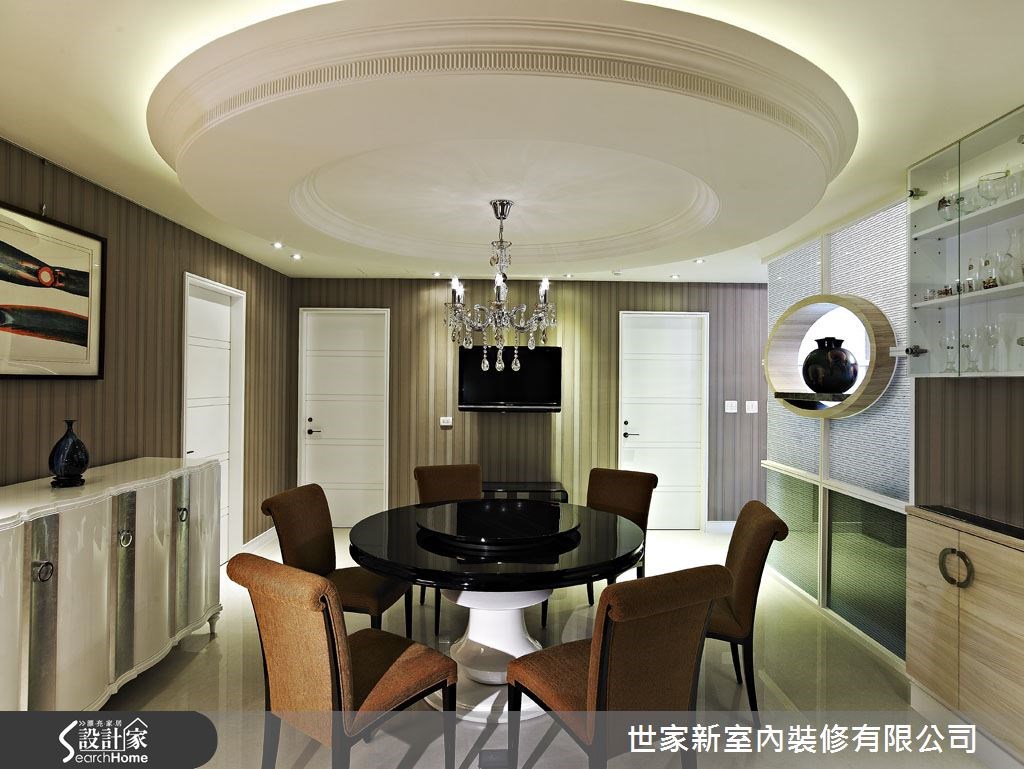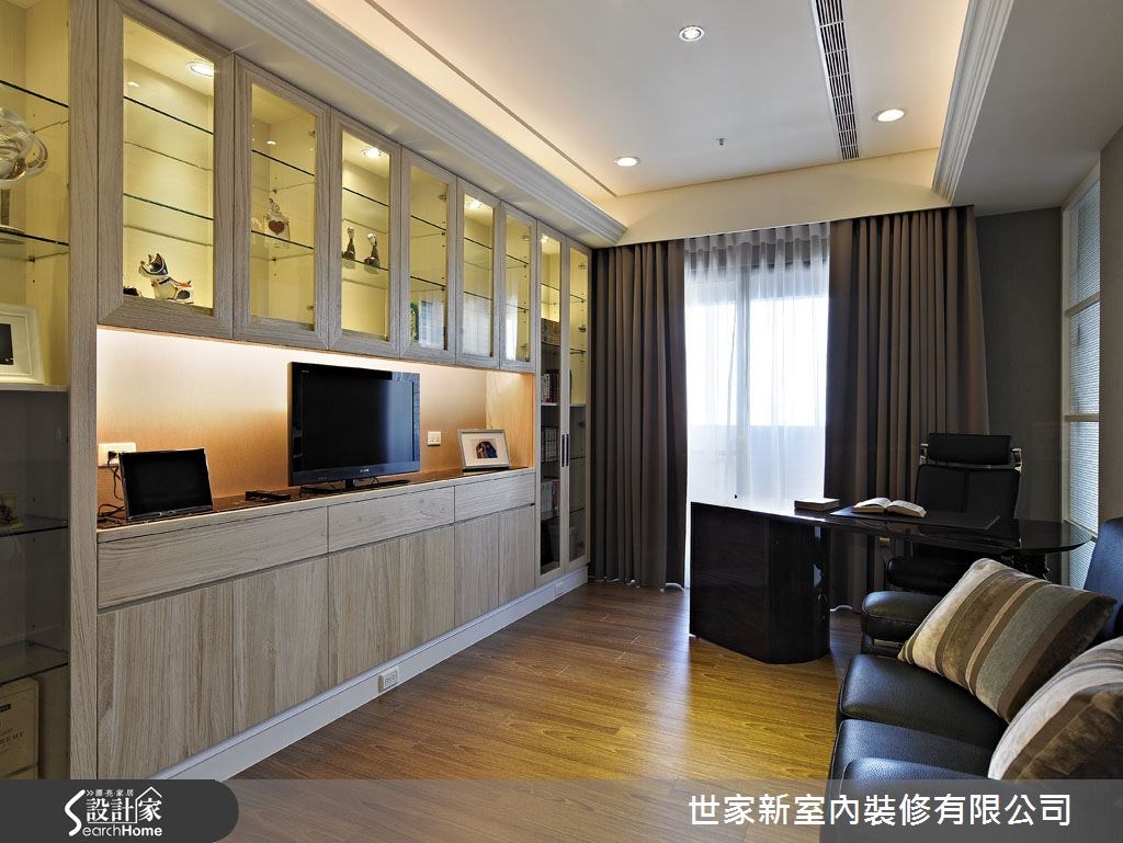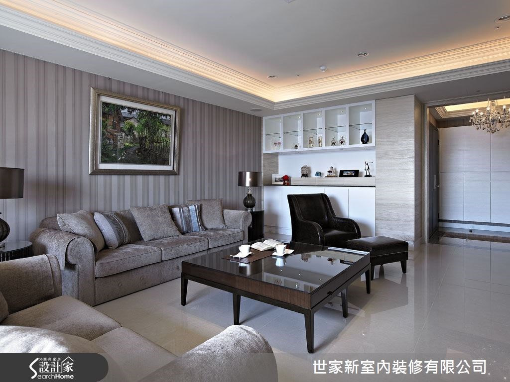 来到198平方米大宅中,设计师以新古典为定调,将本屋宅的设计重点放在居家机能与空间动线,并透过艺术品与灯光的完美搭配,创造出梦幻具有质感的居家气息。快跟小编一起走进这个家,一起共赏空间中的艺术展演吧! 【艺术品与灯光辉映的墙柜设计】走进客厅,可见到天花板间接光源、户外采光、大理石电视墙相互交织成米黄色阶,电视墙两侧并透过对称的柜体设计,加强收纳机能。沙发背墙则配置浅咖啡直条纹牆布,并透过线条设计拉高立面,创造不压迫的空间感。餐厅墙面嵌置艺术品并引入光线,并将墙面结合柜体,拼接各式通透材质与玻璃,使用餐氛围深具艺术质感。书房则铺叙大量木质,佐以深色木书桌,营造书卷气息,并在整面墙柜搭配柔和的间接光源,满足机能也营造美感。主卧空间則采用许多白色柜面与线条设计,充满了新古典的层次美感,也凝聚出舒適沉穩的好眠氛圍。并藉由白色衬托金色裱布床头墙,呈现低调华丽的风格。