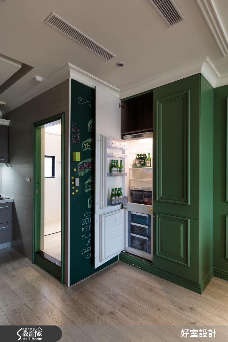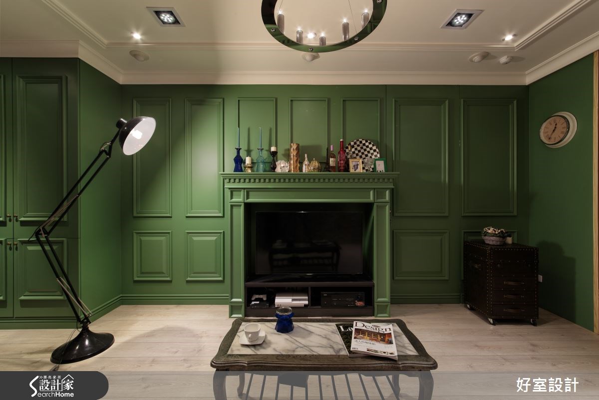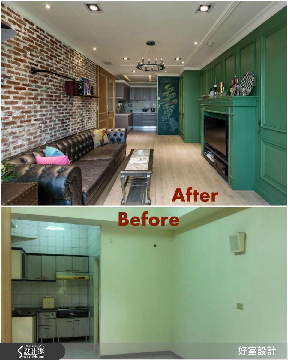 老屋的魅力在于,每个角落都充满了秘密与故事。这个69平米的小户型,设计师用红砖与绿墙翻玩空间,将老屋彻底改头换面,打造出宛如经典电影《天使爱美丽》中的红配绿画面,使空间内充满绮丽的欧美风情,快让我们一起去看看如此童趣的设计吧! 【复古家具和线板,进入怀旧氛围】走进客厅,设计师保留了老屋内的一面红砖墙,将旧物化为新颖设计。同时,配置了一整片草木绿的壁炉电视墙,而红绿的强烈对比,打造活泼的视觉体验。电视墙设计线板,搭配棕色古董皮沙发,展现经典美式的居家,营造温润质感的生活品味。在公共空间中,绿色电视墙一路从客厅延伸至厨房区域,将公领域做出完整串联;并发挥巧思将冰箱嵌进墙体中,透过弹性门片将家电隐于无形。一旁设计了黑板墙,不仅可在此记录生活点滴,更可透过涂鸦插画来美化居家。在靠窗处,架高木地板规划出一处飘窗区,并内藏收纳机能,透过良好采光与窗台小植栽的相互搭配,呼应了整体的绿意感设计。卧室则在床头处做出整排收纳区,扩增机能,床体也结合梳妆桌与镜面墙,成为一体的流畅设计。卧室原有的阳台改为更衣间,透过此区的采光优势,让衣物得以储放在此干爽不潮湿。并另外配置厚实的轨道窗帘,让寝卧区可拥有充足的采光,也可随心情调整安静的氛围。