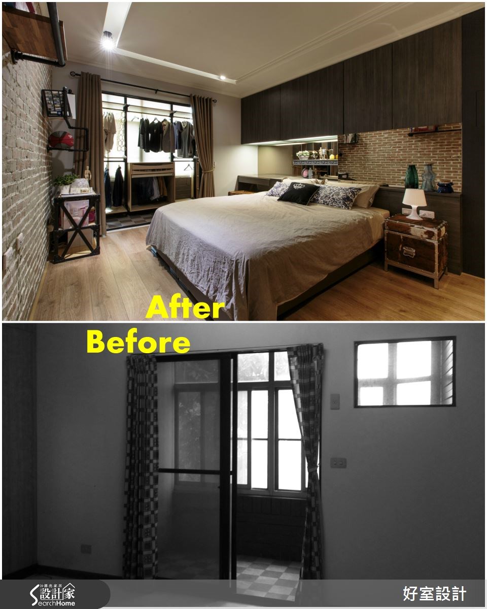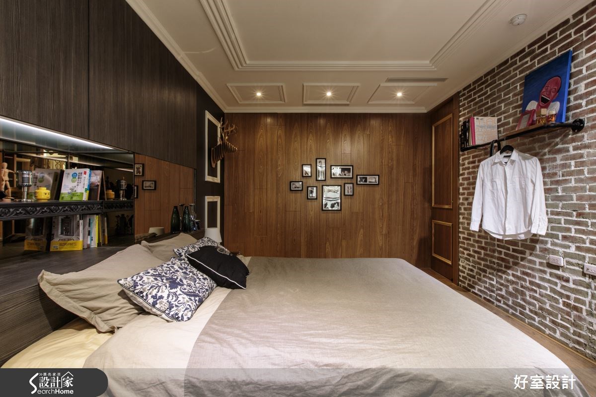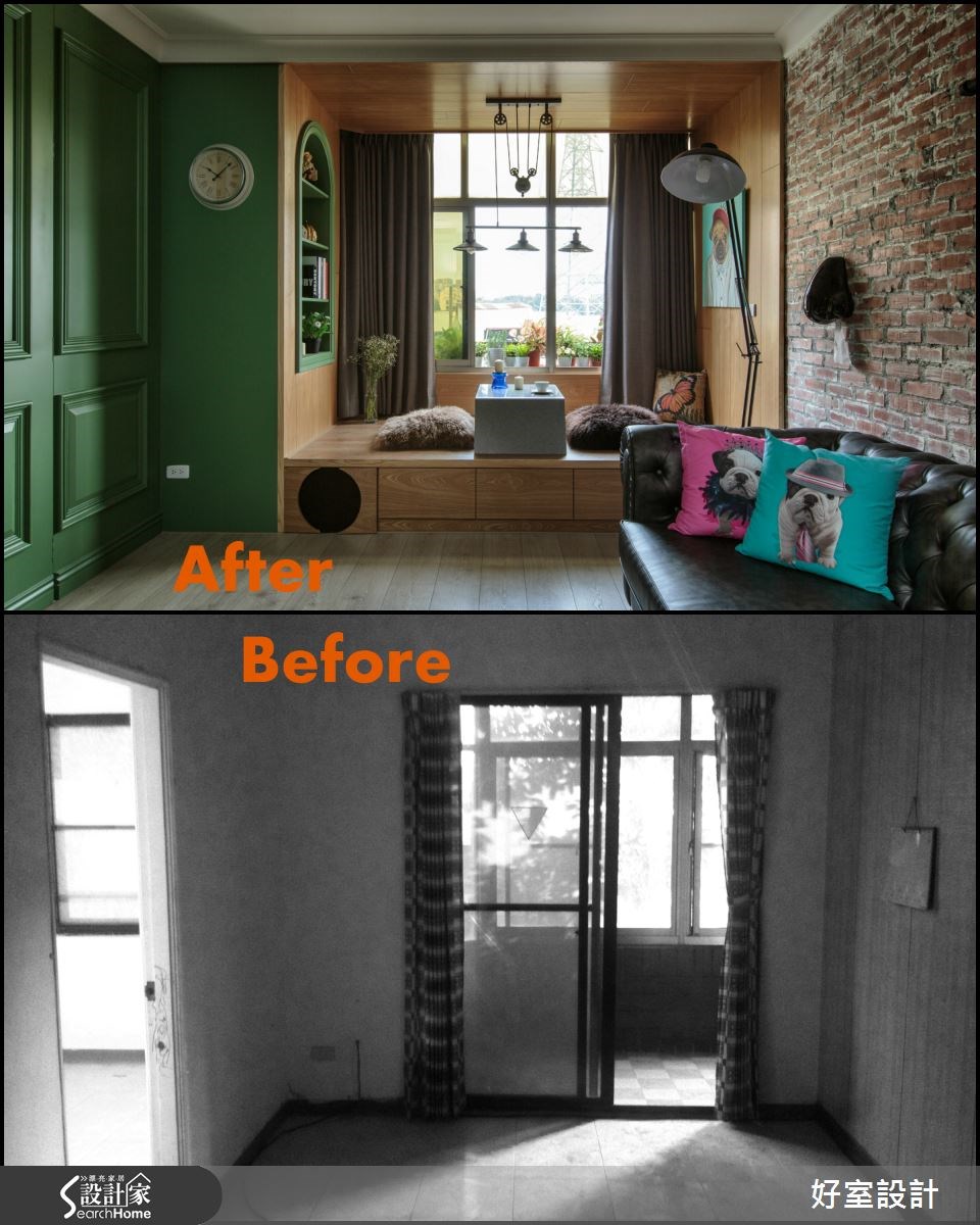 老屋的魅力在于,每个角落都充满了秘密与故事。这个69平米的小户型,设计师用红砖与绿墙翻玩空间,将老屋彻底改头换面,打造出宛如经典电影《天使爱美丽》中的红配绿画面,使空间内充满绮丽的欧美风情,快让我们一起去看看如此童趣的设计吧! 【复古家具和线板,进入怀旧氛围】走进客厅,设计师保留了老屋内的一面红砖墙,将旧物化为新颖设计。同时,配置了一整片草木绿的壁炉电视墙,而红绿的强烈对比,打造活泼的视觉体验。电视墙设计线板,搭配棕色古董皮沙发,展现经典美式的居家,营造温润质感的生活品味。在公共空间中,绿色电视墙一路从客厅延伸至厨房区域,将公领域做出完整串联;并发挥巧思将冰箱嵌进墙体中,透过弹性门片将家电隐于无形。一旁设计了黑板墙,不仅可在此记录生活点滴,更可透过涂鸦插画来美化居家。在靠窗处,架高木地板规划出一处飘窗区,并内藏收纳机能,透过良好采光与窗台小植栽的相互搭配,呼应了整体的绿意感设计。卧室则在床头处做出整排收纳区,扩增机能,床体也结合梳妆桌与镜面墙,成为一体的流畅设计。卧室原有的阳台改为更衣间,透过此区的采光优势,让衣物得以储放在此干爽不潮湿。并另外配置厚实的轨道窗帘,让寝卧区可拥有充足的采光,也可随心情调整安静的氛围。