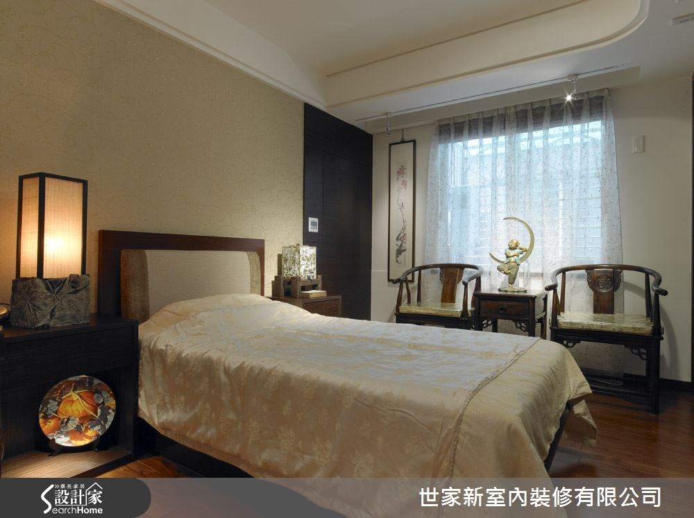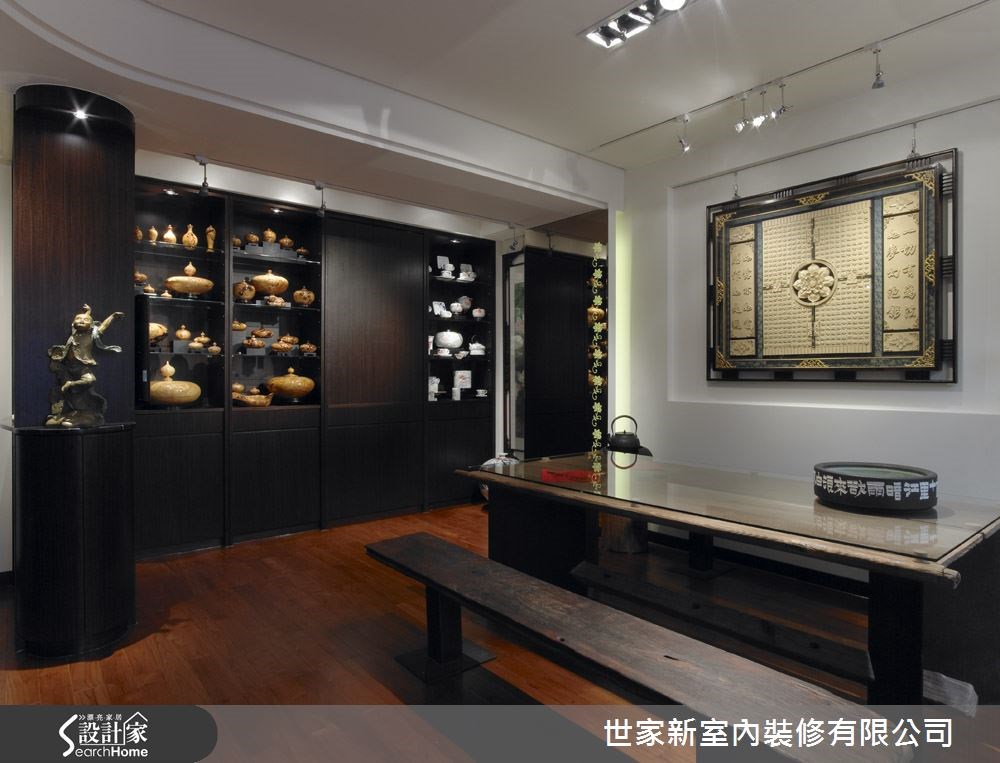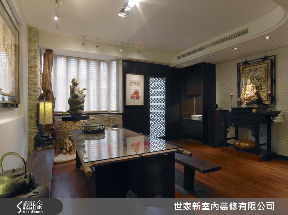 这是一间精舍,由于居住者为一位深具艺术涵养的法师,不仅喜爱佛像画作,更收藏名铜雕家法成宪、名雕刻家林三墨等名家珍品。于是设计师不仅替空间带入佛教的意境之美,更结合了画室与艺术品收藏等功能,打造出日式禅风居所。 【简约黑白色调,衬托艺术之美】走进玄关,可见到佛菩萨像的镜面背景,带出了开门见山的庄严气息。空间整体以木质地板铺陈,配空间中摆放的艺术雕像、地藏王菩萨像,呈现日式禅风与宗教之美。同时,透过雕花门片与窗户引进采光,将柔和的光影引进室内。画室主墙则悬挂着一幅木雕作品,呈现出精致细腻的木纹质感,底下则摆置一张质朴的木画桌,搭配上同色的长板凳椅子,颇有古色古香的气质,一旁墙面则设计了大面积收纳展示柜,用以摆放各式各样的收藏品,并将门片隐于墙体中。来到卧房,可感受到满满的儒雅气息,运用天花板内凹的间接灯光,搭配空间中的挂画、艺术品、日式灯饰等,不仅呈现居住者的高雅品味,更让每个角落都释放出艺术风采。