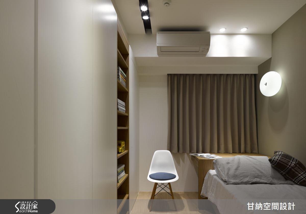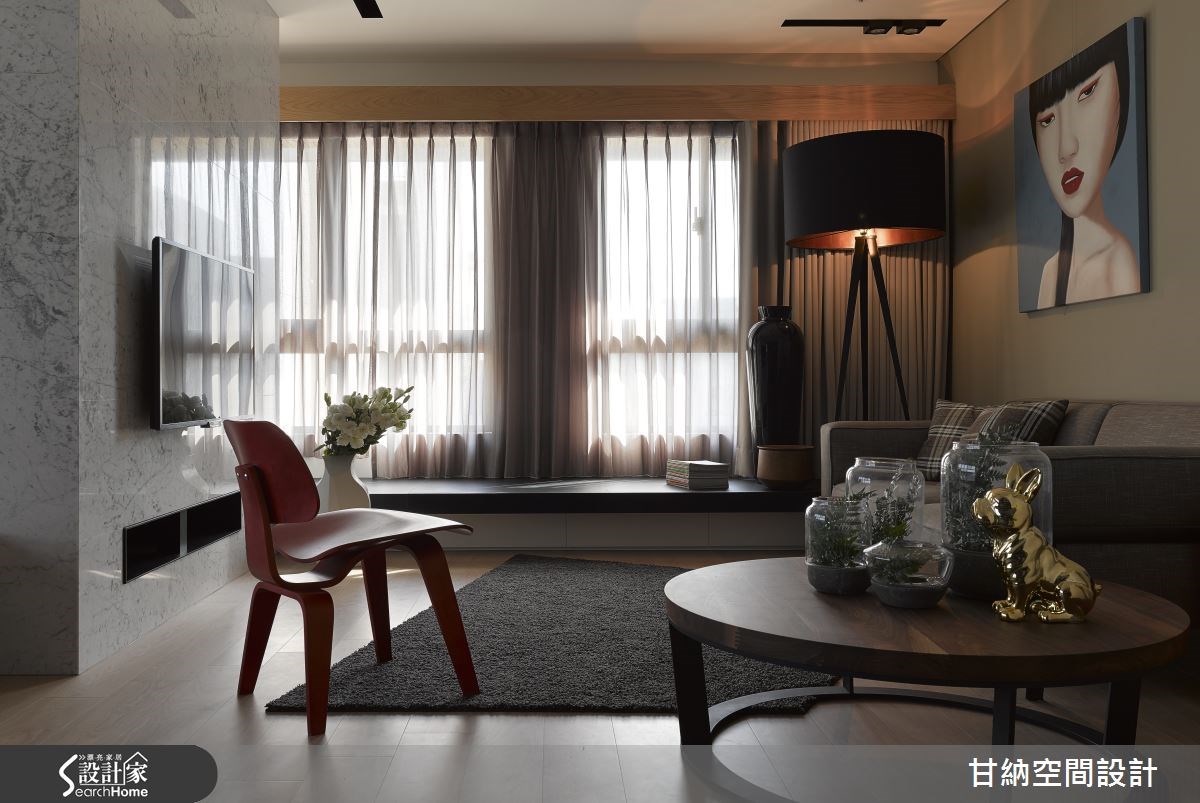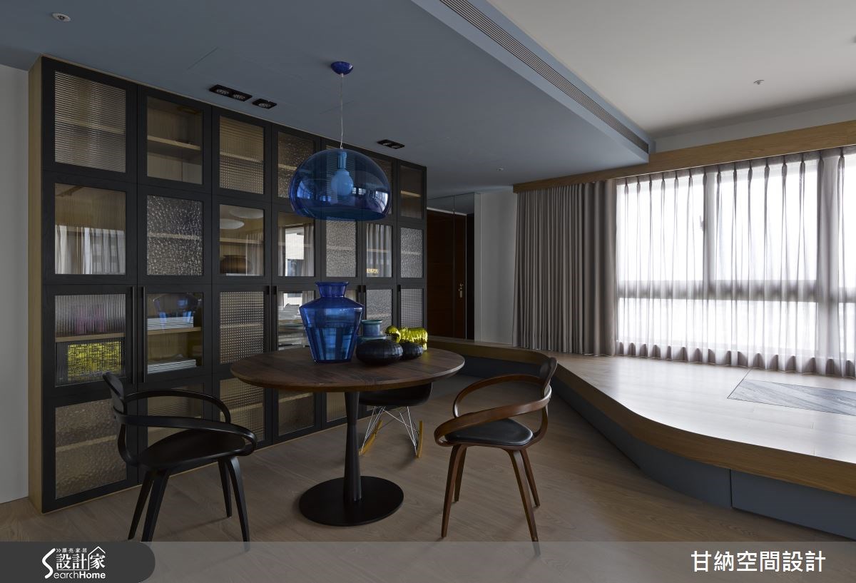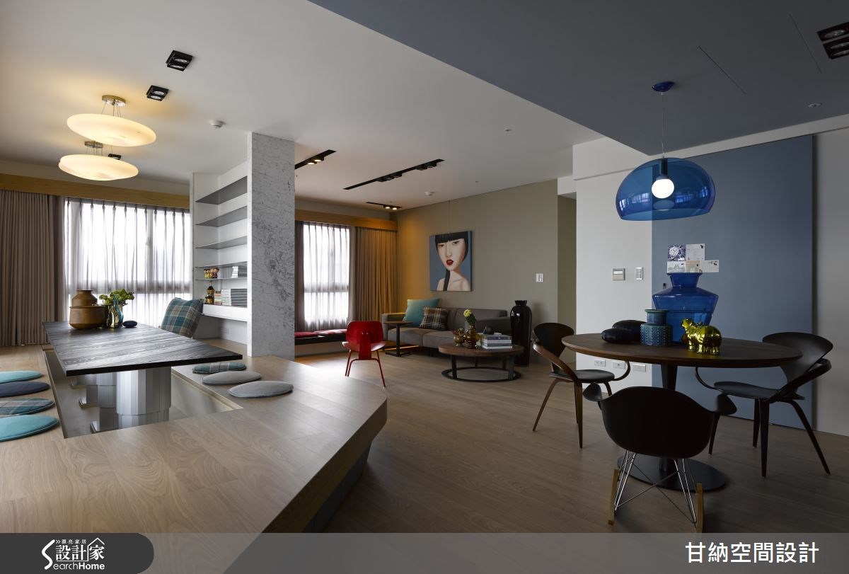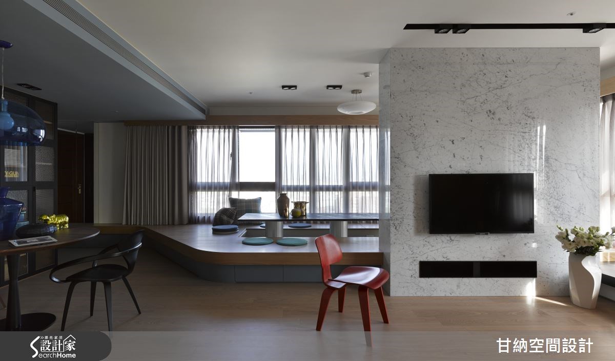 119平方米的空间运用多种设计风格呈现,为新居带来不一样的氛围。从玄关处进入以木作打造的弧形开放式和室空间,循着流畅优美的线条将人引领入室,看见的是开放式的公用区域,舍去不必要的墙体隔断,让宽阔的生活场域还给居住者使用。【开放格局,打造串联全家的空间】屋主一家期盼的客厅,不仅只是个看电视的空间而已,而是让全家人回归到联系情感的空间,因此设计师利用自然纹理的大理石电视墙,不以大面积的设计手法呈现,改以简单利落的垂直设计,减少了墙面的隔断延伸,释放出空间辽阔感。【落地窗引光入室,挥洒视觉飨宴】L型的落地窗让明亮的采光得以穿入室内,创造出温暖、自然的视觉感受;一旁以清玻璃结合木作柜体打造的大型收纳墙,清玻璃的穿透感让沉稳的书柜达到轻量的效果;起居空间以多元型态创造出多功能的使用空间,让居室结合阅读达到一室多机能的弹性设计。