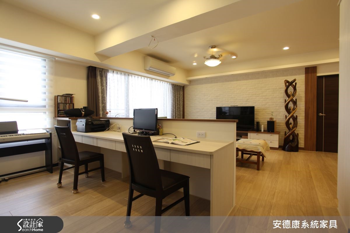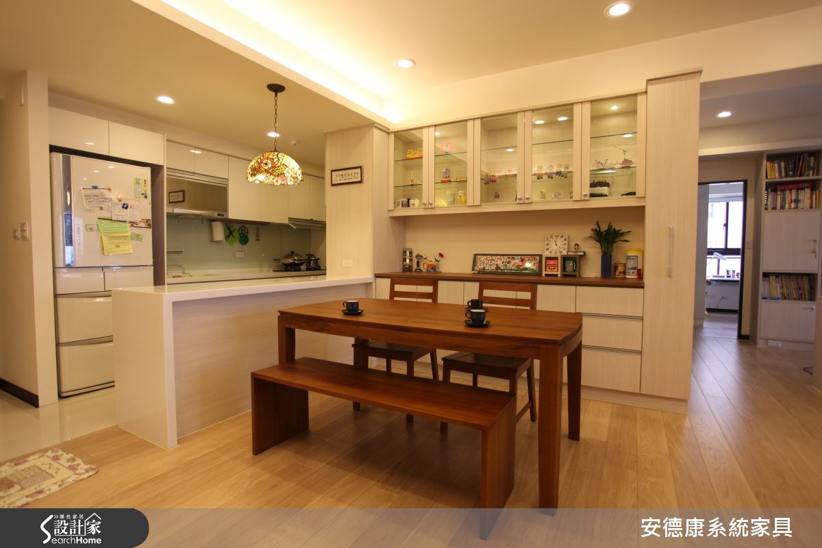 屋主曾旅居国外,对于空间美学有独到的见解与品味。在面对这个格局方正、采光佳、通风良好的家,还希望可以融入充足的收纳机能,并替2个孩子打造出居家游乐园。一起来看看设计师如何完成屋主梦想中的乡村风美宅吧。【添加大量木质,氛围更无压】走进4室2厅的空间中,可看到宽阔温暖的开放式格局,透过超耐磨地板的大面积铺陈,将公领域做出完整连结。同时,设计师刻意拆除书房与客厅部分墙面,压低墙的高度,让空间视线可延伸穿透。文化石电视墙底下则配置长形视听柜,满足收纳机能,并以木质框边搭配低矮木桌,替白色主调添注木色的温润质感。餐厅配置大片餐柜,门片结合具通透感的玻璃材质,创造不少收纳展示空间。并以L型吧台对应天花板的间接光源,做出餐厅与厨房的领域界定。书房位于窗户旁,并因开放格局坐享自由流通的光线与空气。同时,打造一面虚实交错的书柜作为背景,书籍成为妆点居家的美好色彩。卧室则将电视墙结合衣柜,将电视放进内凹的台面内,使墙面完整不突兀,营造素雅别致的寝卧氛围。