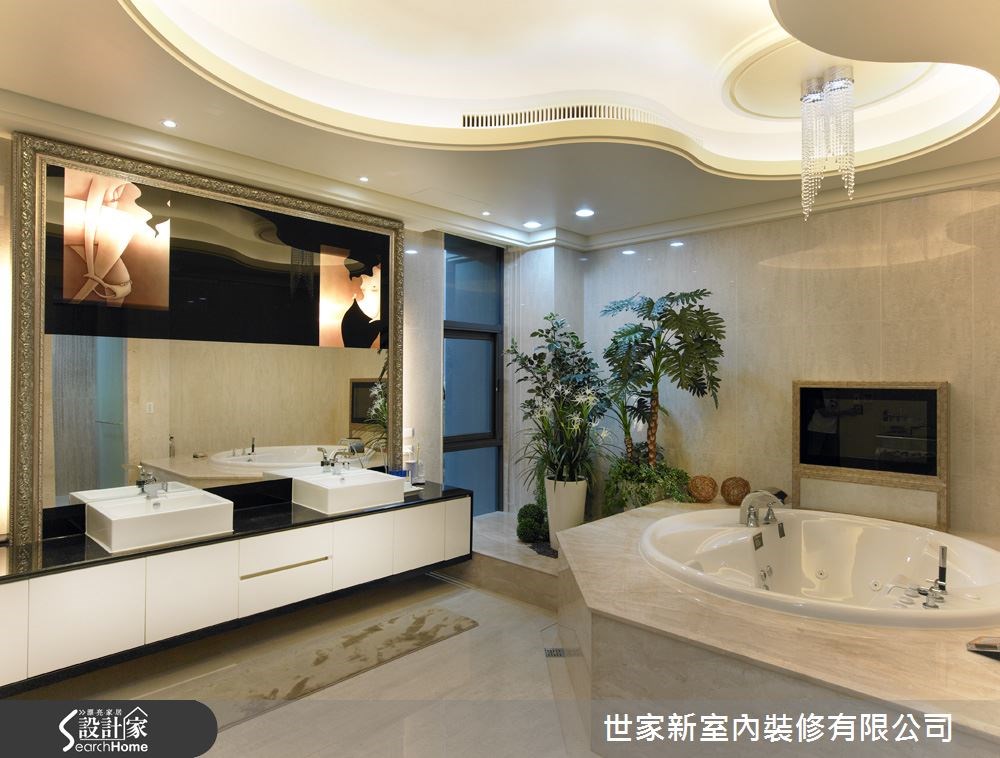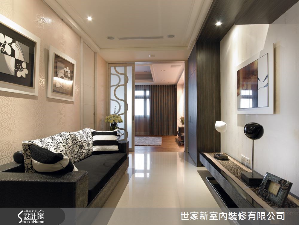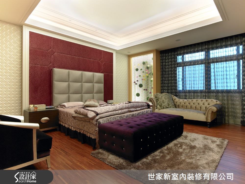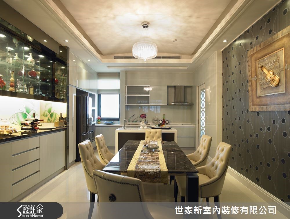 在这间结合办公与居宅的自地自建6层楼透天别墅,设计师透过合理的比例分配,营造出办公空间、居家公共空间与私领域的专属氛围;同时又将各领域接合,缔造公领域走进私领域的空间层次,一起走进瞧瞧吧! 【从办公到居宅,以电梯作切换】走进办公室会客区,金箔字画"精进"传递企业文化,释放尊贵雍容的气息。并透过木质格栅、内嵌台面的展示收藏,妆点会客区的典雅中式气息;长型会议室则配置间接光源,搭配墙面字画及鸟笼挂饰等物,带出艺术品味。搭乘电梯来到住家空间,设计师刻意装置电梯做出领域的切换,并设计充满质感的玄关,做出宁静的空间意象。客厅则透过米黄大理石电视墙,搭配同色系的皮革沙发,展现色彩和谐的空间感;并点缀天花线板,妆点新古典层次。以透明移门区隔客厅与餐厨领域,并规划出热炒区及轻食区。来到私领域主卧前,则会经过被视为过渡地带的起居室,以造型推拉门做两者之间的界定,主卧则配置红色床头板,与紫色绒布床尾椅,创造寝卧的焦点色彩。