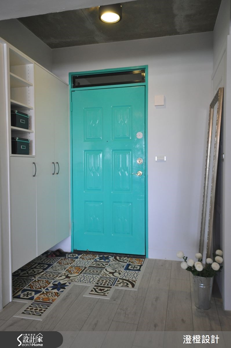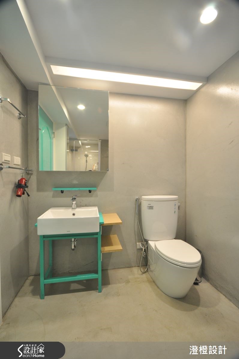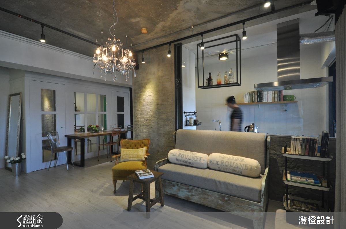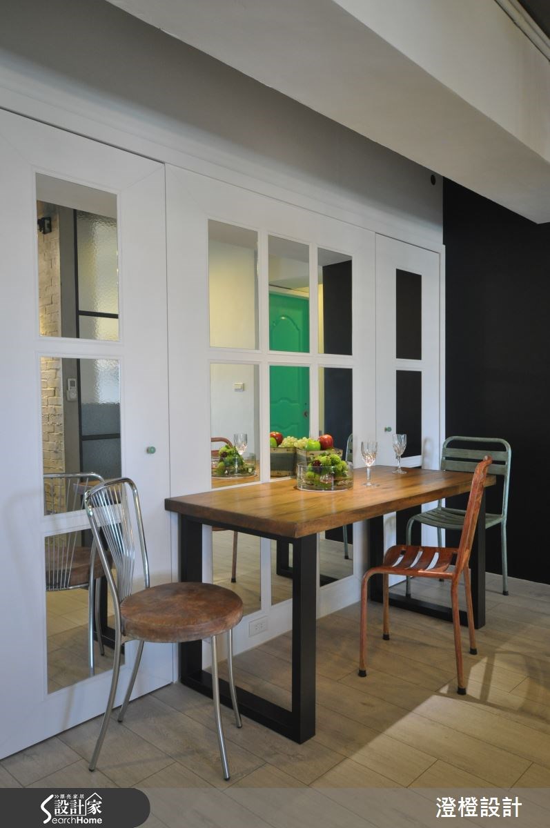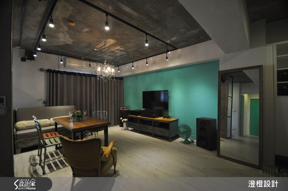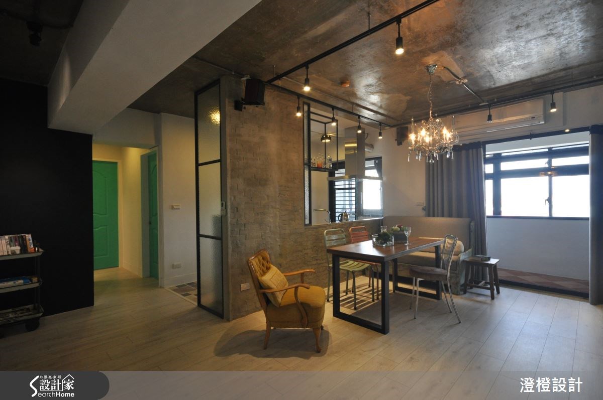 设计师将墙纸拆除,刻意保留原始质朴的水泥材质,打造出粗犷的Loft居家感,同时,将屋主收藏的老件家具融入空间中,并在各角落融入专属记忆,比如有着留学回忆的玻璃砖、充满趣意的卫浴设计,都不禁让人想起那年青春的好时光。【用居宅设计唤醒那年的青春记忆】走进屋宅前,可先见到宛如学生宿舍般的造型门片,并呈现大海般的蓝绿色彩,搭配木质铺陈玄关地坪,唤醒来访者那年夏季的青春记忆,同时以马赛克砖妆点地面,一旁配置不落地的白色鞋柜,让玄关更显轻盈活泼。【用空间色彩调配清新空间调性】进入客厅,电视背景墙延续了清新蓝绿色调,成为灰色水泥空间中醒目的色彩,而桌椅与视听柜皆释放出浓郁的复古风情,天花板则以轨道灯形成框架,中央悬吊水晶灯,呈现低调华丽的气息,并在客厅挖空一面墙,让视线可穿透至厨房区域,整体空间显得更具延伸性。以横梁切分出客、餐厅领域,并以一面白色格状镜面墙作为餐厅的焦点,不仅营造出扩容放大的效果,更透过此墙还原屋主在国外留学的记忆,在简单木餐桌、餐椅的陈设下,颇具放松的度假气息!