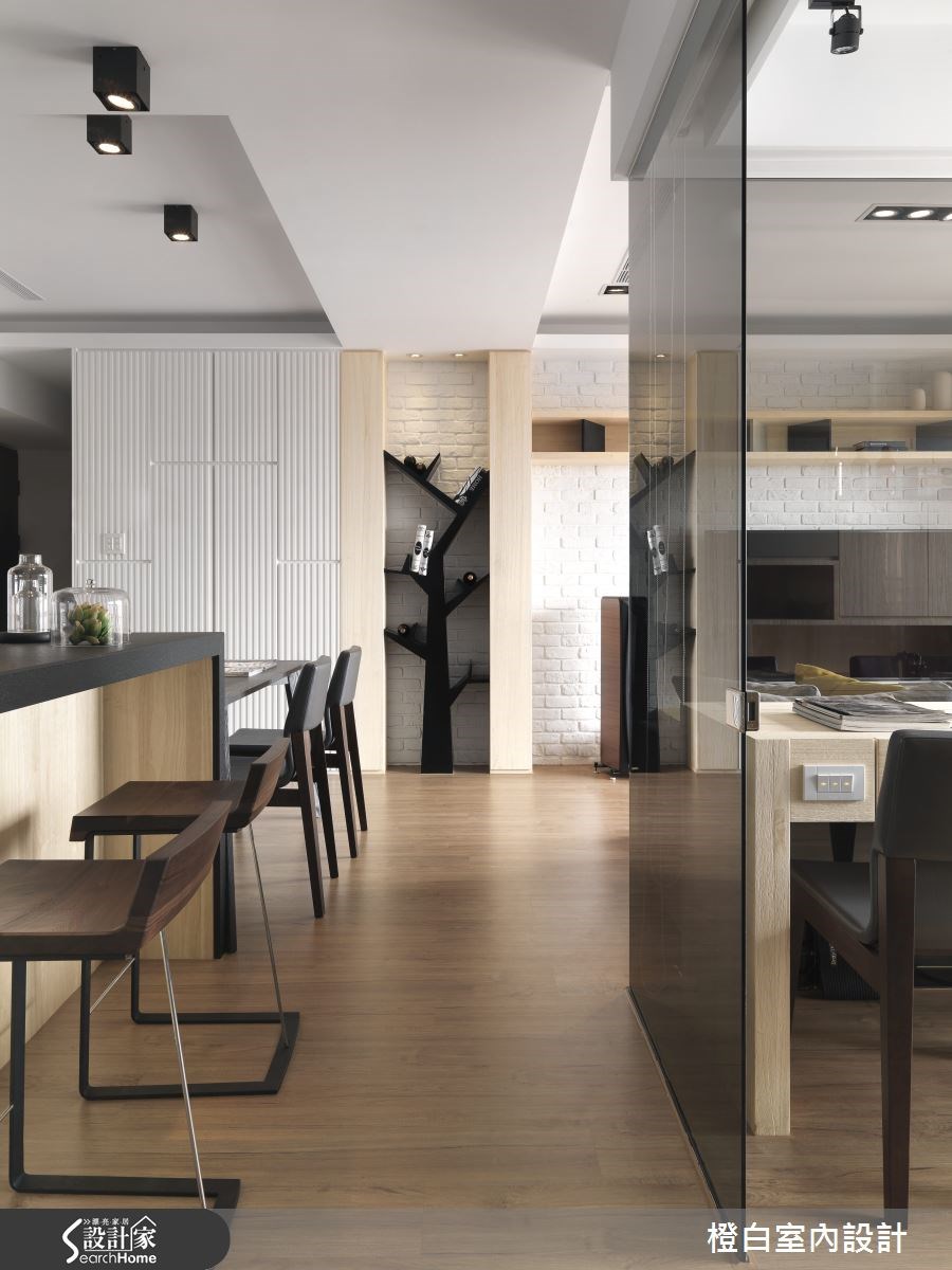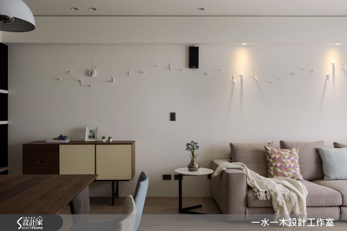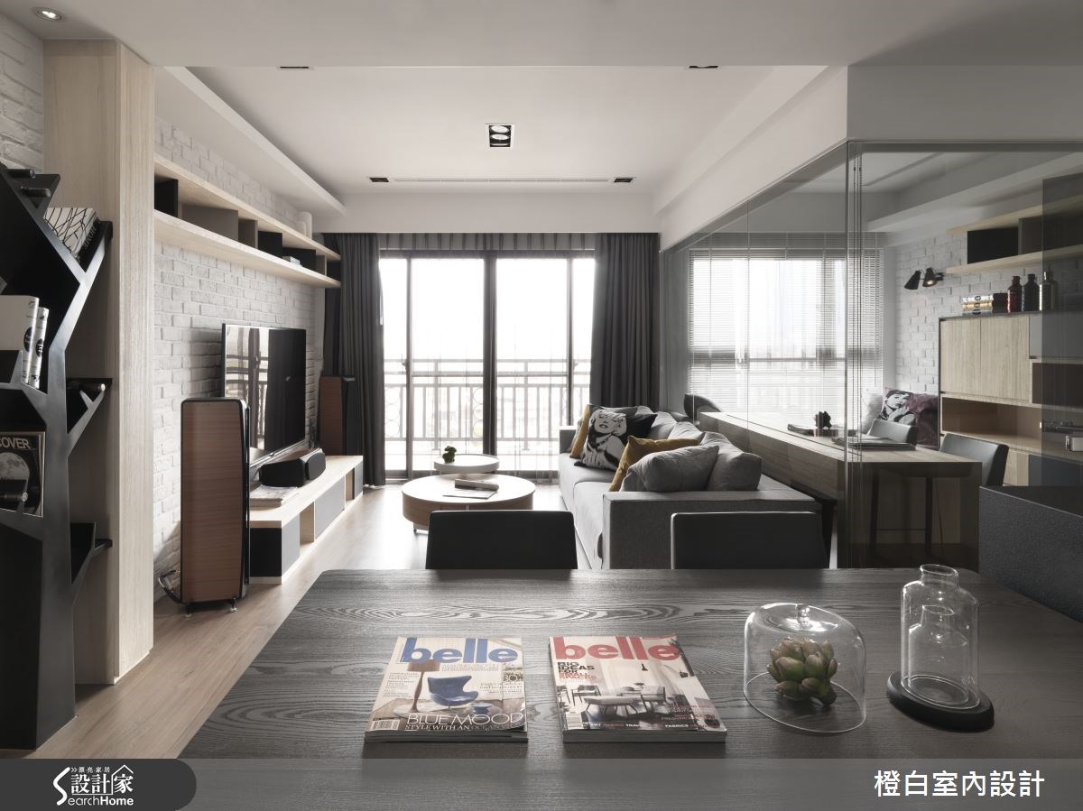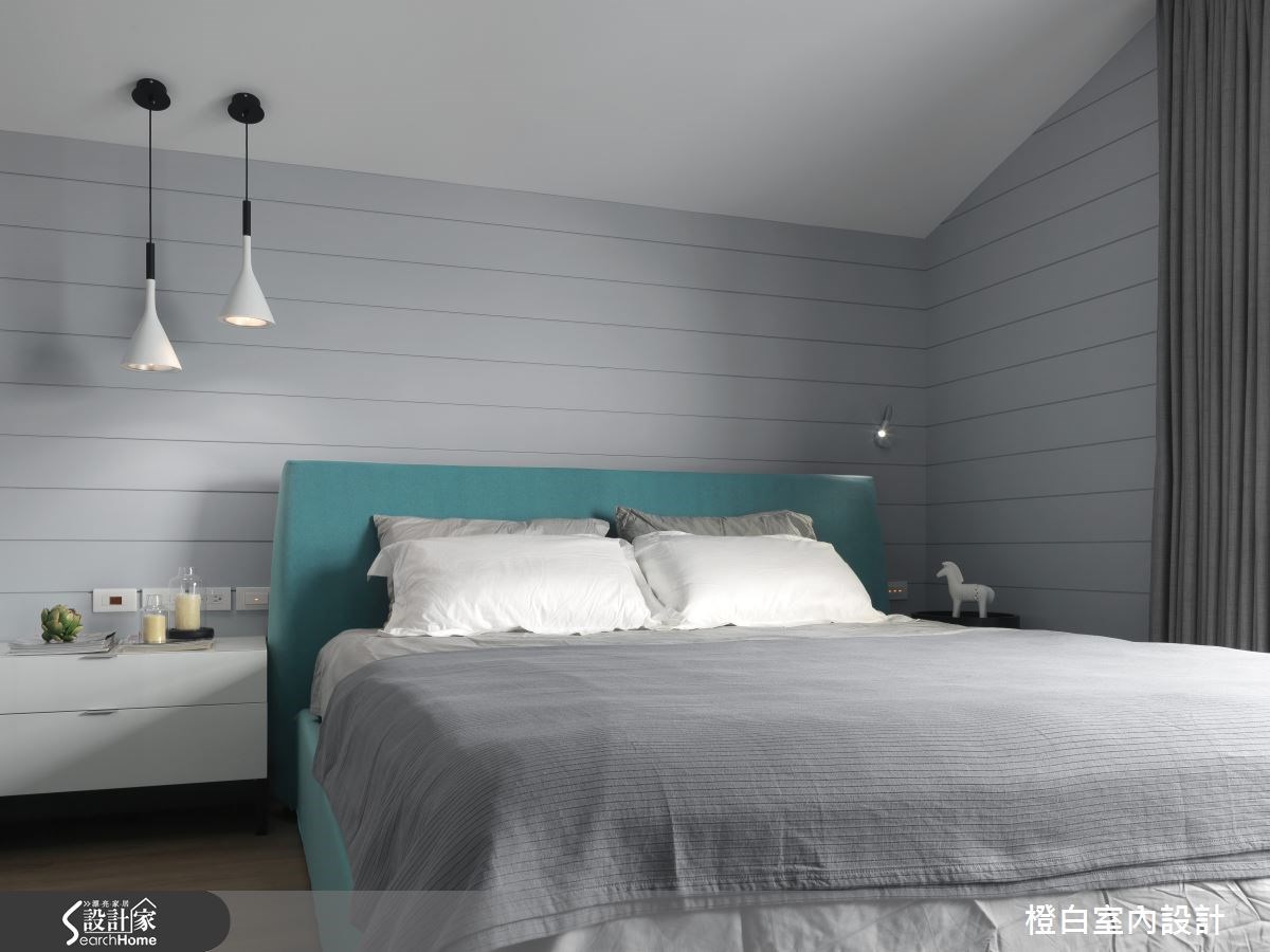 新婚的屋主夫妻买下这间新成屋,透过温润的梧桐木钢刷木皮、粗犷的白色文化石等材质的互补性格,带给屋宅融洽情感。由于房屋位于高楼层,具有通风及采光的优势,搭配简洁线条刻划纾压氛围,让夫妻俩拥有简单的生活态度。【浅色调铺陈,线条拉出视觉广度】入口处以白色立面结合至展示平台,展现置物机能,并以浅色与直线条拉高立面,创造入门空间的宽广度。客、餐厅采开放格局,让大片落地窗引进的采光流通于全室,无论用餐或宴客,皆能坐拥明亮幸福的氛围。客厅以文化石规划电视墙,上下结合木质视听柜体,利用异材质搭配创造融洽视感。沙发背墙即是客厅与书房的隔断,玻璃材质延伸视线,同时,呼应文化石与木质调的搭配主题,打造一面大容量书柜。一旁飘窗位于充满阳光的靠窗位置,成为疗愈纾压的小天地。 卧房呈斜天花板设计,灰蓝色墙面采横线条设计,拉宽空间幅度,并以绿色床具增添室内彩度,让新婚卧房更具清新甜美的气息,而窗户配置扎实布帘可调节阳光,床头悬吊的两盏灯饰更营造浪漫光晕,带来适合新婚夫妻的甜蜜氛围。