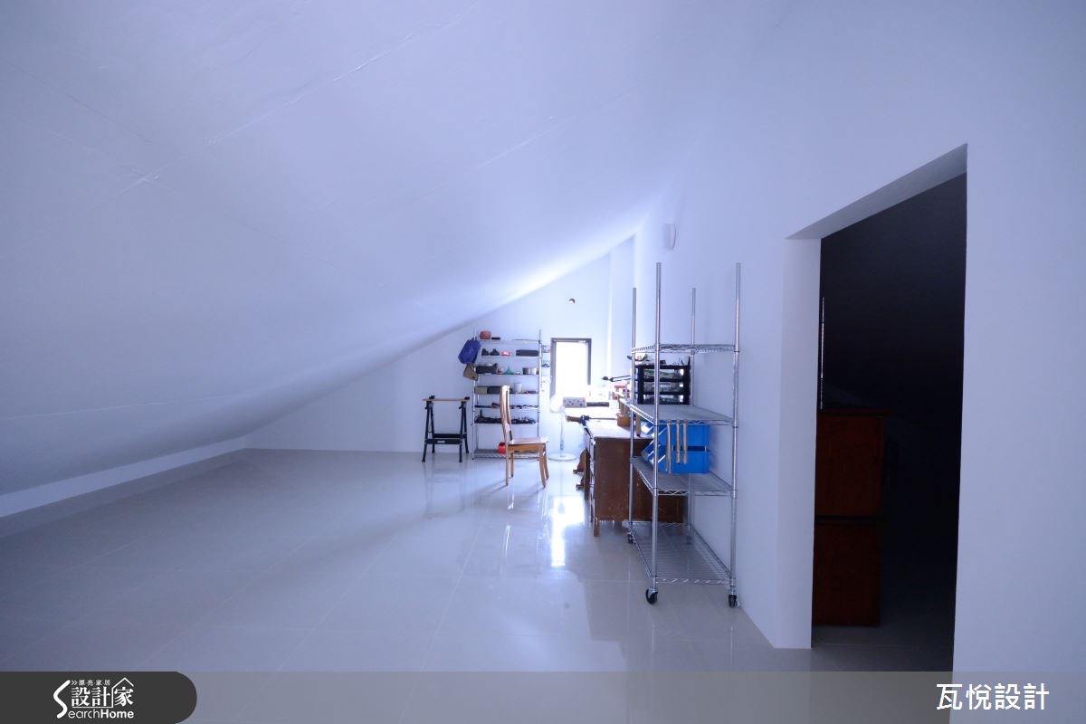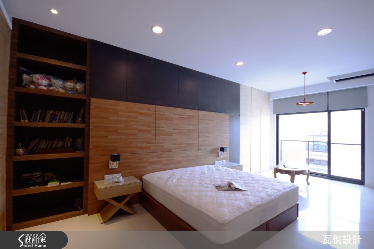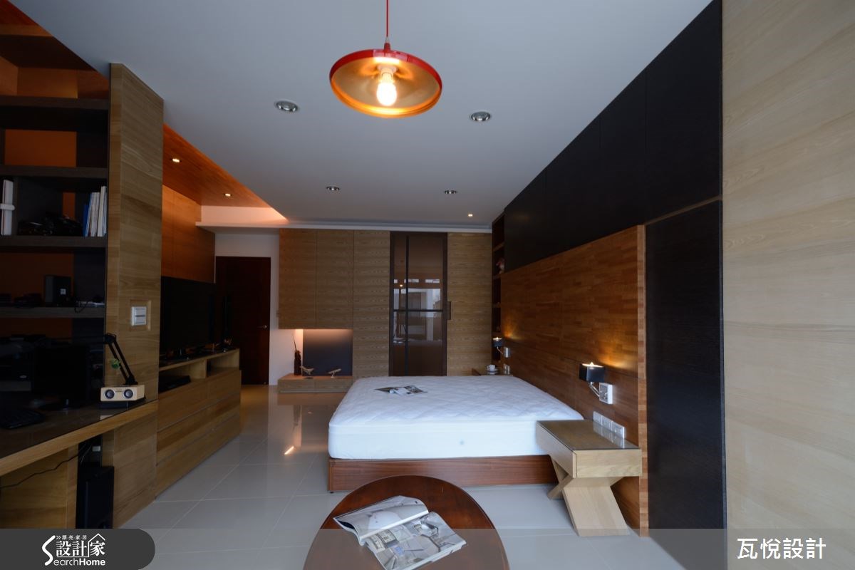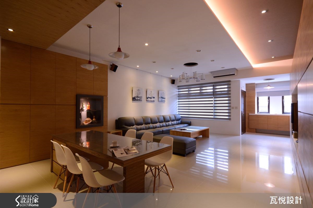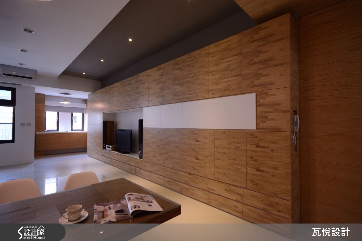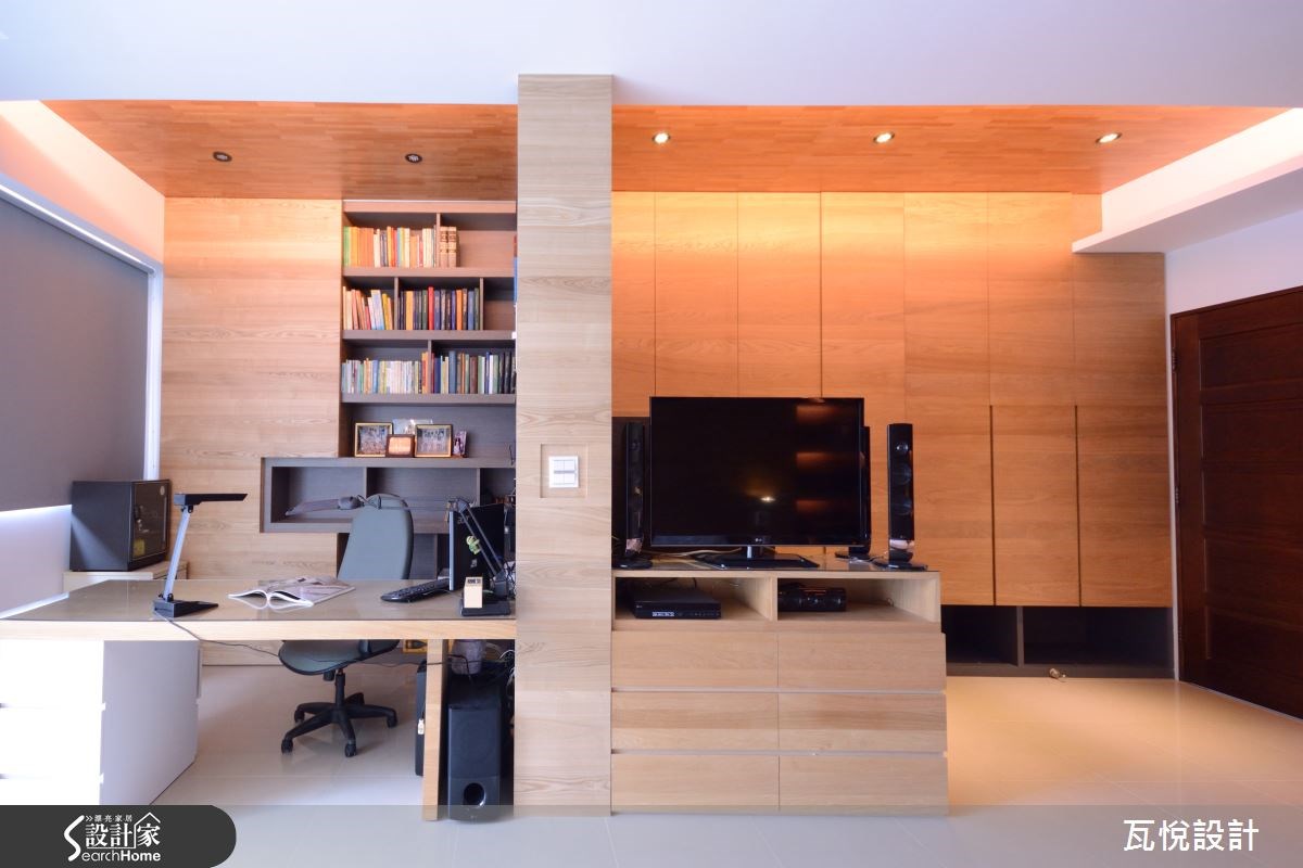 由于屋主希望一回到家可获得全然的身心放松,也期盼拥有充裕的收纳设计。因此设计师以各式木皮营造温润的空间层次,并保留5室2厅的原始格局,采用简练线条,将收纳隐于无形,打造简约不繁复的现代风格。【沉稳木色,造温润质地】公领域呈开放式格局,大面积的电视墙以集层木皮打造而成,在横向纹理中创造延伸立面,串联起客、餐厅空间,沉稳木色也更显疗愈。天花板配置嵌灯与间接灯光,运用各式光源营造不同的居家氛围。餐厅空间则在木柜设计内凹展示台,搭配光源形成艺术背景,并将柜门隐藏其中,让整体格局完整不零碎。二楼主卧切分出休憩、寝卧、书房等机能,床头墙以黑色搭配木质,呼应公领域的配色调性,呈现稳重纾压的睡眠氛围。主卧结合顶天立地的柜体设计,满足大容量的置物需求,并在处配置小圆几为休憩一角。而为让寝卧的使用诉求更明确,将计算机桌与书桌做出区隔,中央设计一面开放式书架,让空间视线得以延伸,使领域各自独立,又可融于一室。