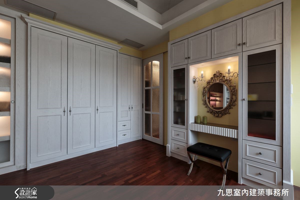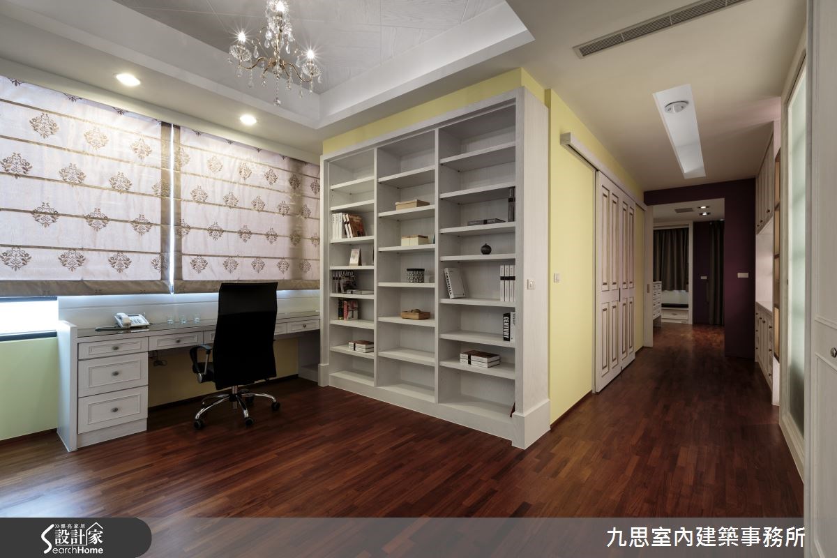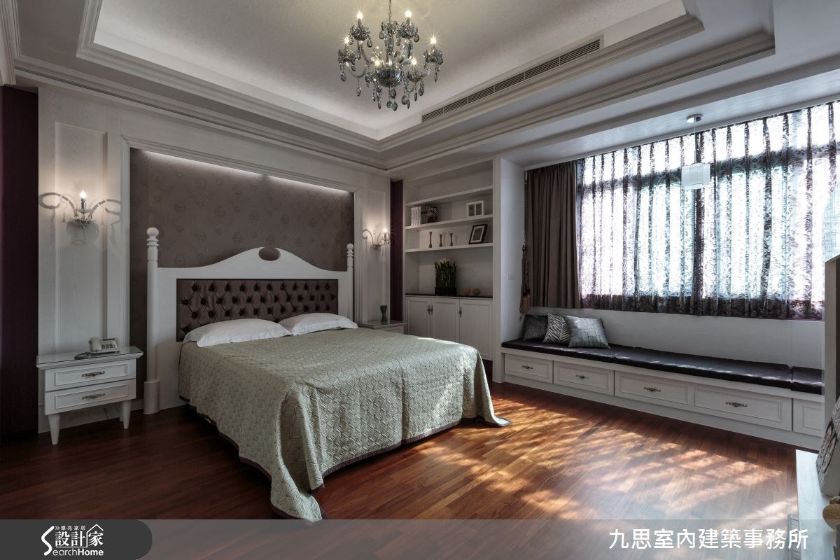 大空间不一定等于大器感,少了美感规划,可能变成华而不实、缺乏个性的空洞环境。本案拥有6室3厅,设计师以白玉兰大理石、黑橄榄大理石等石材修饰,透过完善的比例分配创造风雅的视觉体验,展现轻奢住宅的大器质感。 【深浅色大理石,随光铺陈层次】来到客厅,地面皆采用浅色大理石铺陈,在落地窗采光的映衬下,整体格局更明亮大器。电视墙面以镜面、深浅色大理石、木质等打造而成,在墙面上做出交替的层次;天花线板则让居家更添细腻,延伸整体高度。设计师规划许多艺术品陈列区,比如沙发后方便配置一整排连续柜体,不仅满足收纳机能,内嵌的一道展示平台也呈现艺术造景效果;其中,窗户旁的一座顶天立地展示柜,则透过玻璃及镜面材质注入精致风雅的韵味。此外,以透明移门作为客厅及餐厨之间的隔屏,让两者之间保有弹性,满足多人宴客需求。书房融合了阅读与居住两种功能,可容纳不少书籍的木柜配置于墙面及床头,并连结到一旁书桌,围塑出温润的浅色质感。主卧室则透过对称的床头灯饰、深紫色的床头板与床头绷布,展现精雕细琢的古典感,并搭配整排飘窗,让自然光影可错落在木地板上,呈现一股疗愈放松的气氛。