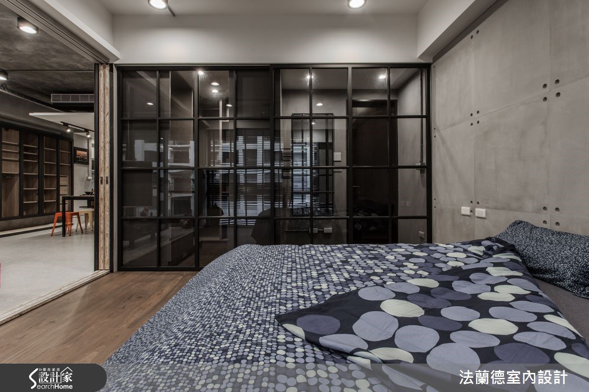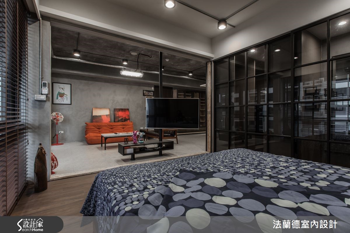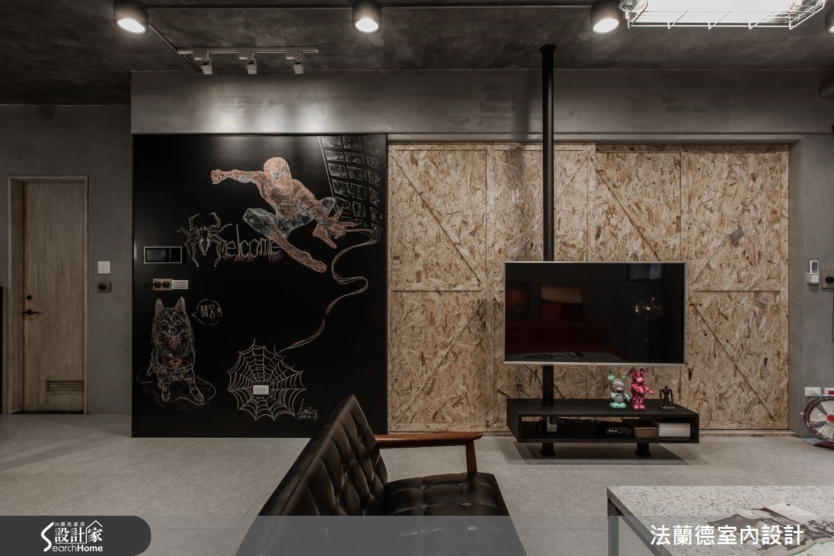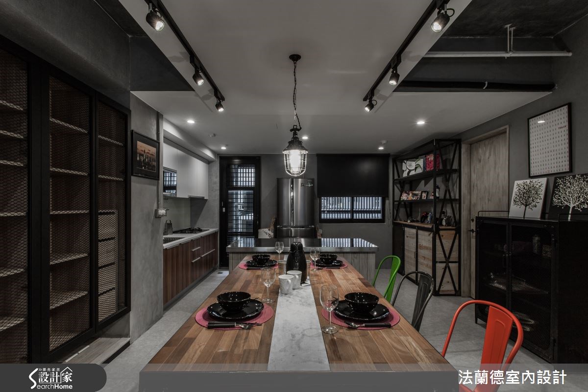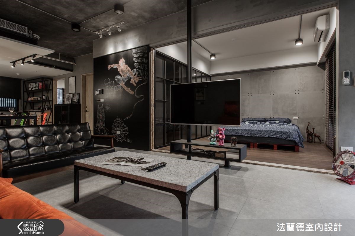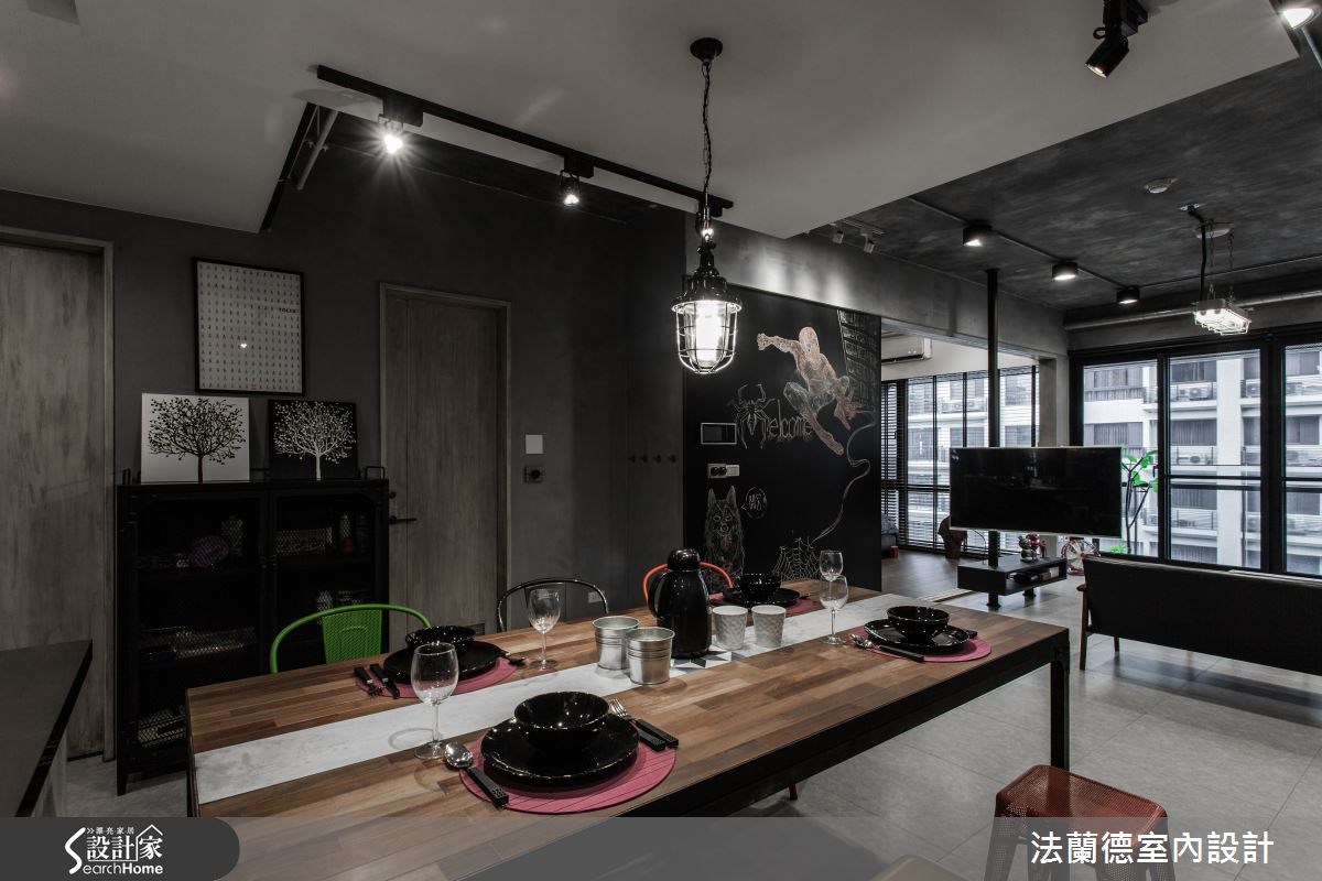 屋主希望将国外留学及蜜月时所体验的工业风带入新家,并希望空间流畅无阻碍。然而格局却不符合期待,因此设计师运用客变(客户变更;建设公司在施工阶段依照屋主需求,预先提供变更格局、设备等服务),将三室改为两室两厅,藉此释放更多的空间。【亮橘沙发,增添一抹鲜艳视觉】在整体空间的材质运用上,设计师以粉光水泥天花板与雾面灰地砖,呼应工业风的粗犷朴实;而天花板上的冷气管线以银锡包覆,展现时尚与工业风的完美结合。入门就能见到的黑板漆墙,则展现粉笔彩绘的缤纷意象,同时也能当作备忘板使用。客厅鲜橘色的沙发,为冷调的空间增添色彩感与生命力,同时与工业风立扇的复古红相呼应,成为令人吸睛的视觉焦点。客厅与主卧的移门做分隔,让客厅与主卧都能感受到木头温润自然的质感。由于屋主相当注重休闲娱乐,除了能360度旋转的电视,餐厨区域也特地改为开放设计,以铁丝网与组合柜结合,铺陈浓浓的工业感。而木头混搭花砖的餐桌搭配上多色的铁椅,让用餐时光增添不少趣味性。