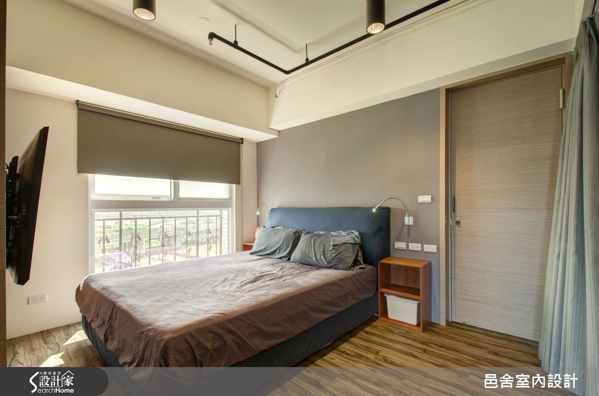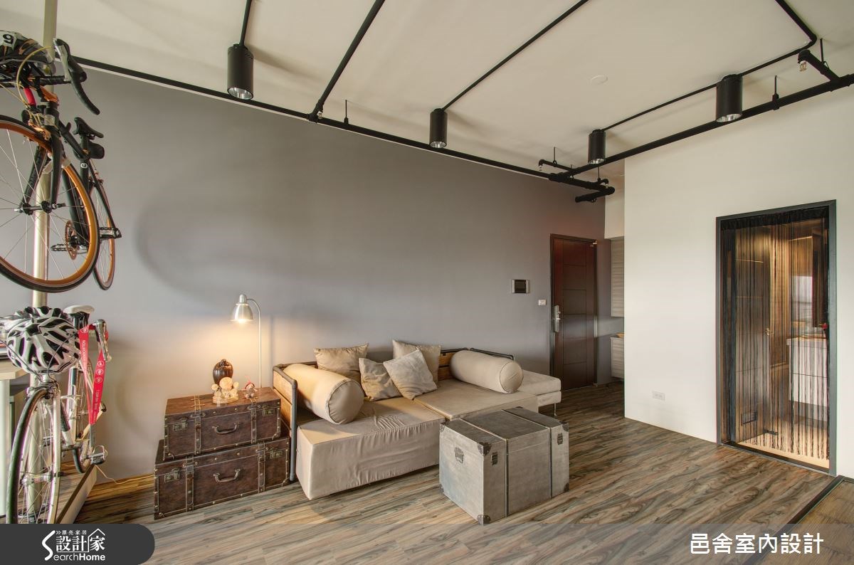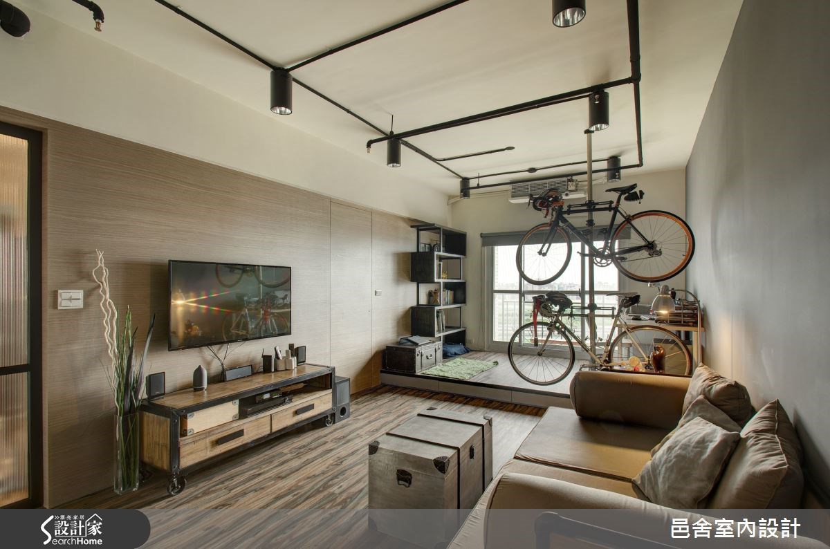 本案屋主对于生活质感追求独到的个人品味,同时希望居家空间能够融合休闲兴趣与生活节奏来打造。因此,本案在整体格局规划上也突破一般多室多厅或整间小户型式的传统概念,而以1室2厅的形式来区隔公私领域,同时也满足屋主对于生活机能的需求。【符合生活节奏的规划设计】公共区域主要分为客厅区与餐厨区。客厅区域又以地板高低差区分出前后两块区域,靠近落地窗的架高地板区不被传统机能框架定义,设计师在这里安排一座展示隔板、一张大木桌,要在此处阅读、伸展、午睡,甚至只是发呆享受阳光,都很美好。而中段的沙发区则安排了电视墙面,满足视听娱乐需求。两段区域之间并以脚踏车架作为区隔,不但满足了停放脚踏车的机能考量,同时也让屋主的爱车成为空间的风景。餐厨区则依照屋主的收纳需求,安排了容量充足的餐柜,搭配一张质感厚实的深色木桌,以及Loft感的悬吊灯具,让整体风格更加时尚有型。卧室的部分则整合了视听、卫浴及更衣室机能,并且以拉帘来区隔睡眠区与更衣收纳区,让空间的使用弹性更加灵活自在。