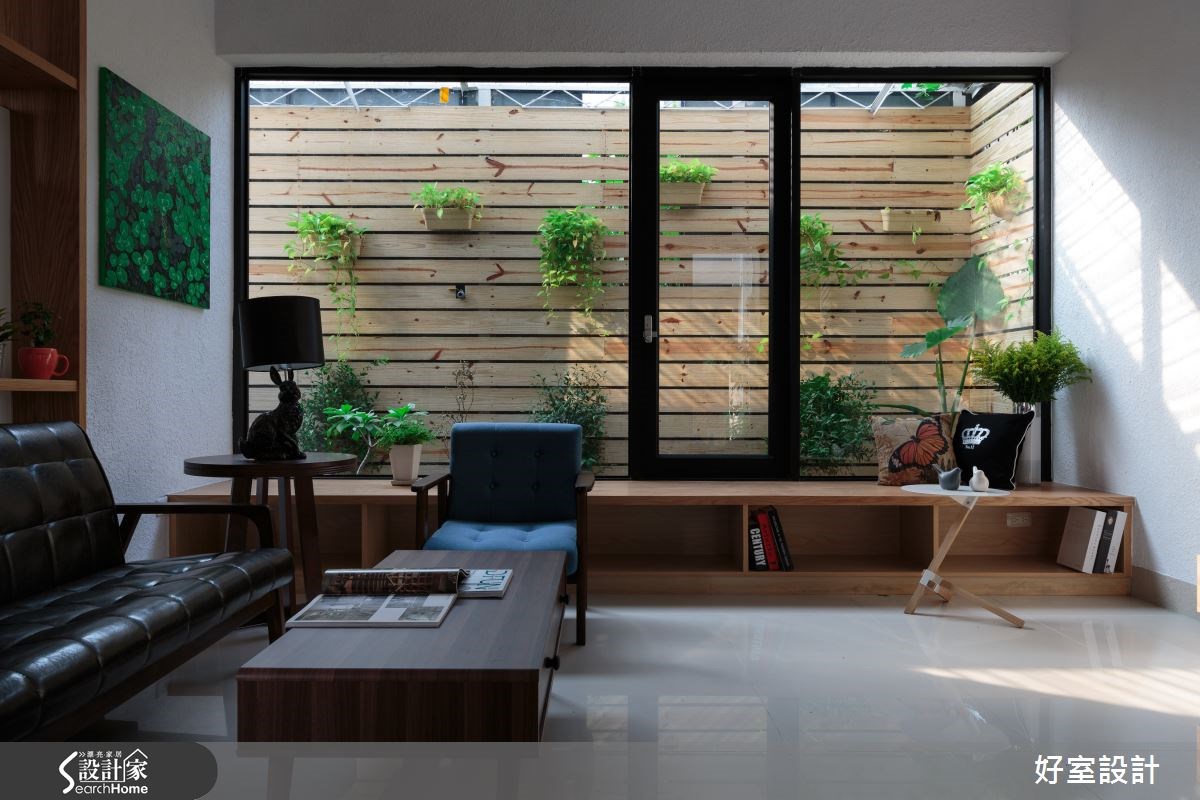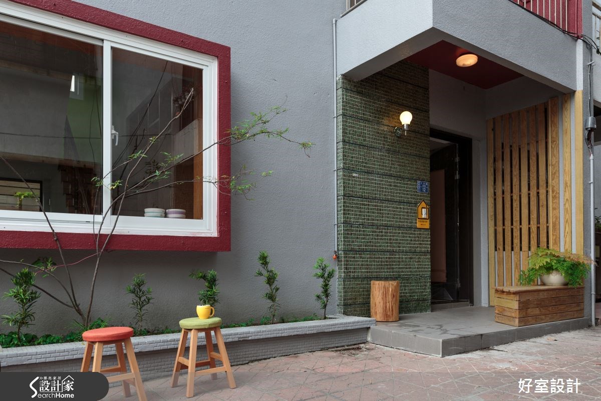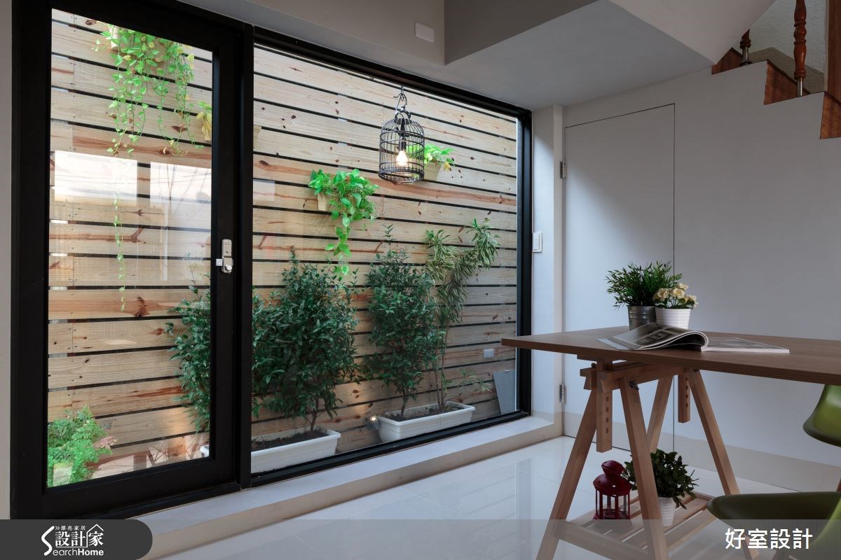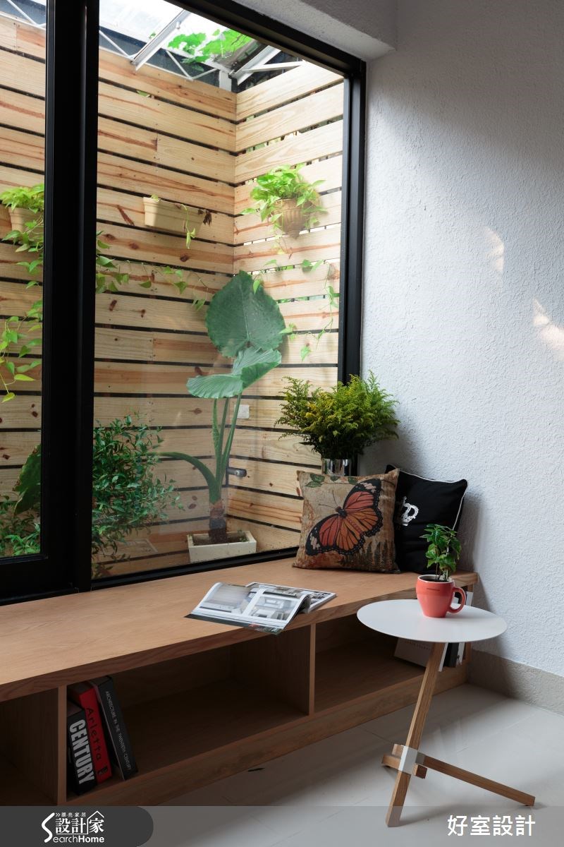 这户40多年的老屋,伴随在地风景成长许久,然而如今日渐老去、人去楼空,不仅室内狭小不通风,屋后还有一条脏乱阴暗的狭小巷弄。设计师重新调整格局,还原明亮采光,赋予老屋全新生命。 【拆除外墙,引入植栽和丰沛采光】先将屋后的墙面拆除,让狭窄巷弄瞬间成为充满绿意的实木阳台,并配置清玻璃落地窗,随时可欣赏到户外植栽景象。而在室内空间里,则以楼梯为中心,划分为客厅和餐厅领域,空间上不做过多的设计,仅以陈列家具来界定使用主题。楼梯与展示架结合,成为通透感十足的置物平台,并在客厅靠窗底下设计整排柜体,兼具飘窗与书柜功能,成为家人共享的阅读场所。来到另一端的餐厅,则在中央简单放置一张木质餐桌,前后皆可感受到丰沛的采光,并将窗景自然纳入为用餐时的美丽视野。二楼卧室以木地板铺陈空间,仅以一张素雅的木床回归休憩本质;室外阳台区以红色规划出古朴的墙面色调,与木色板凳、鲜绿盆栽相映成美好画面。设计师在卫浴也注入小巧思,于墙面底部内嵌一个玻璃鱼缸,让绿色水草与优游的鱼成为空间中的美好装饰。