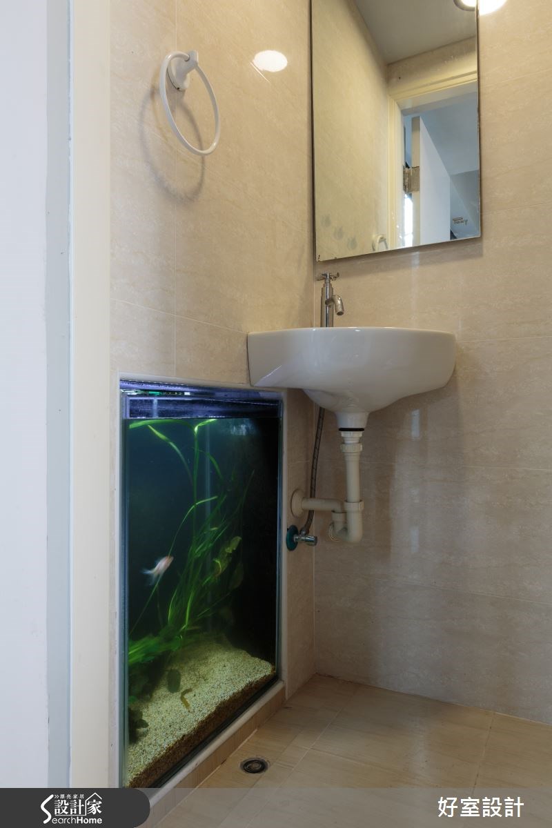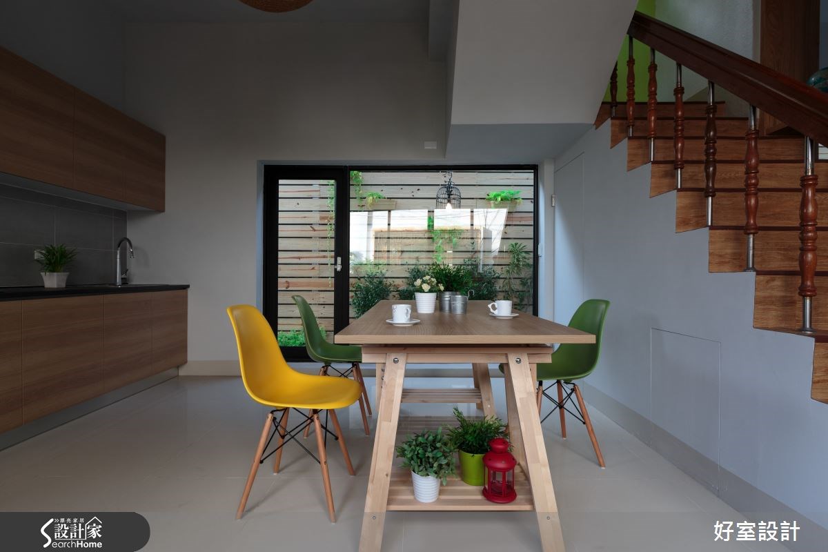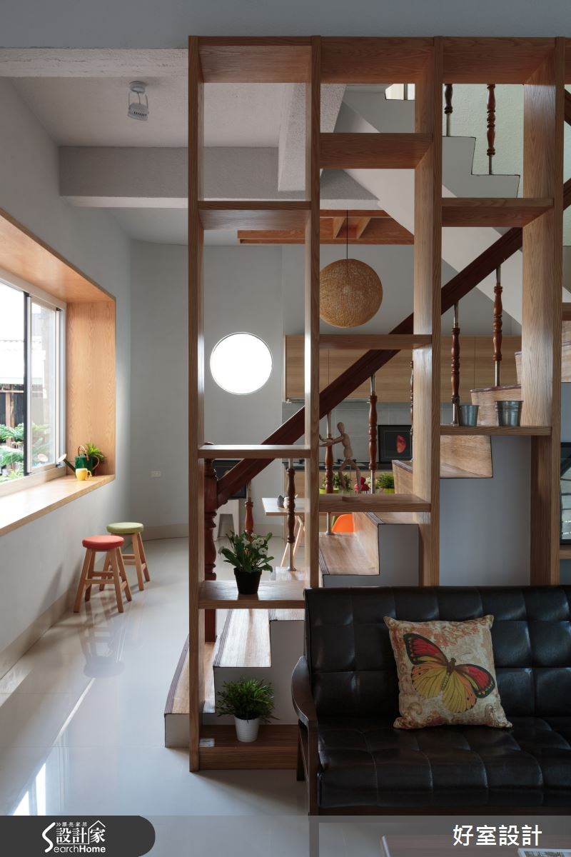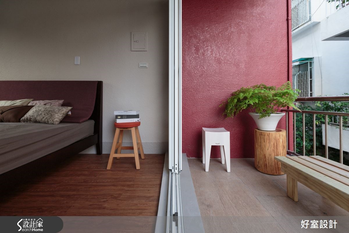 这户40多年的老屋,伴随在地风景成长许久,然而如今日渐老去、人去楼空,不仅室内狭小不通风,屋后还有一条脏乱阴暗的狭小巷弄。设计师重新调整格局,还原明亮采光,赋予老屋全新生命。 【拆除外墙,引入植栽和丰沛采光】先将屋后的墙面拆除,让狭窄巷弄瞬间成为充满绿意的实木阳台,并配置清玻璃落地窗,随时可欣赏到户外植栽景象。而在室内空间里,则以楼梯为中心,划分为客厅和餐厅领域,空间上不做过多的设计,仅以陈列家具来界定使用主题。楼梯与展示架结合,成为通透感十足的置物平台,并在客厅靠窗底下设计整排柜体,兼具飘窗与书柜功能,成为家人共享的阅读场所。来到另一端的餐厅,则在中央简单放置一张木质餐桌,前后皆可感受到丰沛的采光,并将窗景自然纳入为用餐时的美丽视野。二楼卧室以木地板铺陈空间,仅以一张素雅的木床回归休憩本质;室外阳台区以红色规划出古朴的墙面色调,与木色板凳、鲜绿盆栽相映成美好画面。设计师在卫浴也注入小巧思,于墙面底部内嵌一个玻璃鱼缸,让绿色水草与优游的鱼成为空间中的美好装饰。